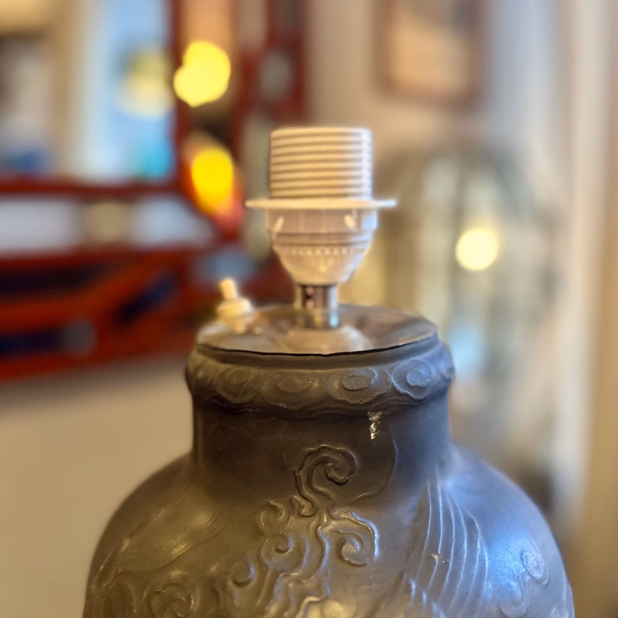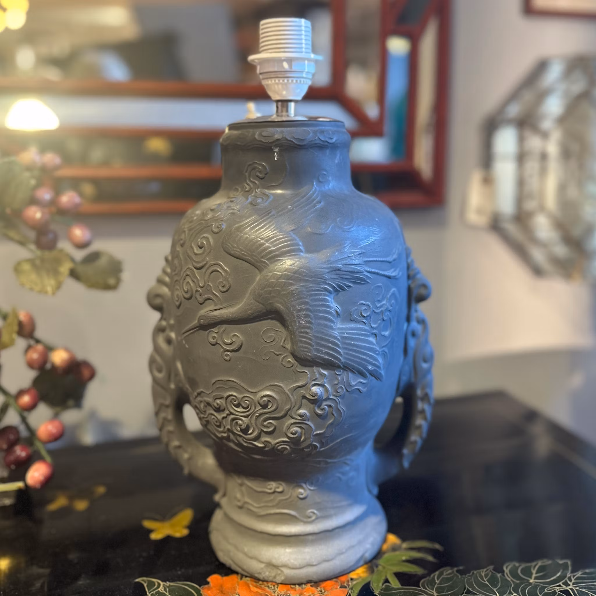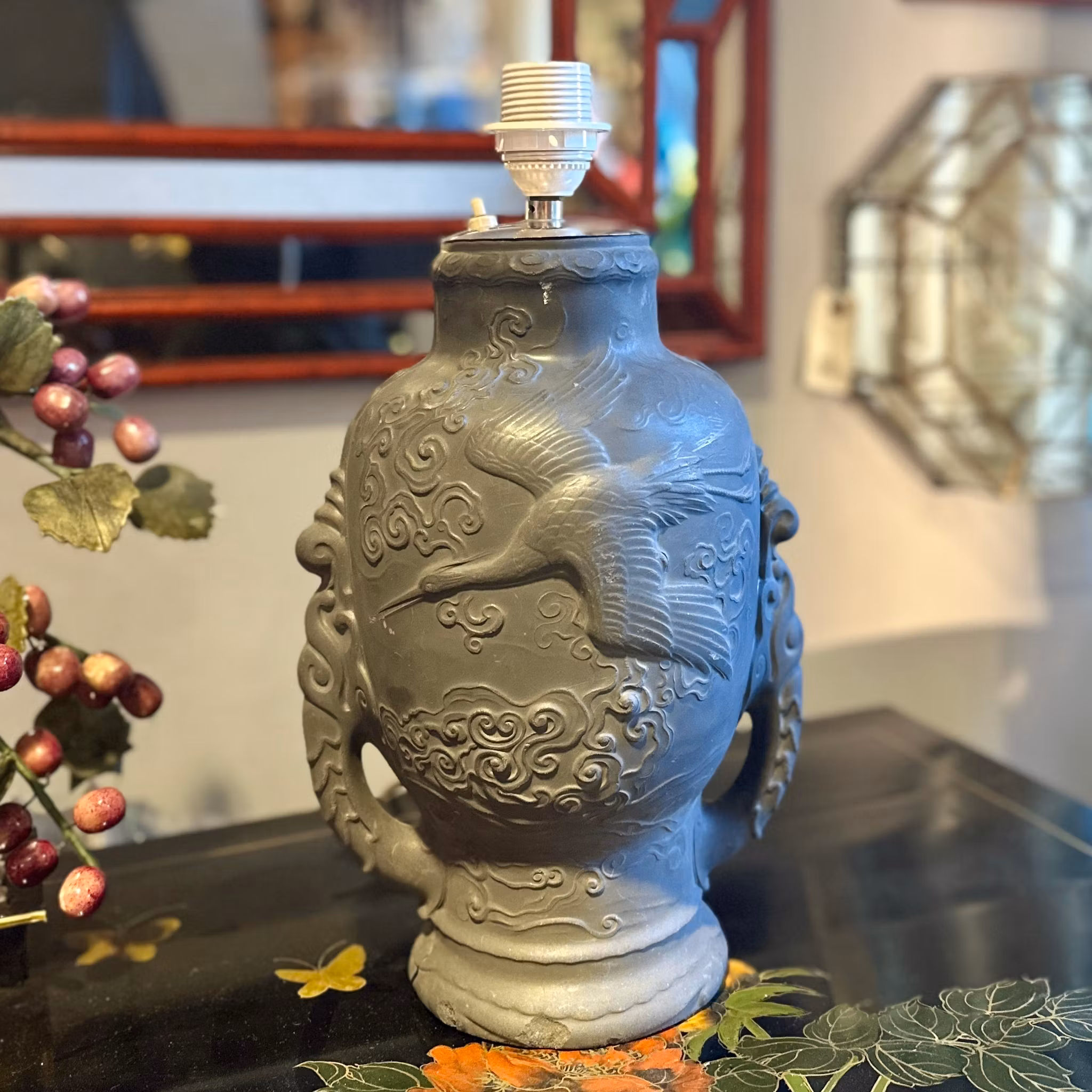 Svart bordslampa i Lavanit med detaljer föreställande elefanthuvuden och tranor. Jugendstil. Höjd: 42 cm, diameter: 22 cm. Bruksslitage samt någon fläck. Skärm ingår.