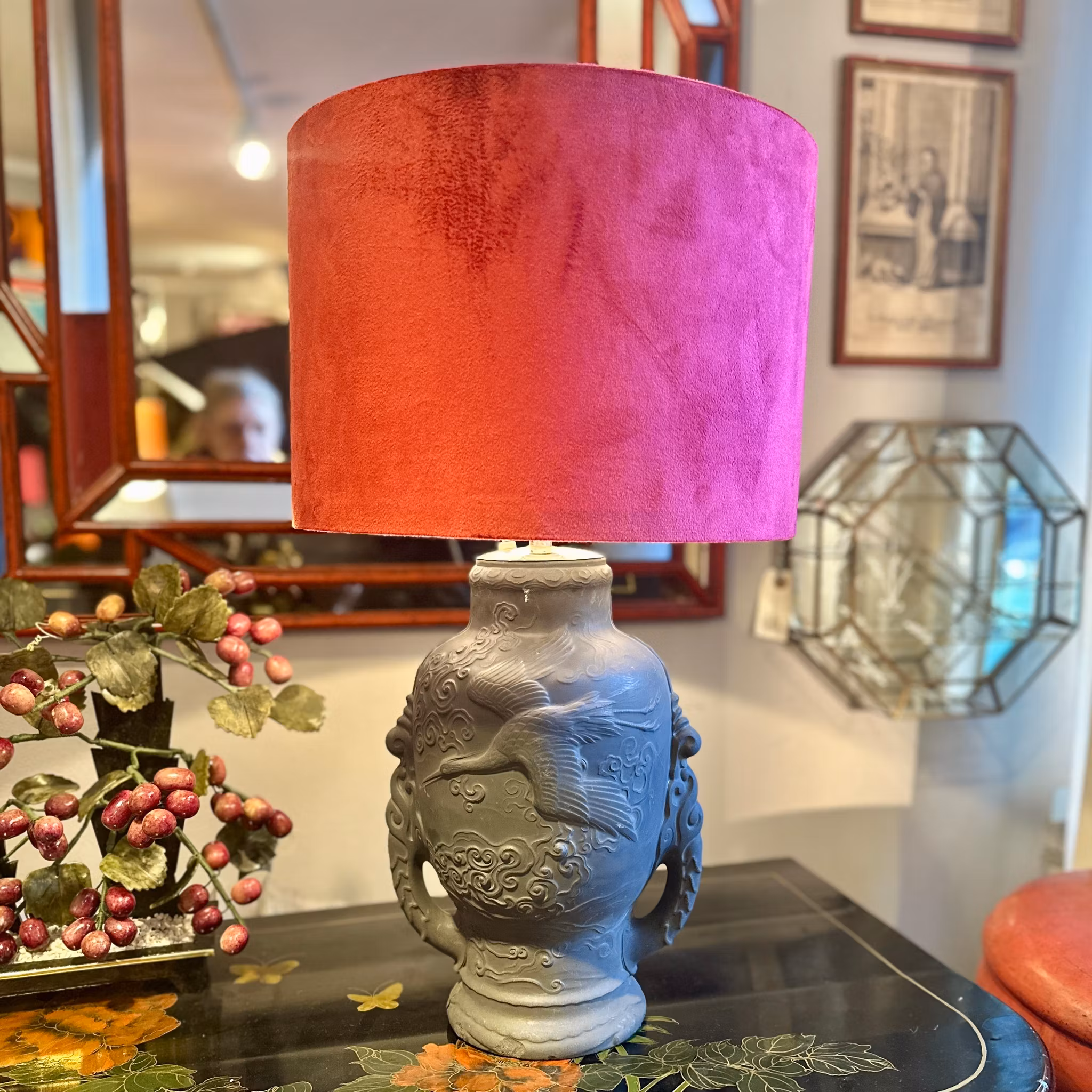 Svart bordslampa i Lavanit med detaljer föreställande elefanthuvuden och tranor. Jugendstil. Höjd: 42 cm, diameter: 22 cm. Bruksslitage samt någon fläck. Skärm