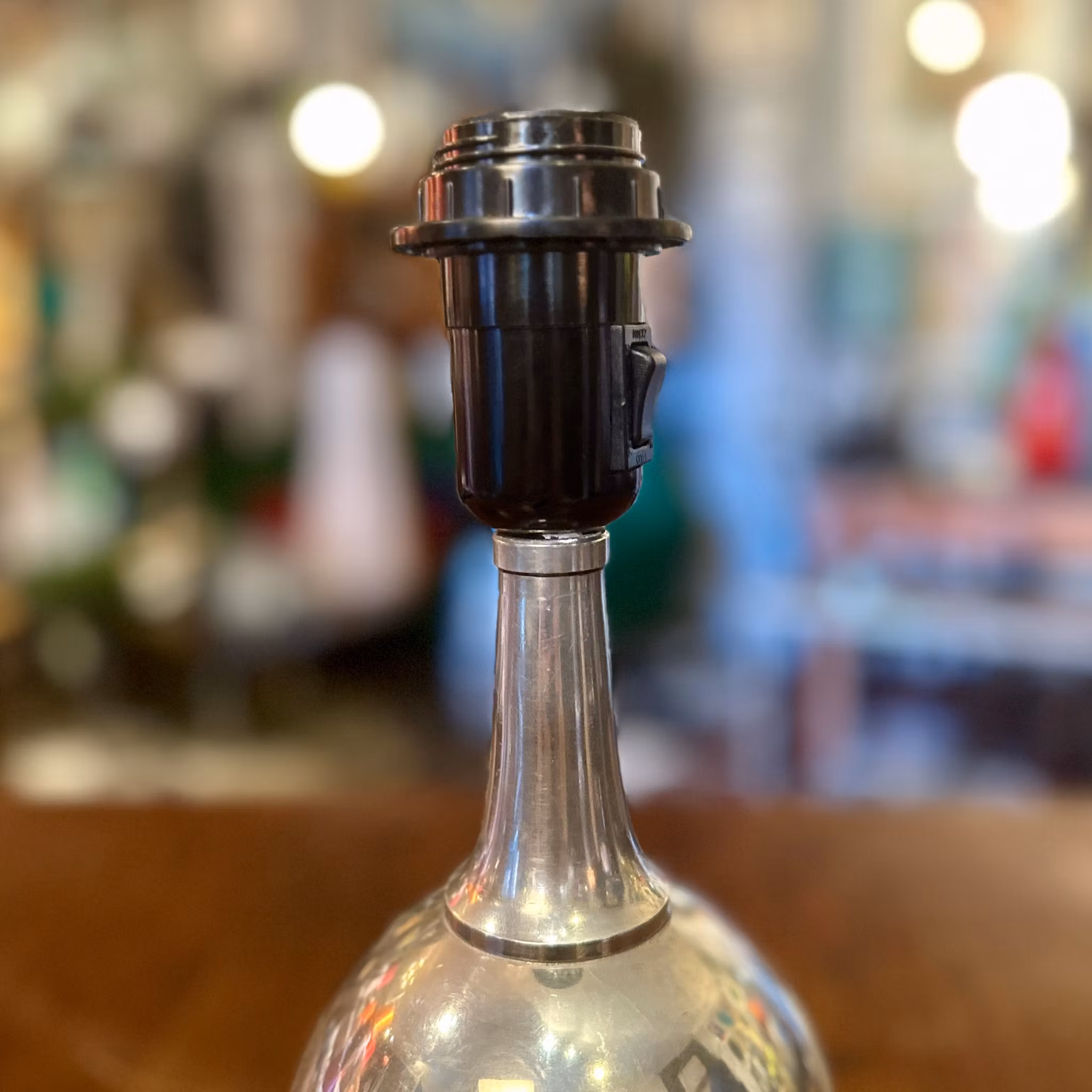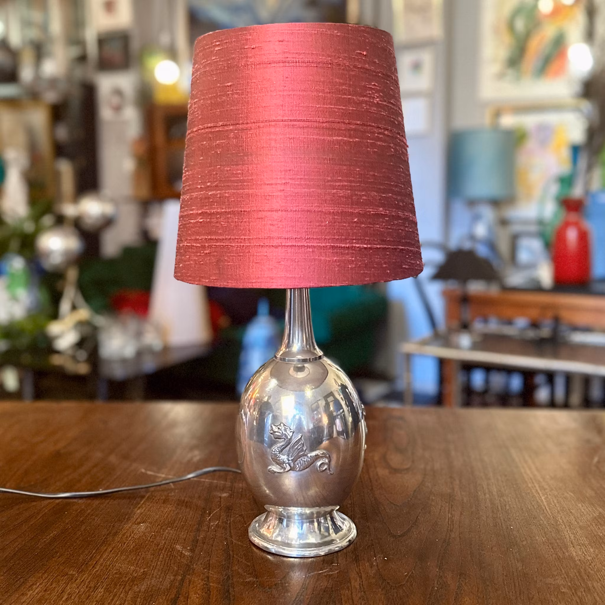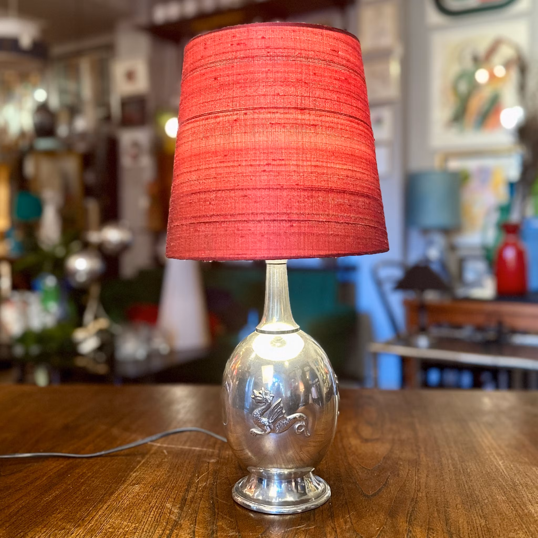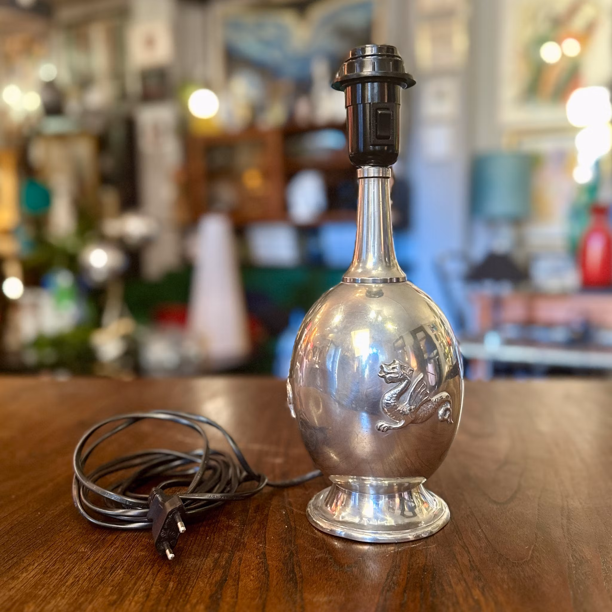 Stilren bordslampa i tenn från 1930-talet med dekorativ drake. Art Deco-design. Höjd: 32 cm. Normalt bruksslitage.Skärm ingår ej.