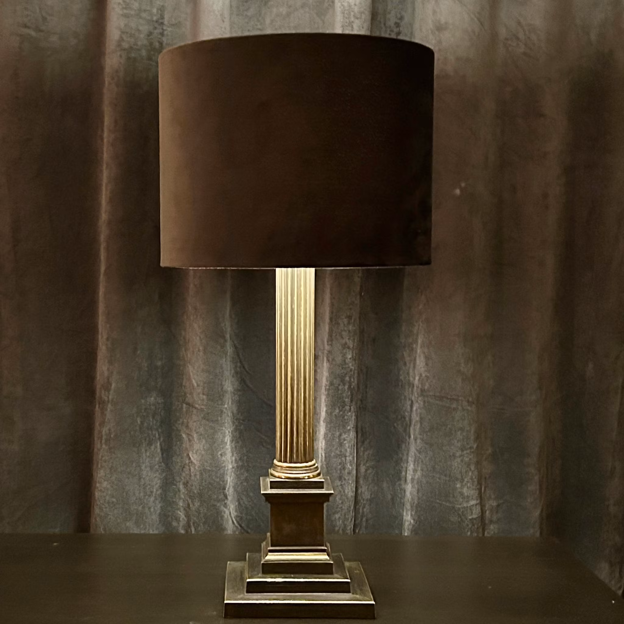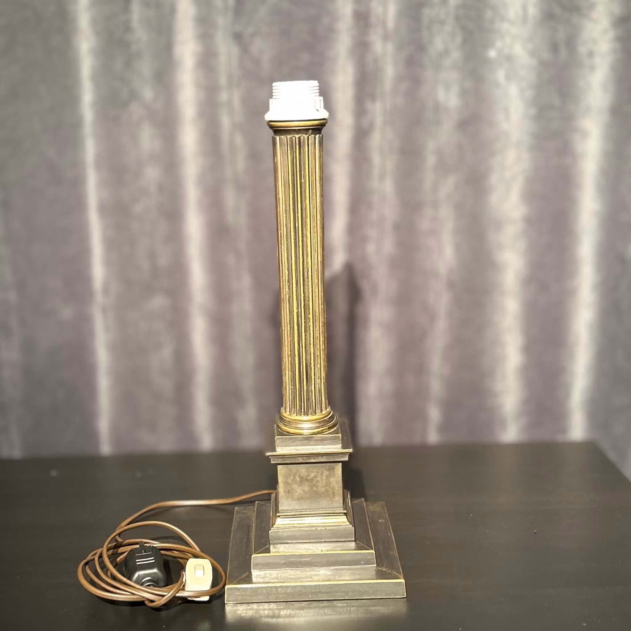 Bordslampa – Patinerad mässing, kolonnformad modell, höjd utan skärm 45 cm. Priset utan skärm. Genomgången el.
