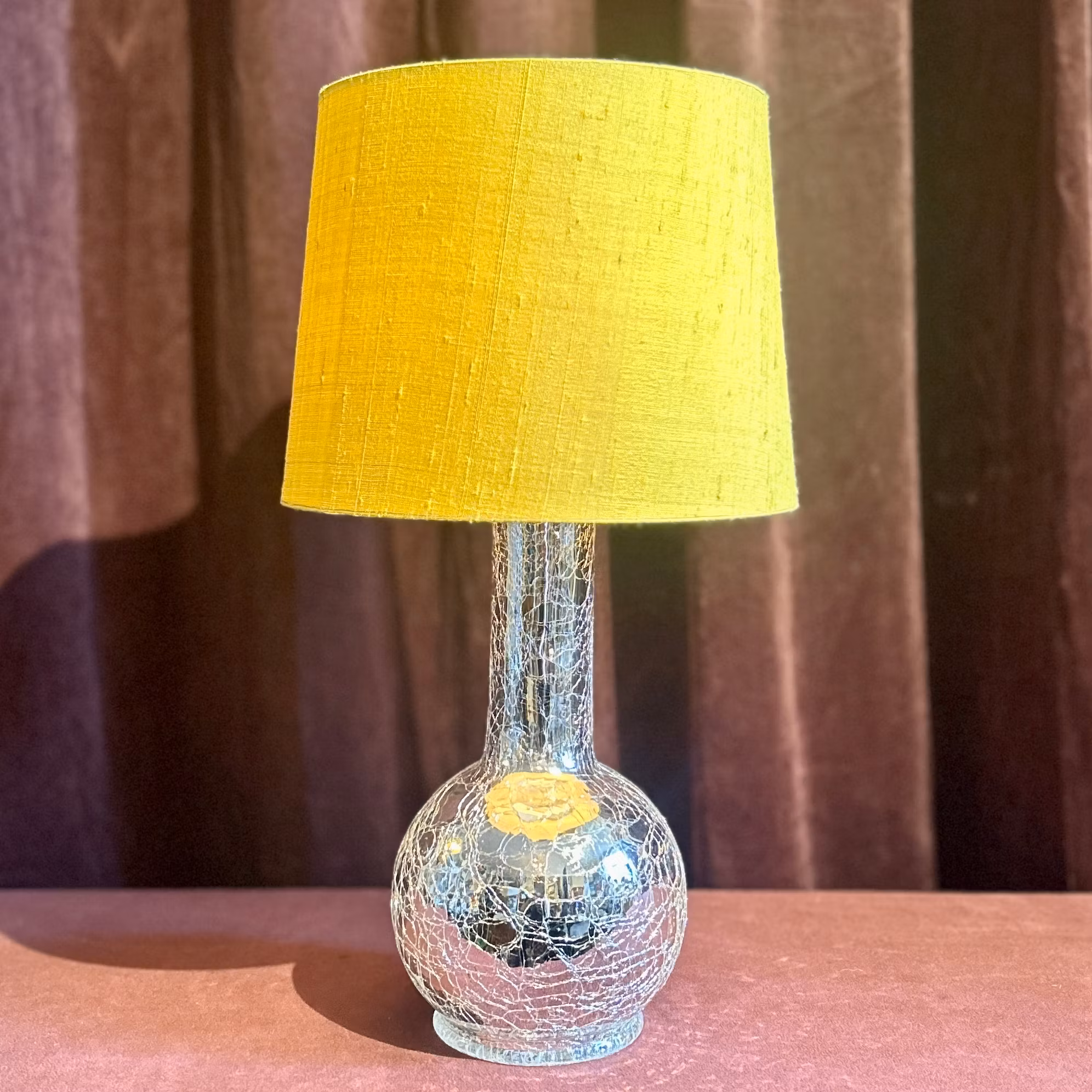 Bordslampfot i glas med silverkrackelring. Luxus inköpt på NK. Höjd utan skärm 37 cm. Pris utan skärm.( På bilden gul thaisidenskärm från Luxus)