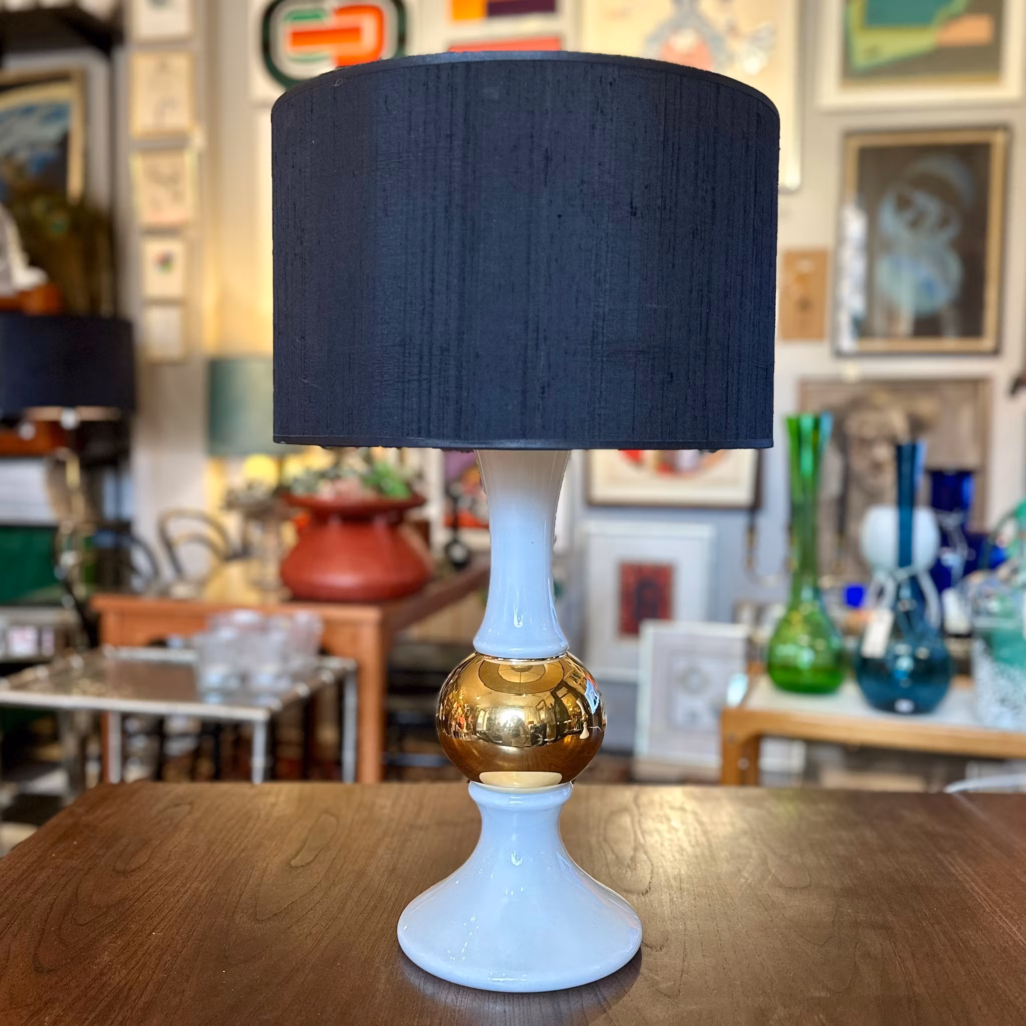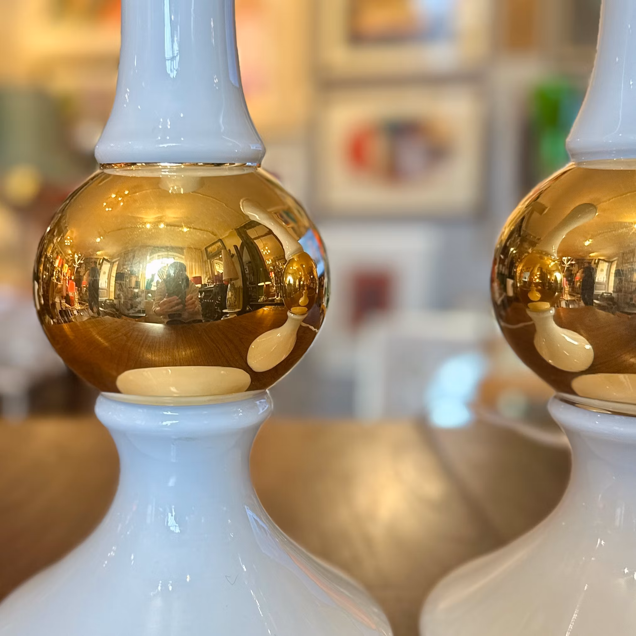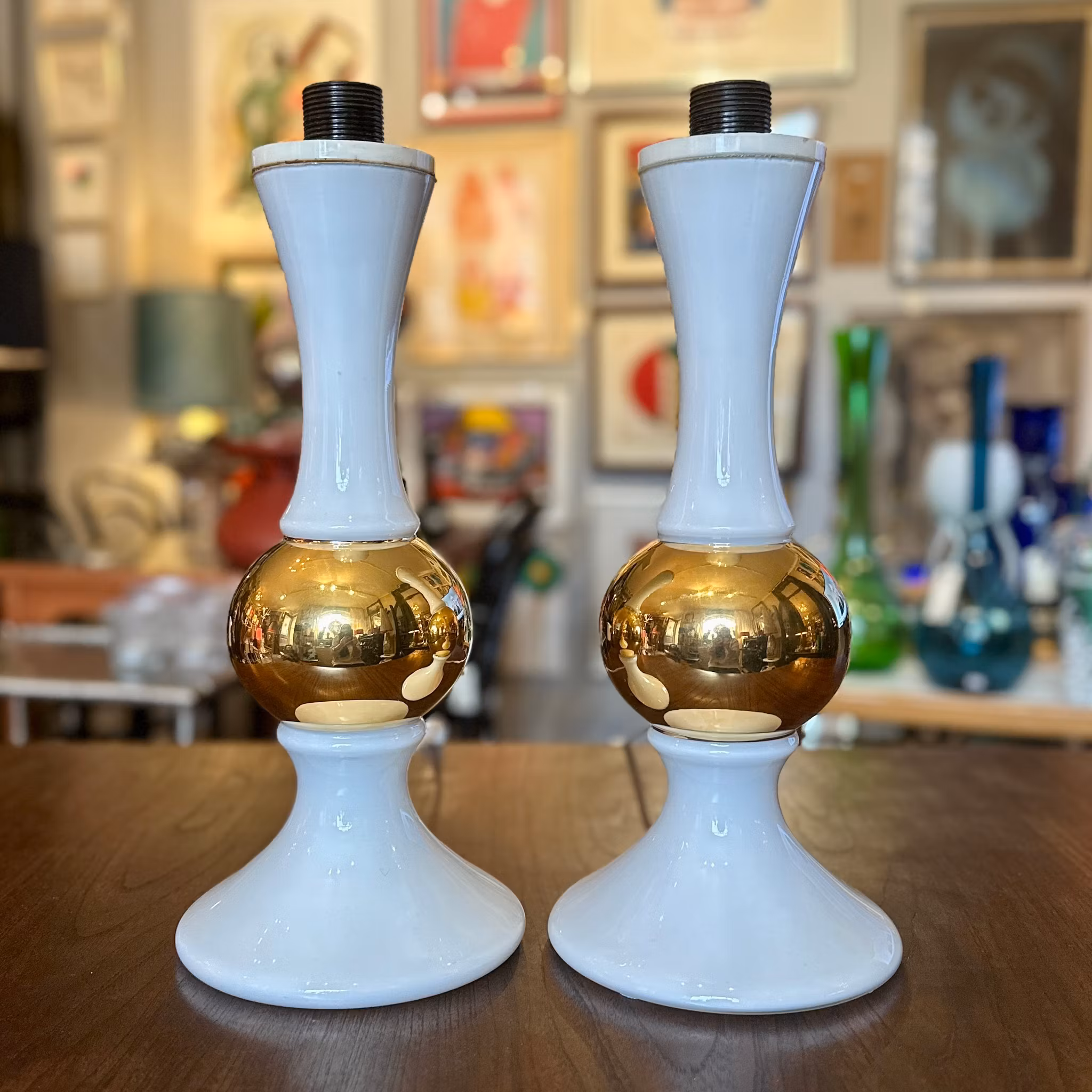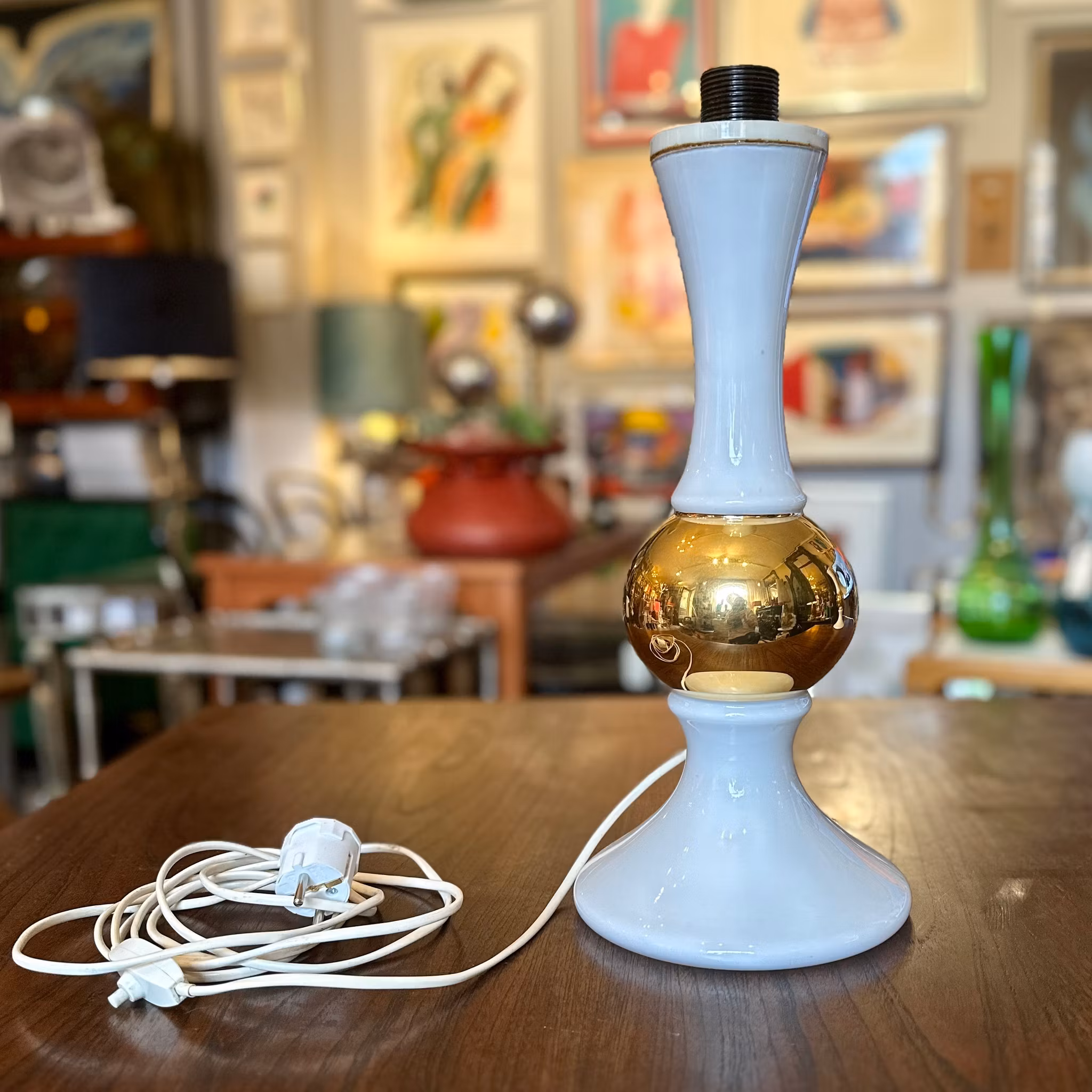 Ett par bordslampor i opalinglas med förgylld kula, designade av Uno och Östen Kristiansson. 1970-tal. Höjd: 48 cm. Bruksslitage.