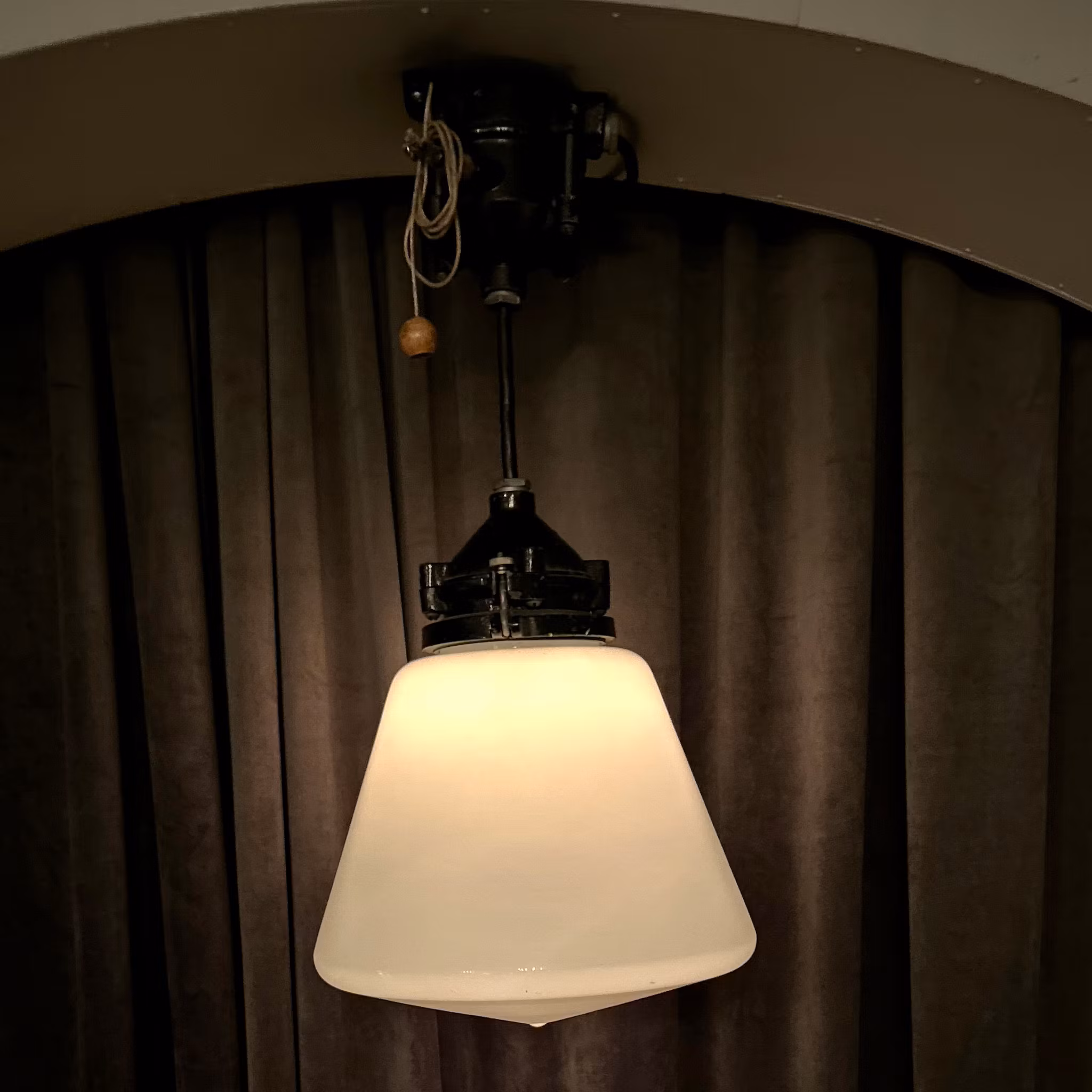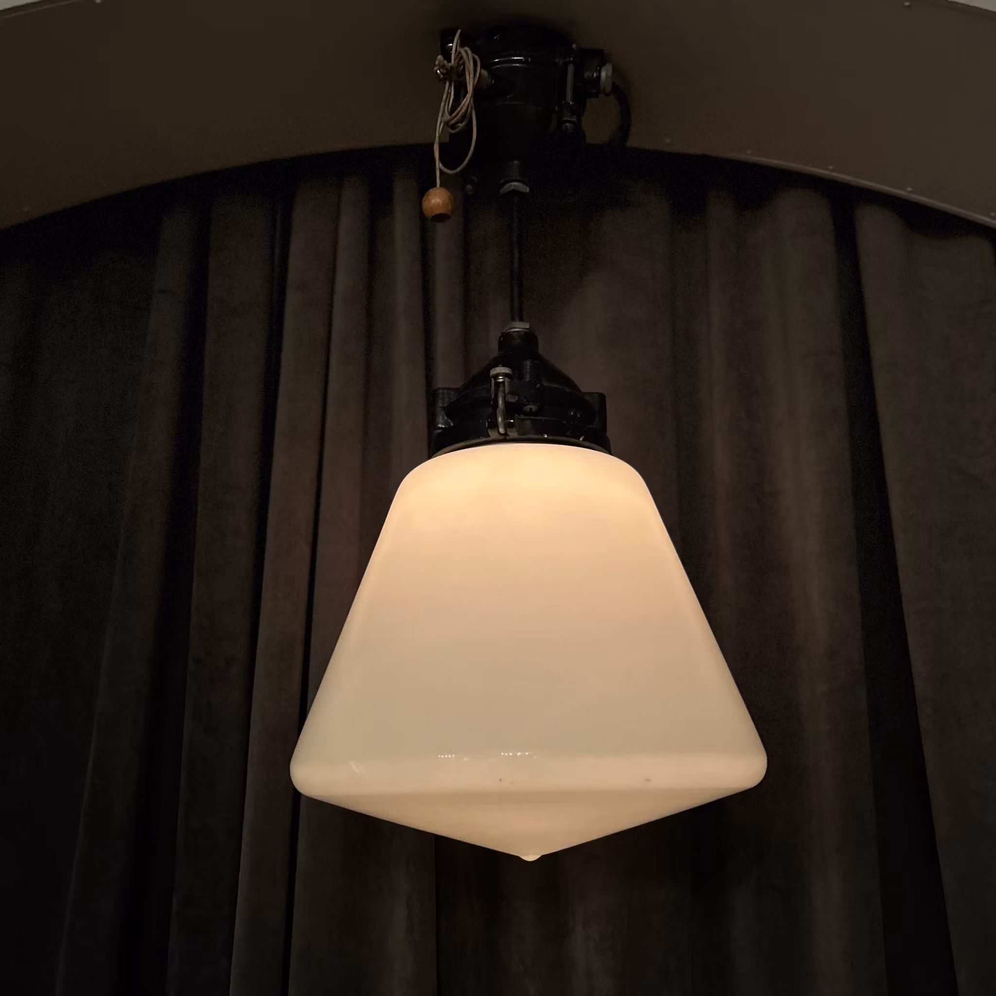 Takarmatur med glaskupa och järnfäste, inspirerad av klassisk industridesign. Höjd: upp till 65 cm.