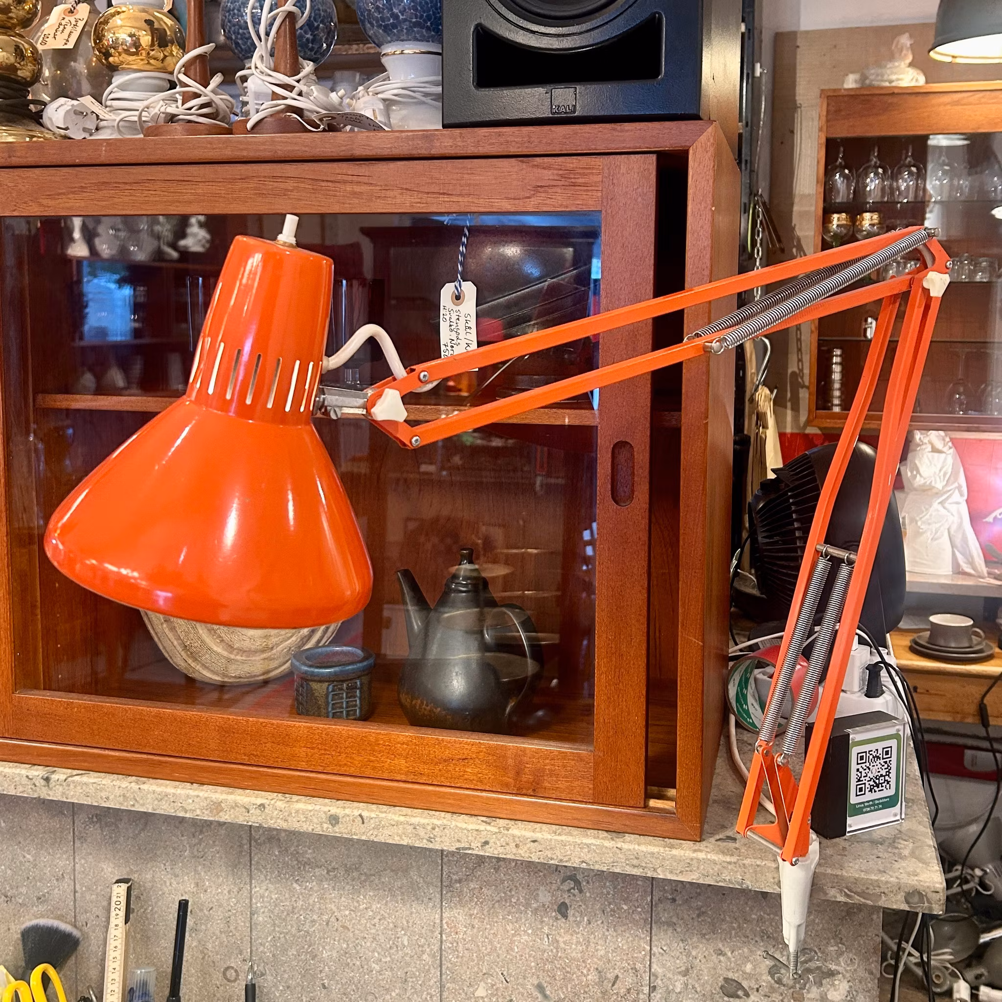 Två oranga skrivbordslampor i retrostil från 1970-talet.