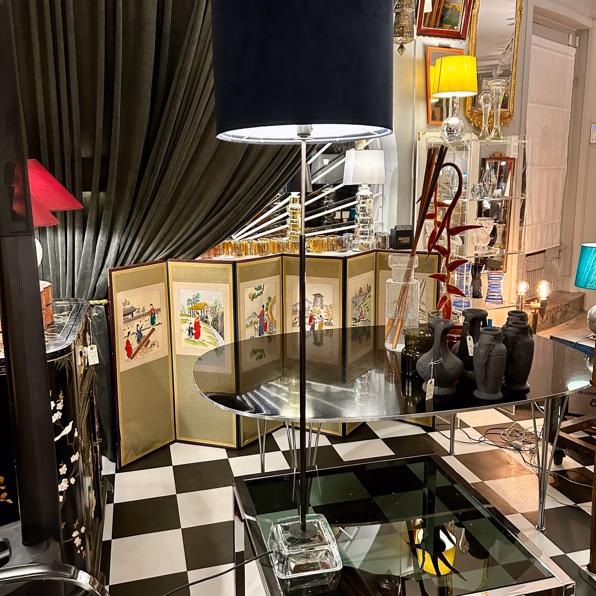 Golvlampa i uplight-modell med glasfot. Höjd: 145 cm.