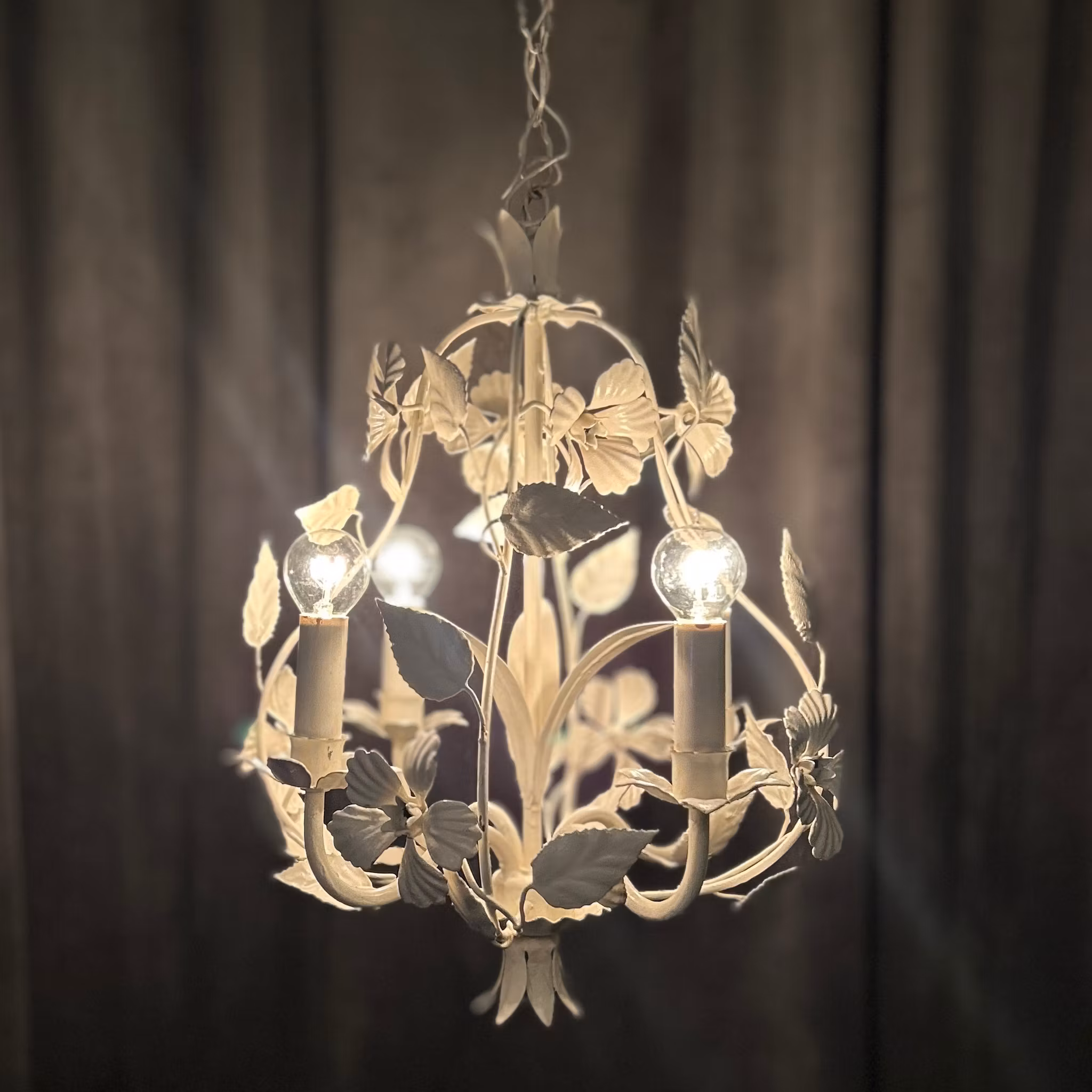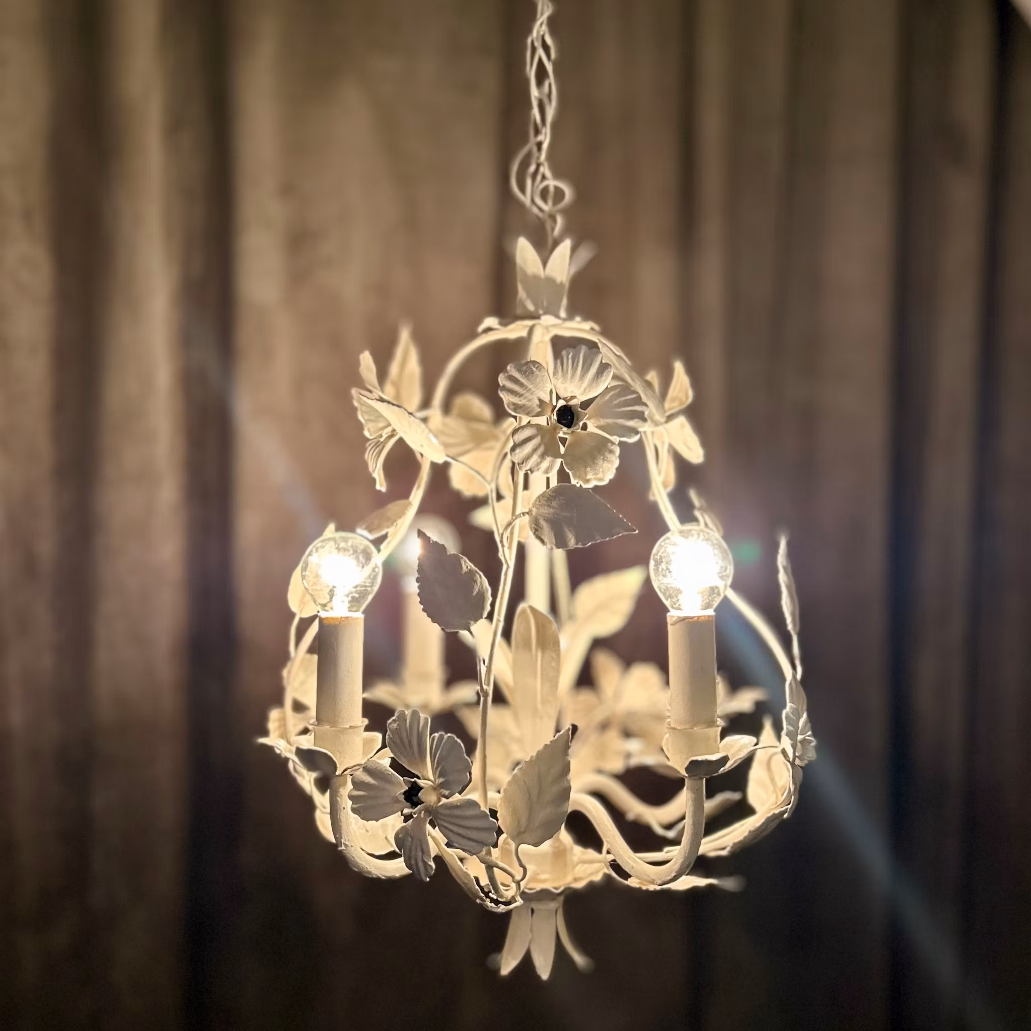 Takkrona i vit plåt med blommor och blad. Fyra ljuspunkter .Höjd 43 cm. I bra bruksskick.