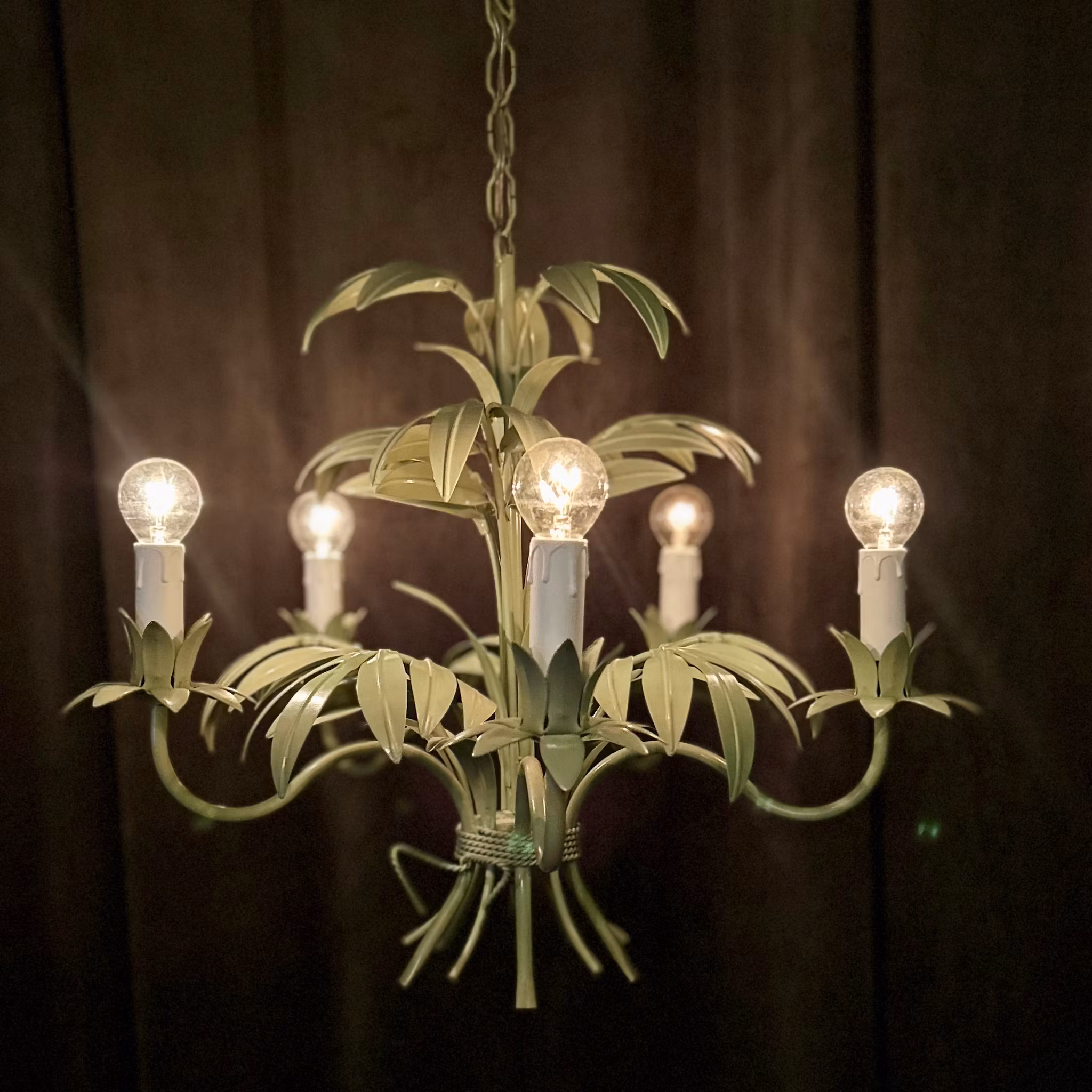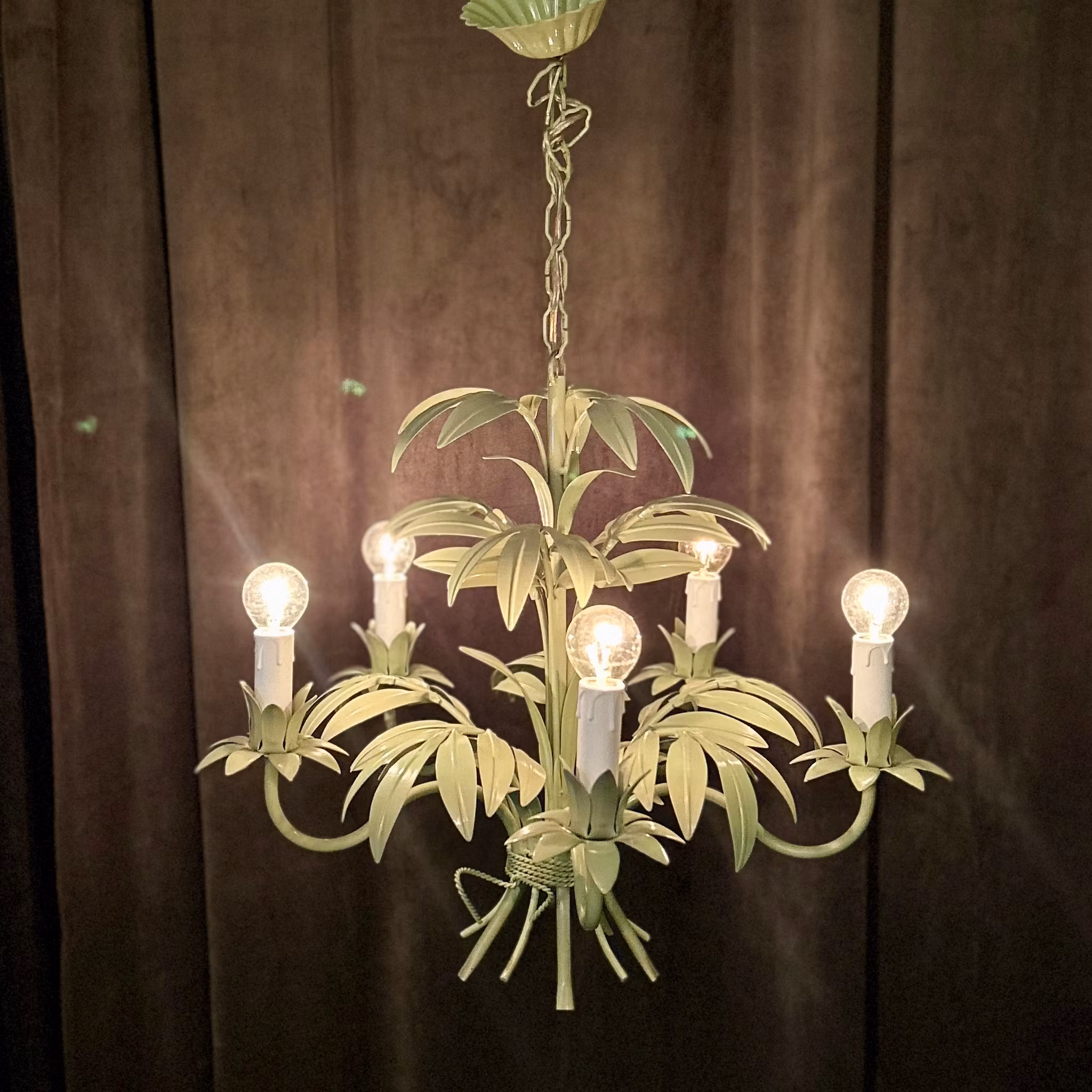 Italiensk ljusgrön ljuskrona i plåt med blad. Fem ljuspunkter. Bra bruksskick. Höjd 56 cm.