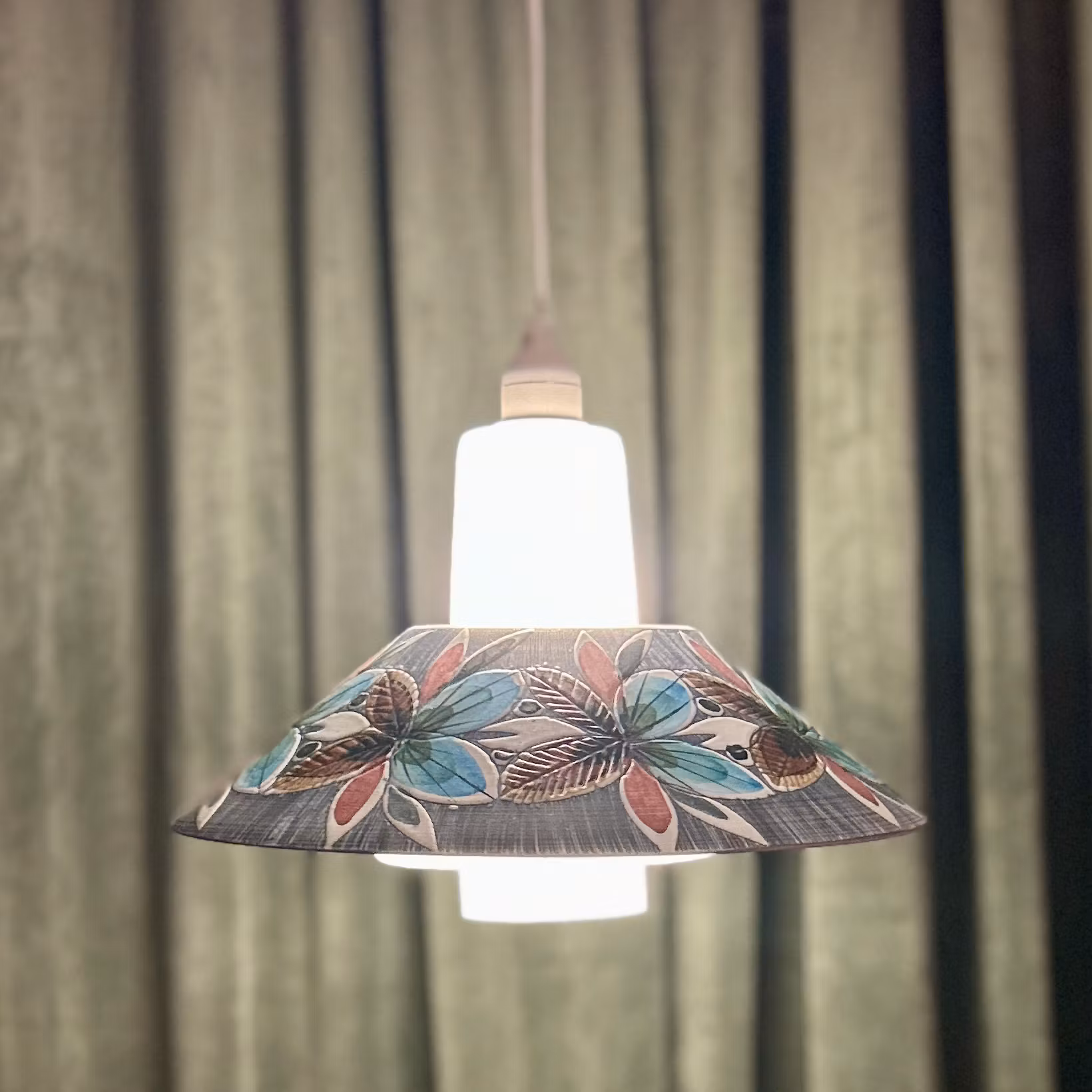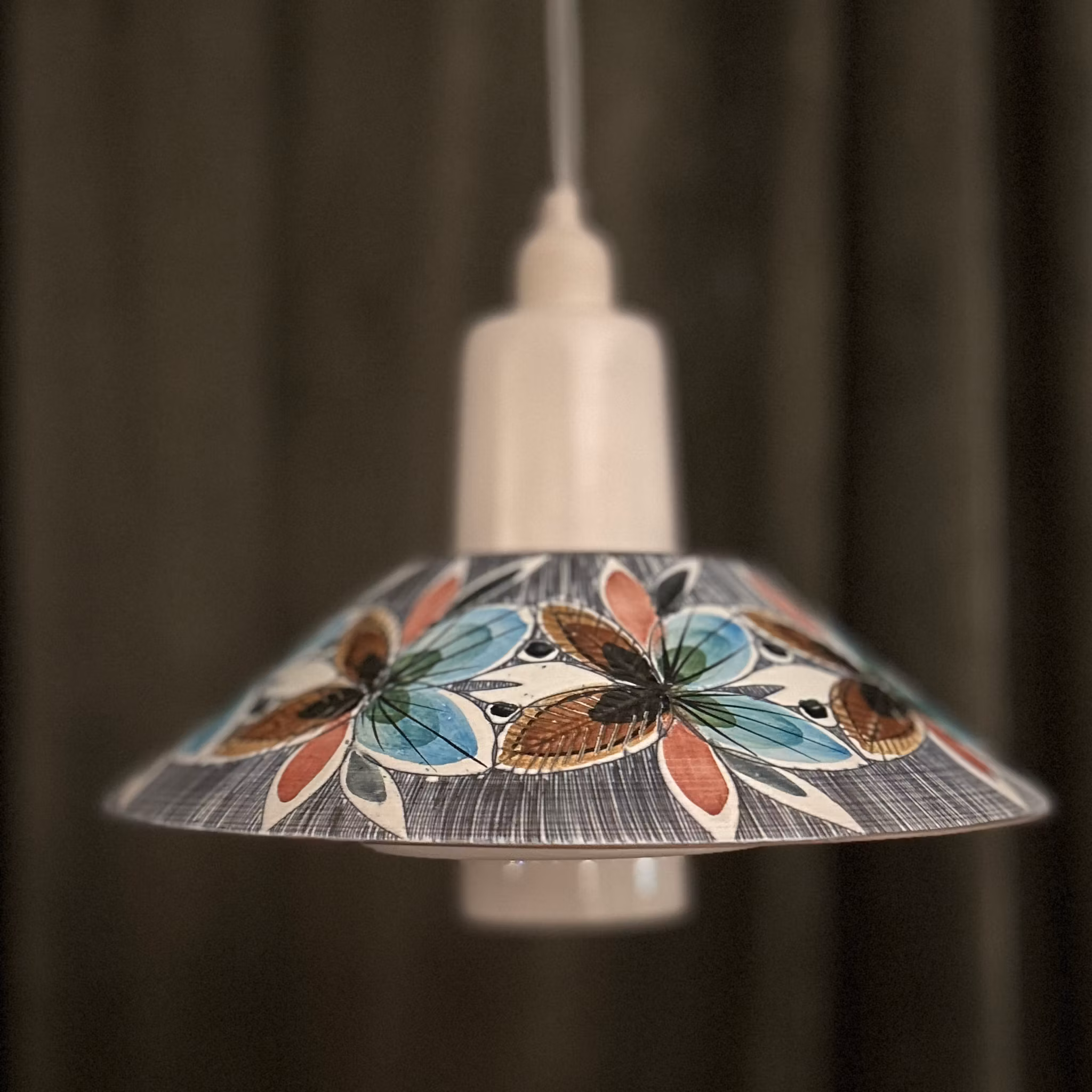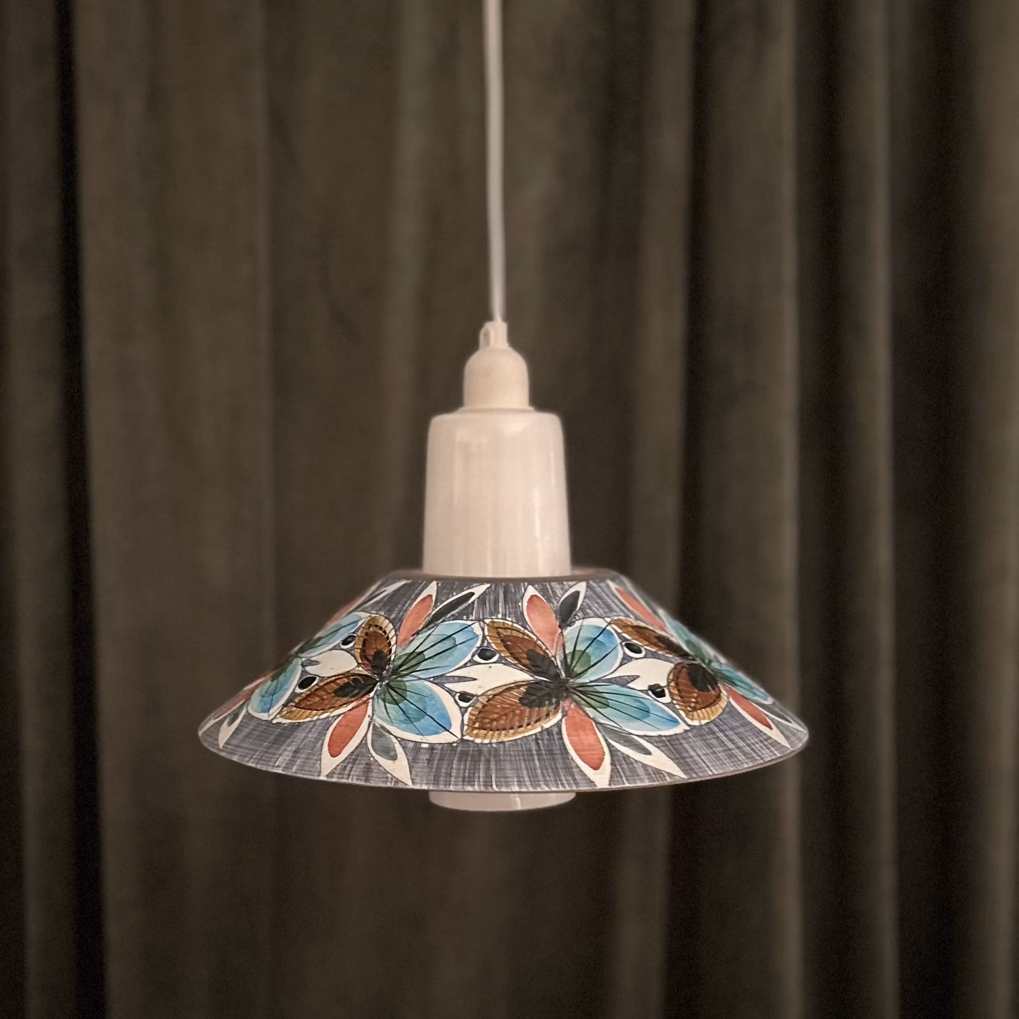 Taklampa i keramik och glas. Tilgmans 50-60-tal. Diameter 37 cm. Skicket utan anmärkning. Troligtvis är det vita glaset och keramik skärmen kombinerade i efterhand.