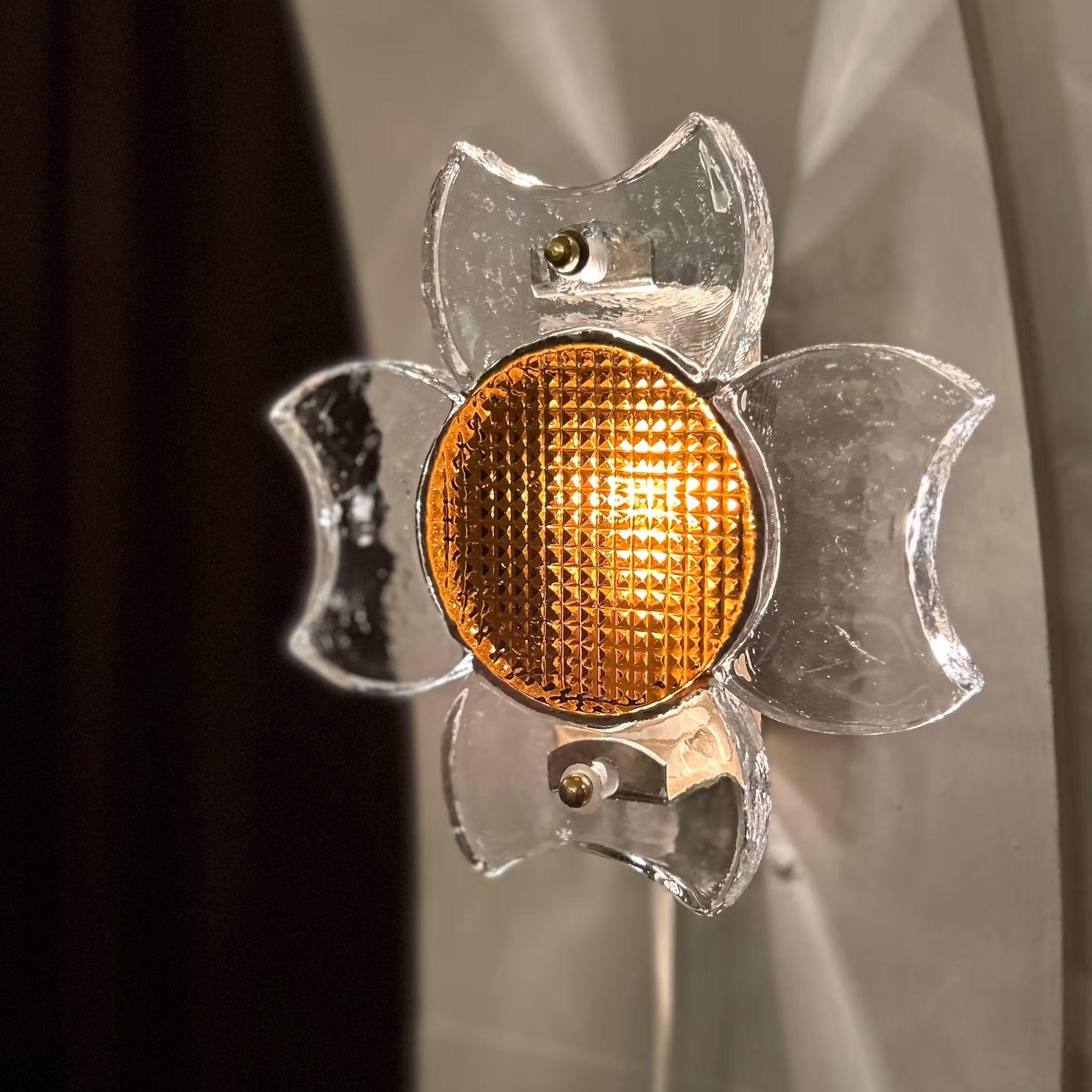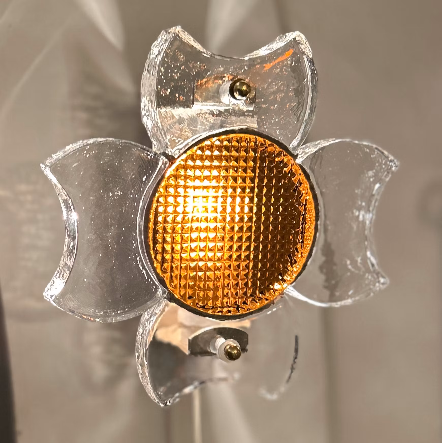 Väggarmatur i glas och metall, tillverkad av Ateljé Engberg, Urshult. Höjd: 19 cm, längd: 20 cm, djup: 8 cm.