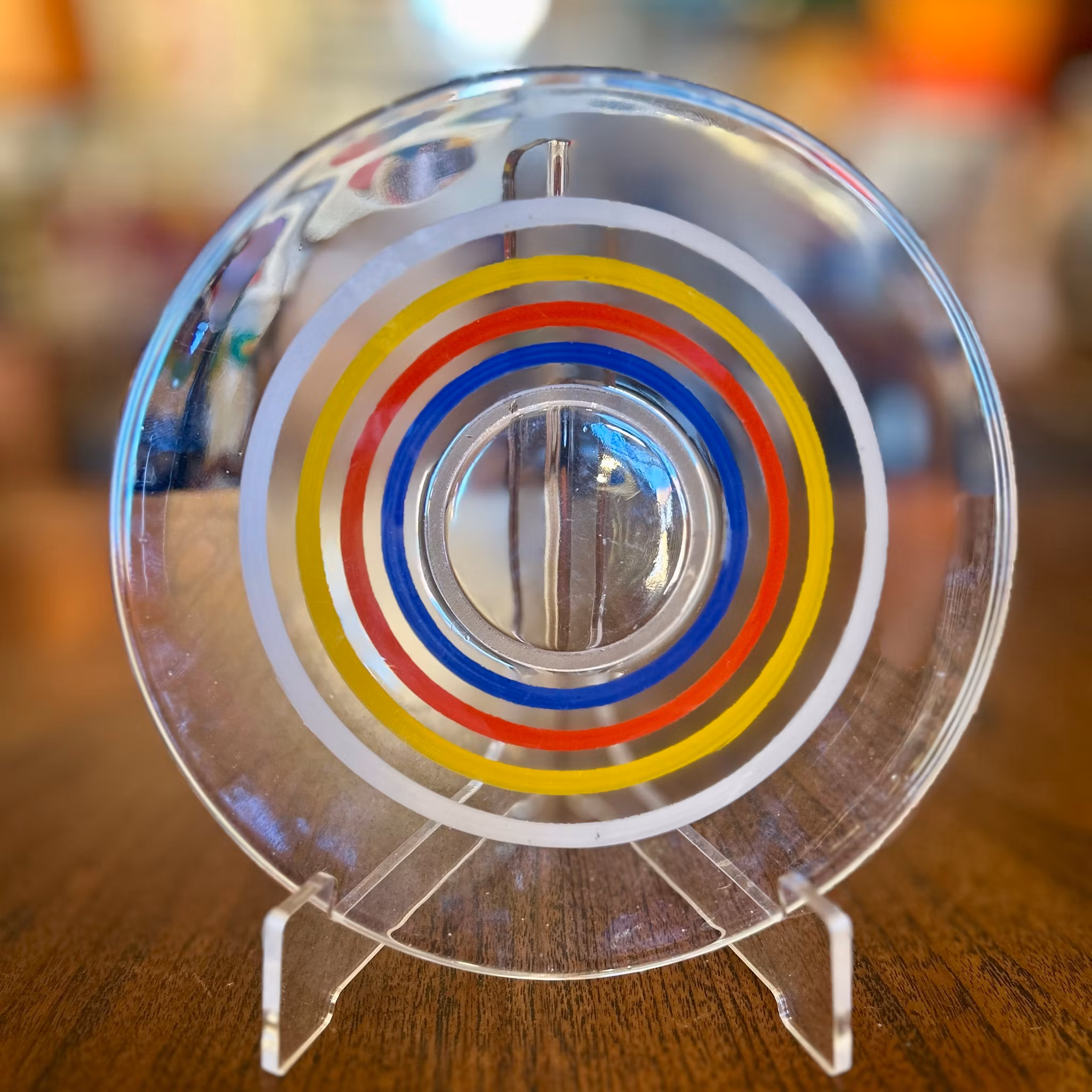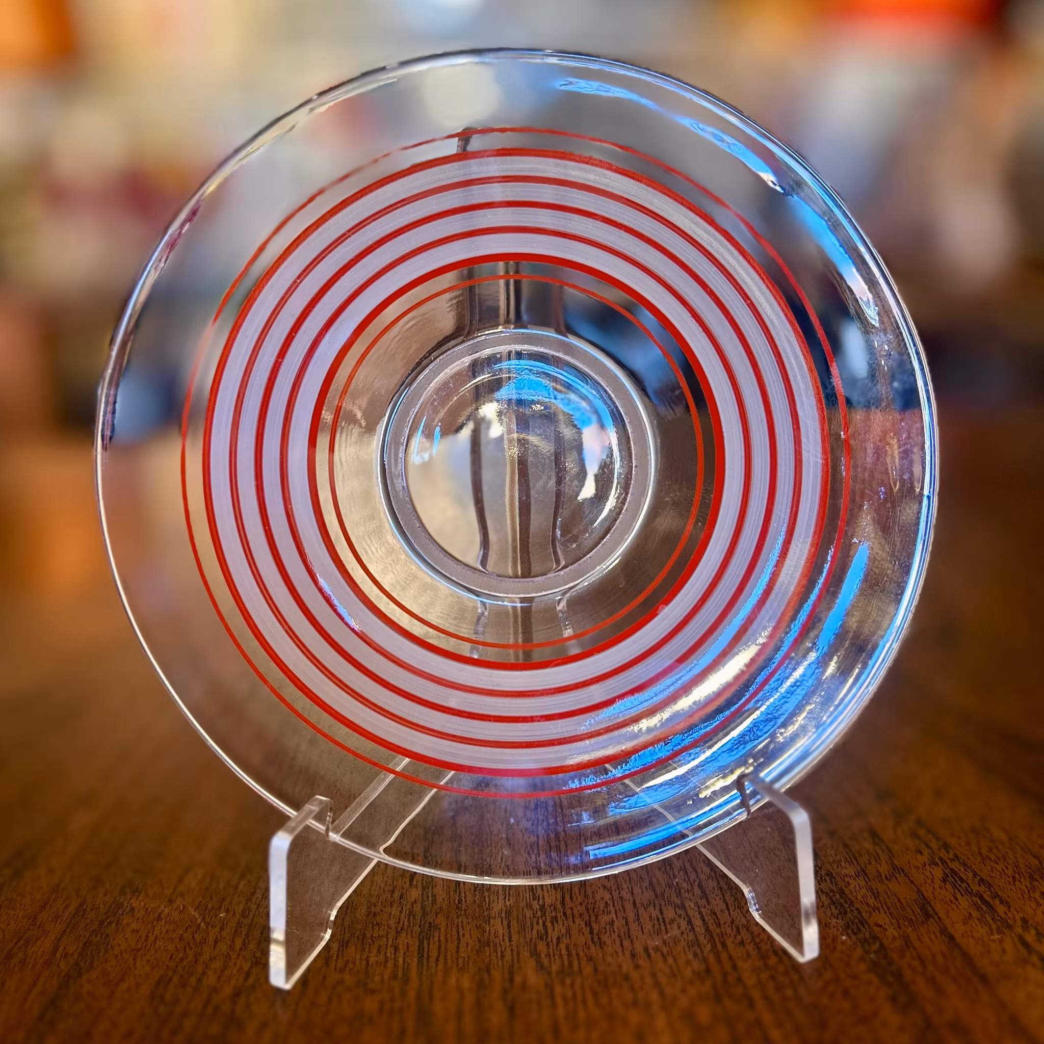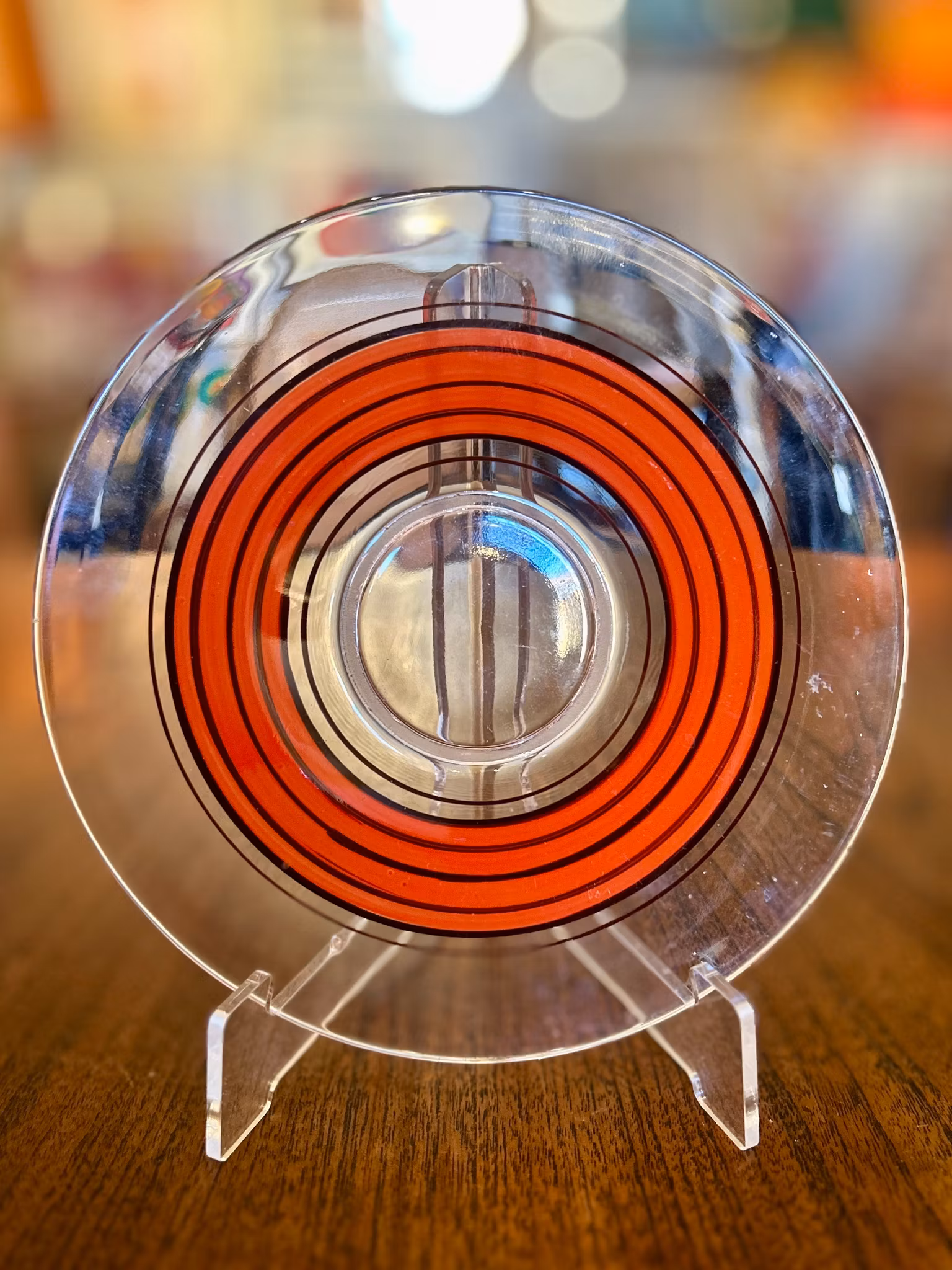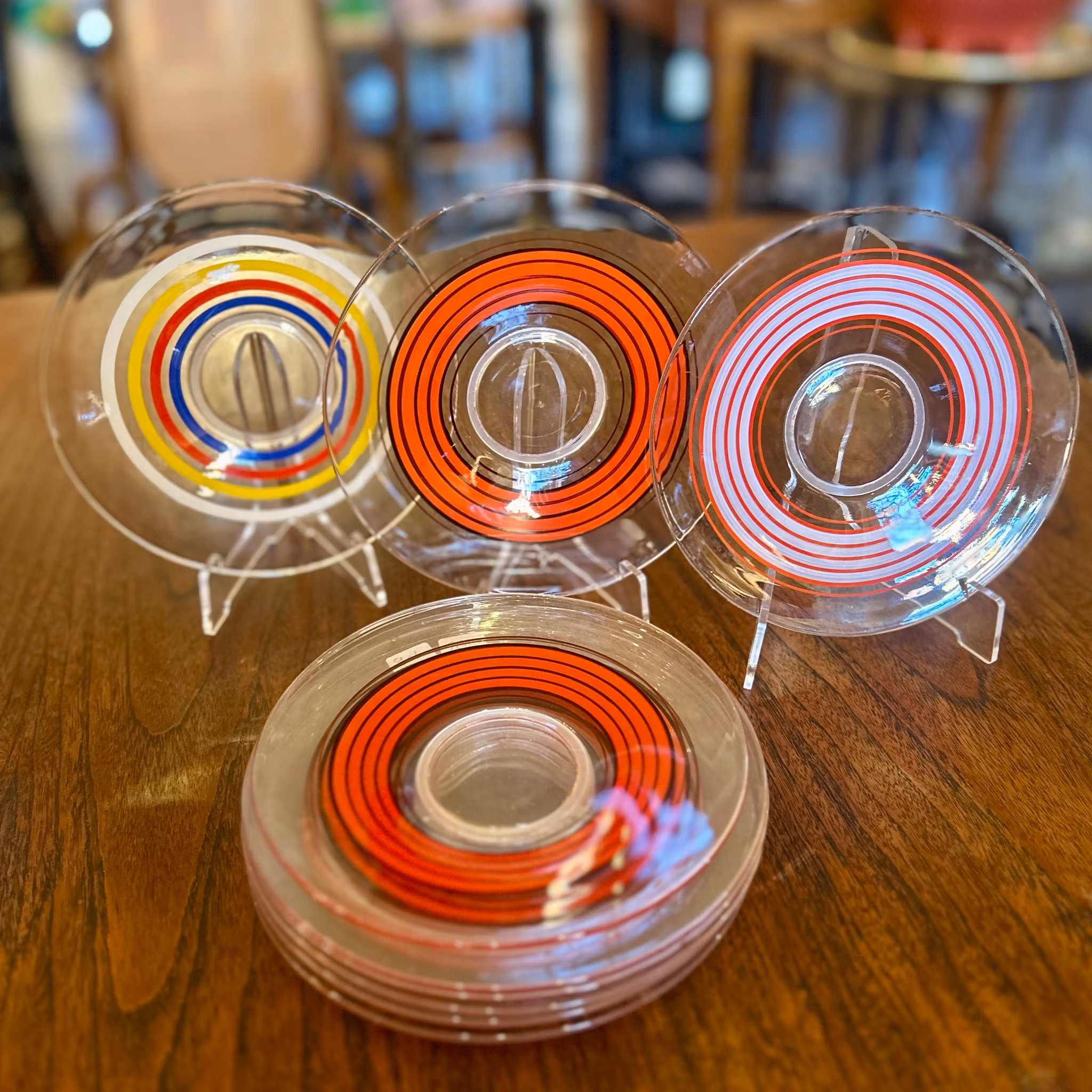 Nio stycken assietter med olika randmönster i färgerna rött, svart, vitt, gult och blått. Diameter: 17 cm. Bra vintageskick.