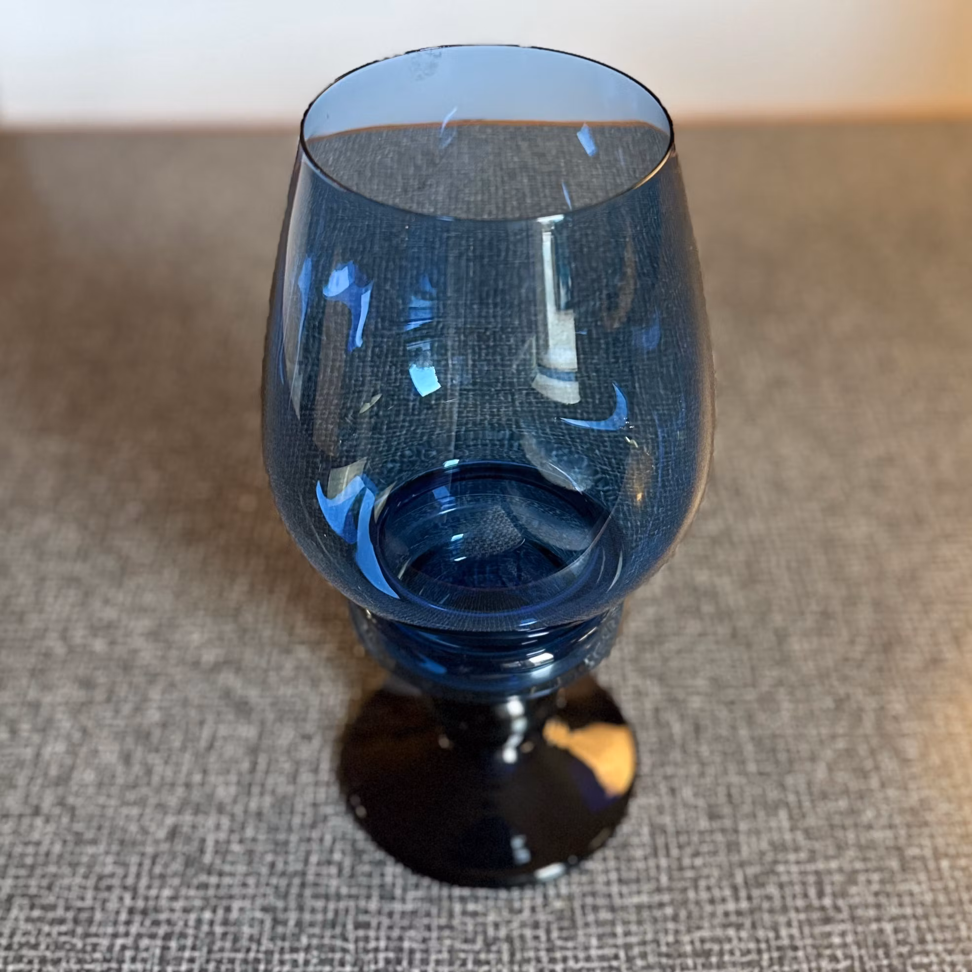 Elegant ljuslykta i blått glas. Höjd: 26 cm. Bra skick.