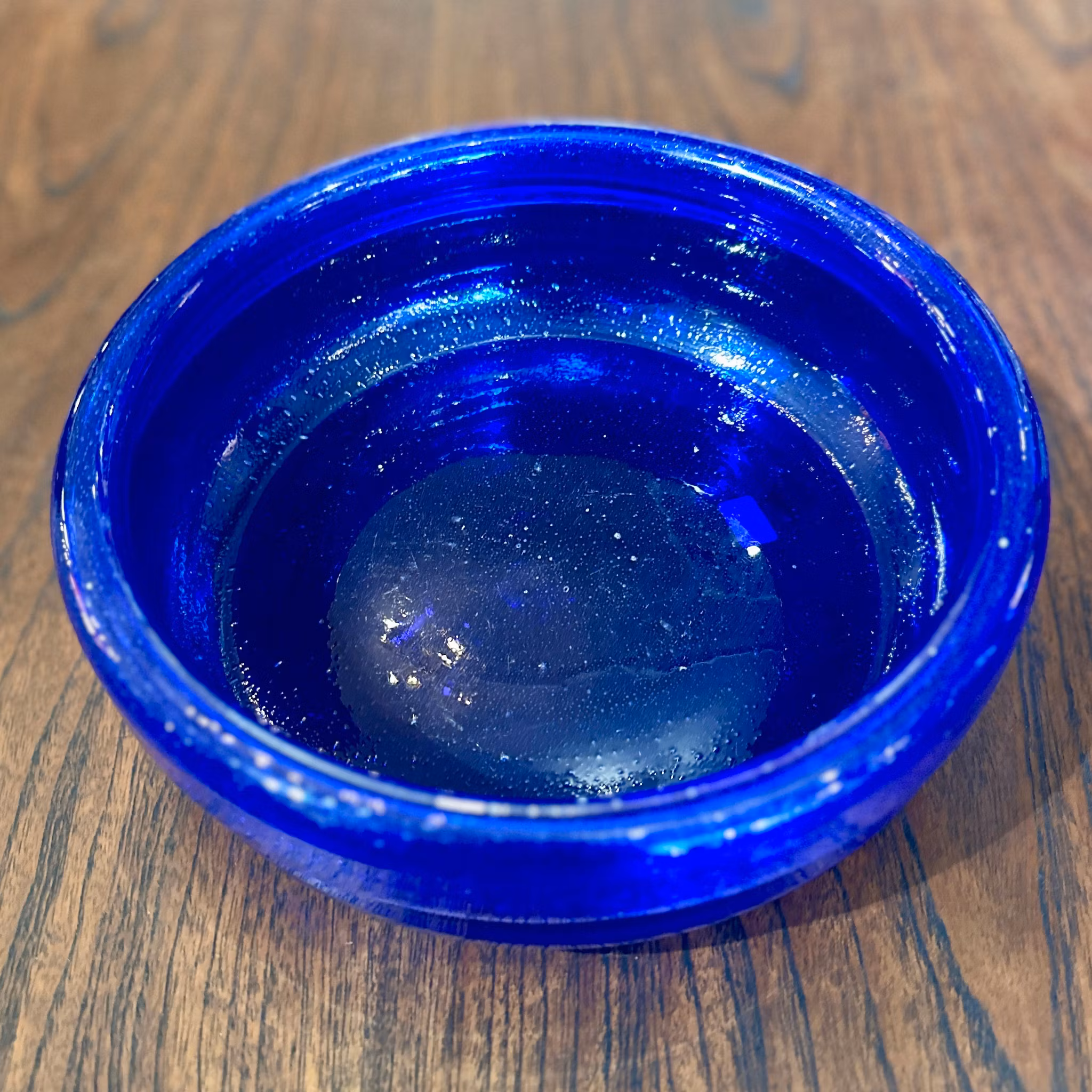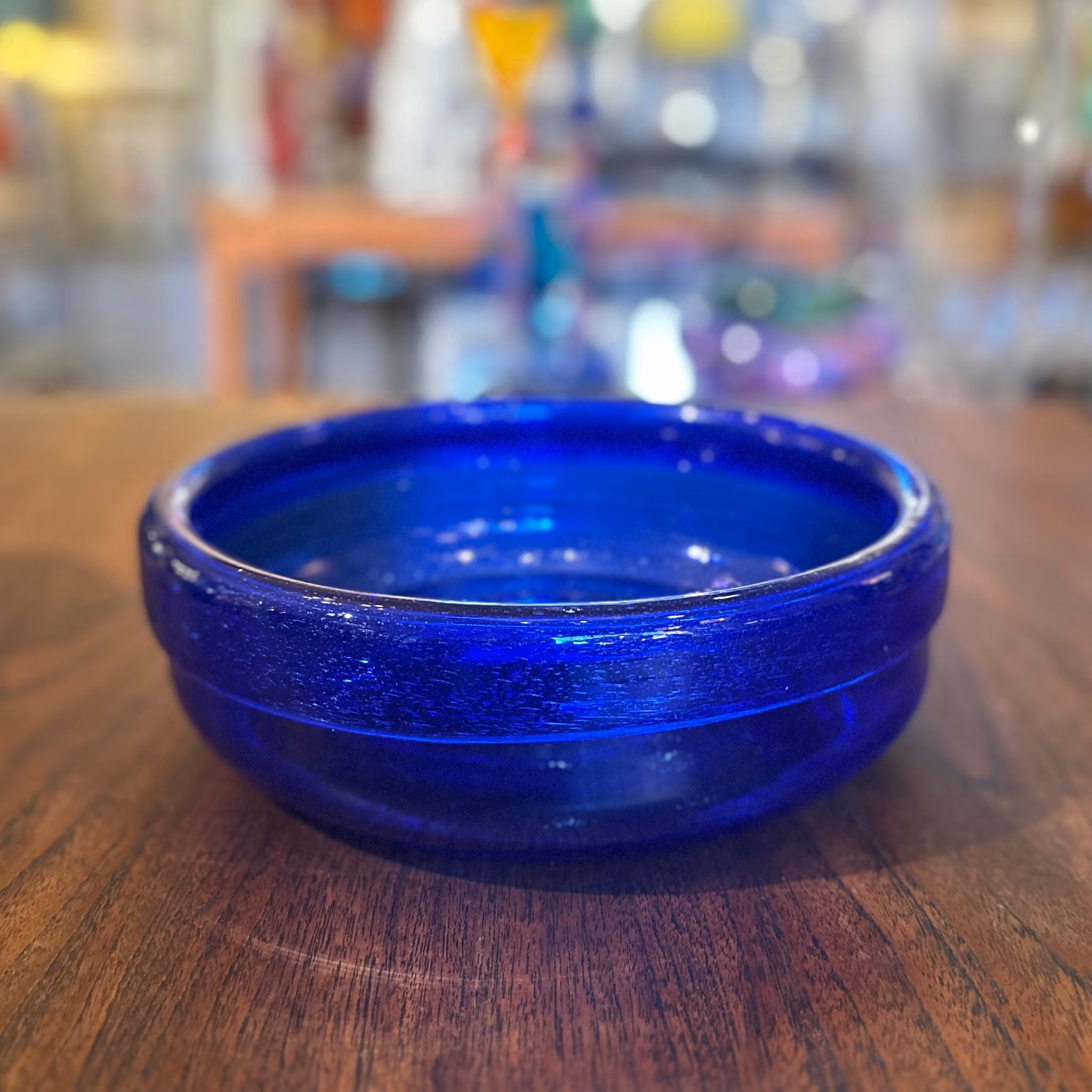 Låg blå skål, signerad av Erik Höglund för Boda. Höjd: 8 cm, diameter: 24 cm. Gott skick.
