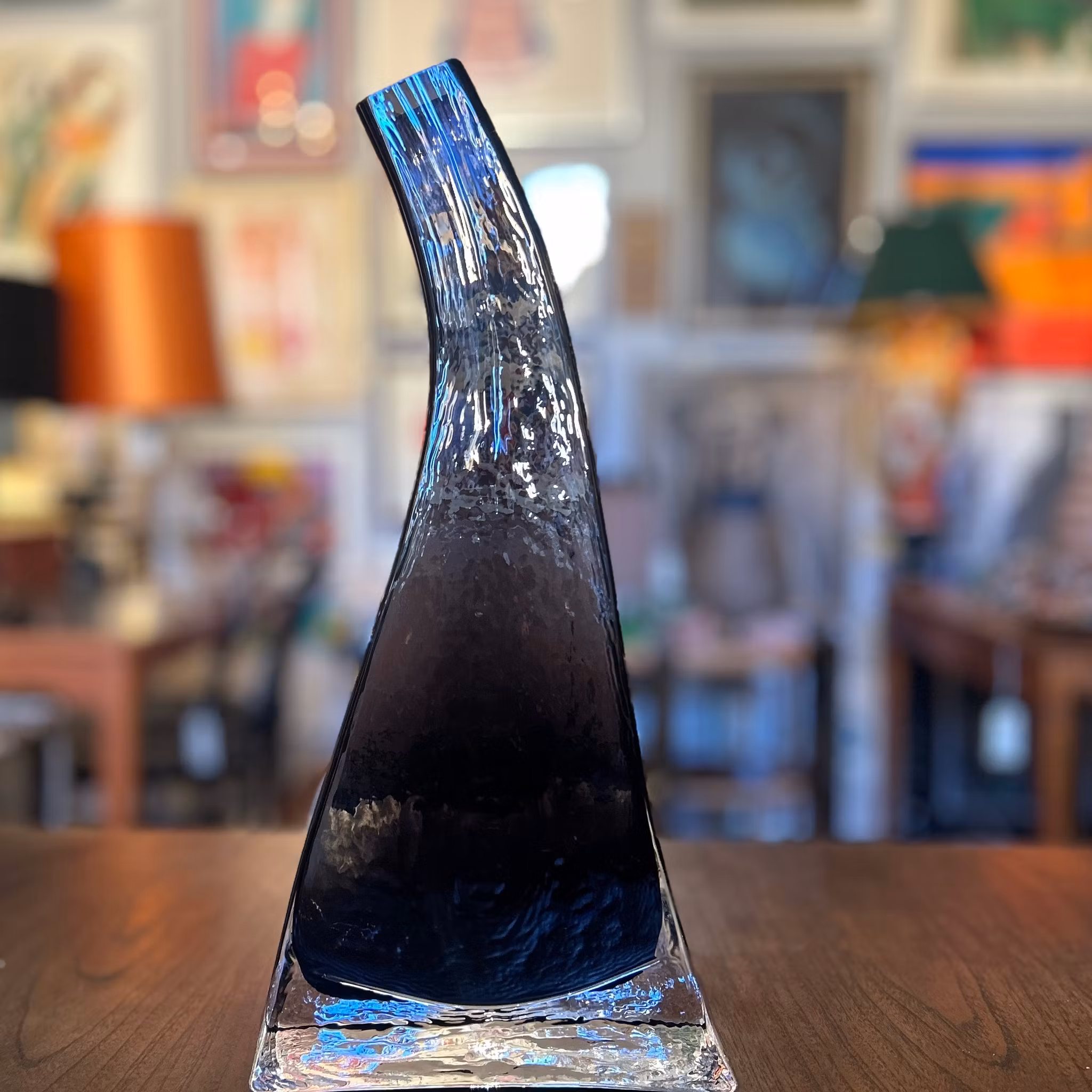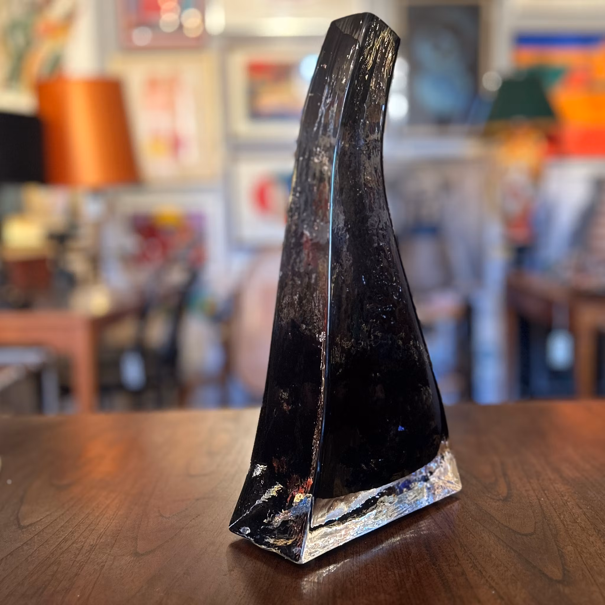 Stor vas i svart glas, designad av Margareta Hennix för Pukeberg -91. Höjd: 42 cm, bredd: 20 cm. Prima