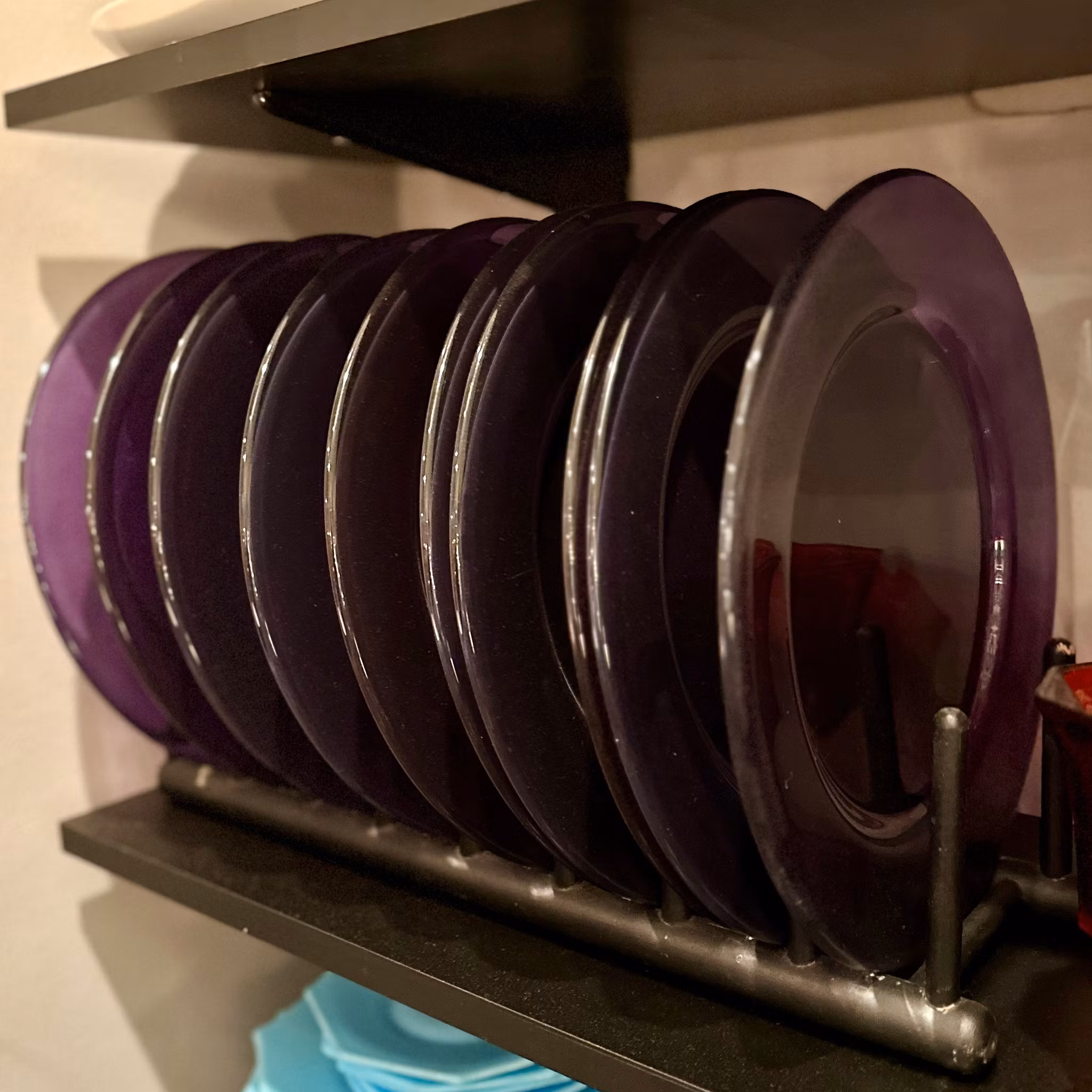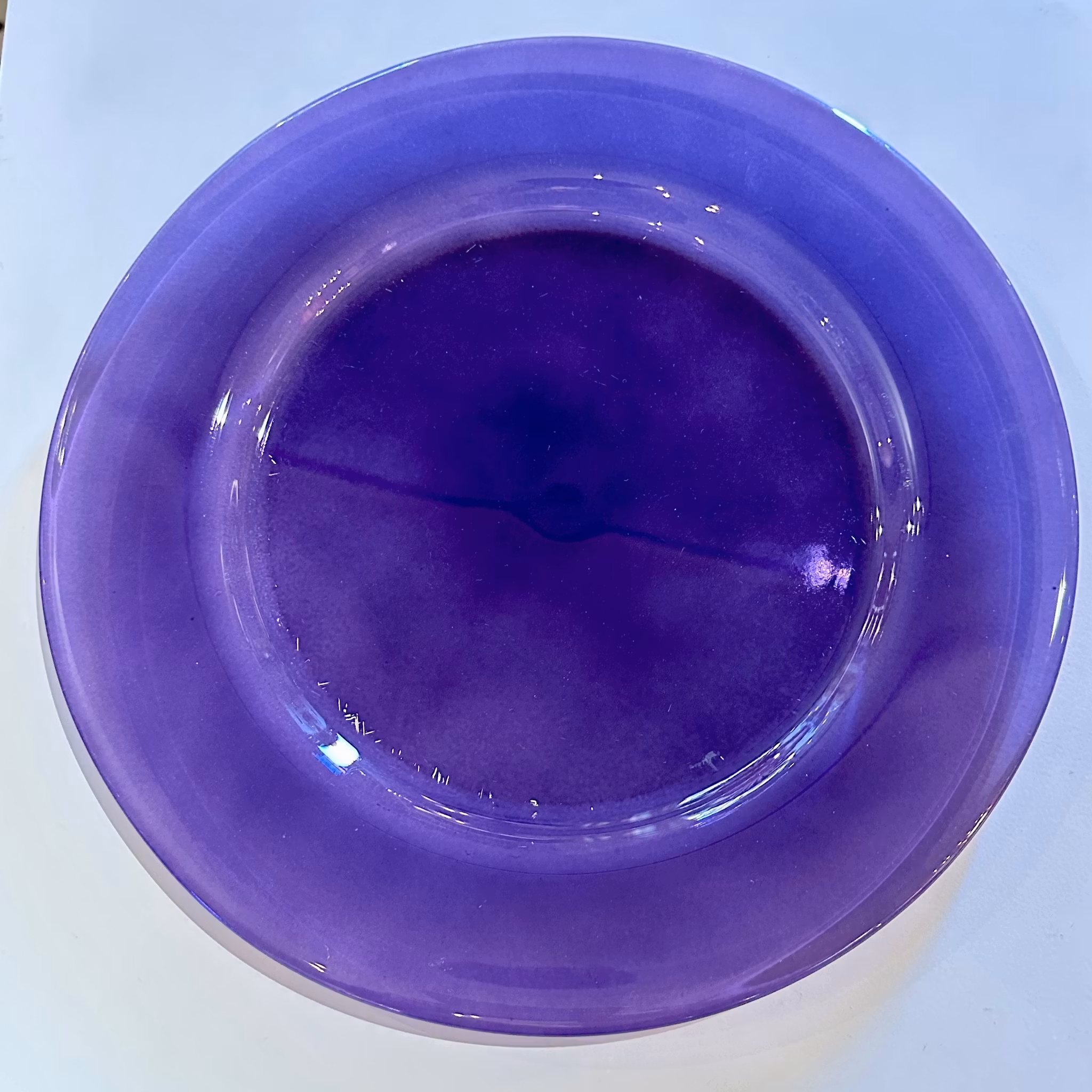 Tio stycken lila glastallrikar. Diameter: 30 cm. Några med repor men ser snygga ut.