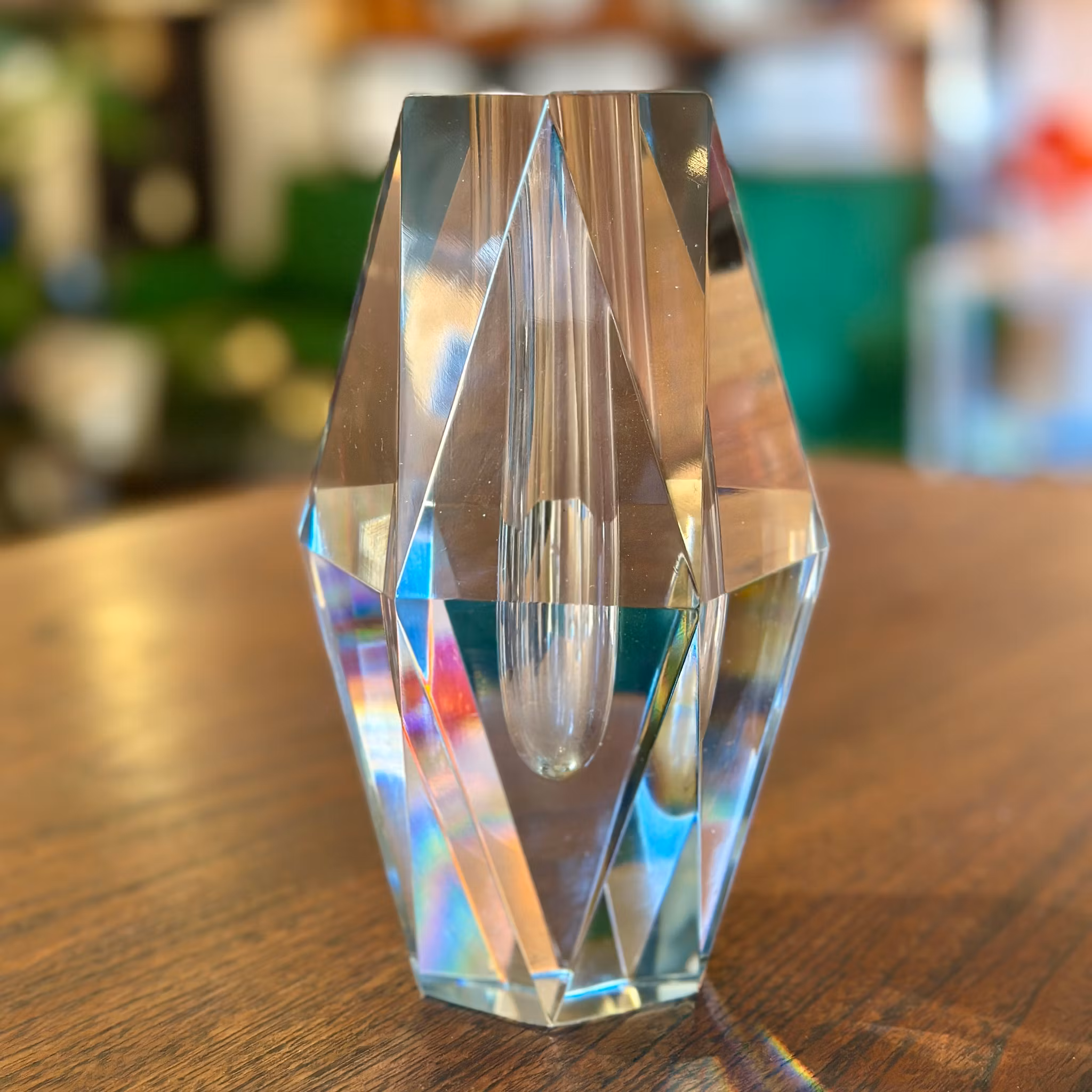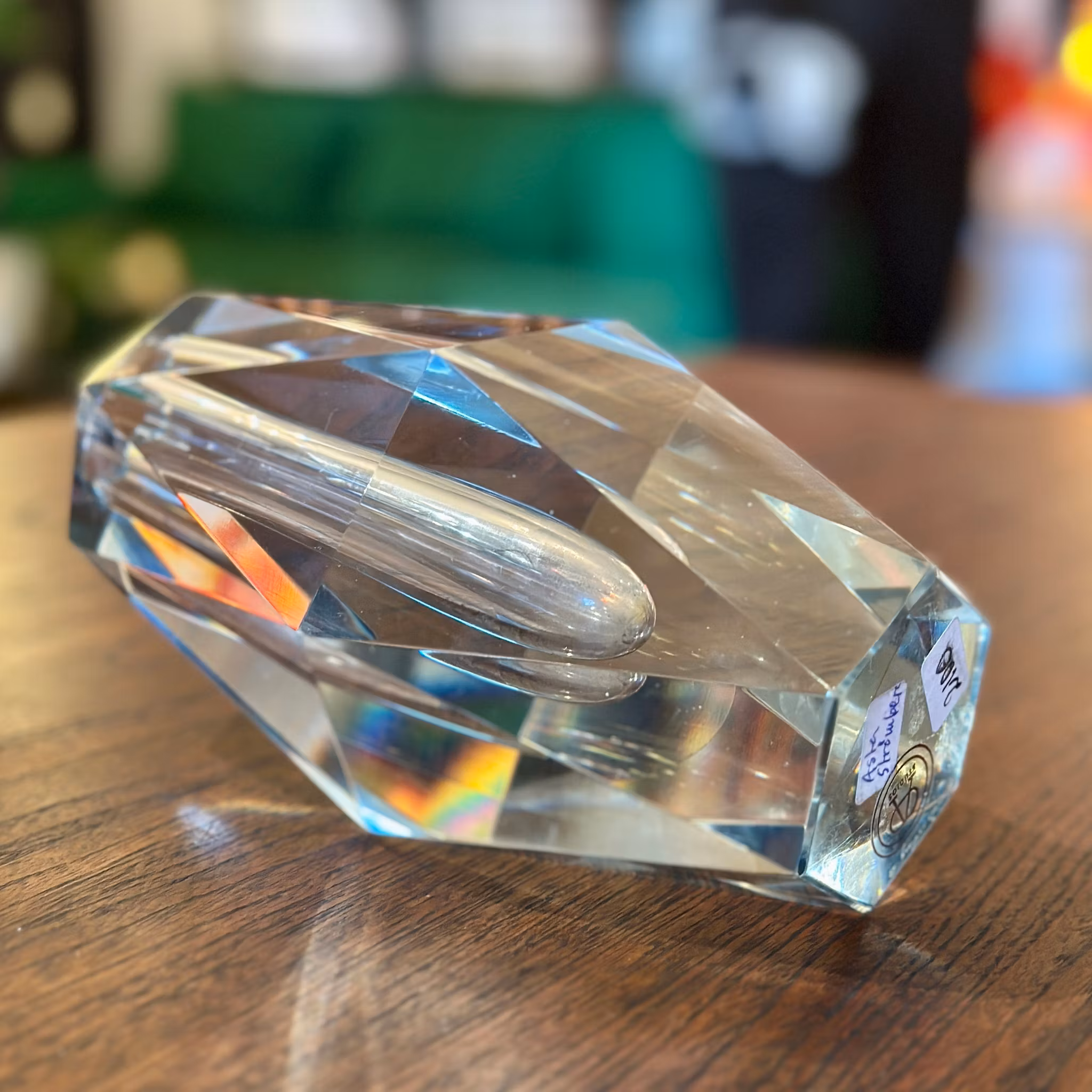 Signerad och fasettslipad ljusstake/vas ur serien "Diamant", designad av Asta Strömberg för Strömbergshyttan. Höjd: 17 cm. Bra vintage skick.