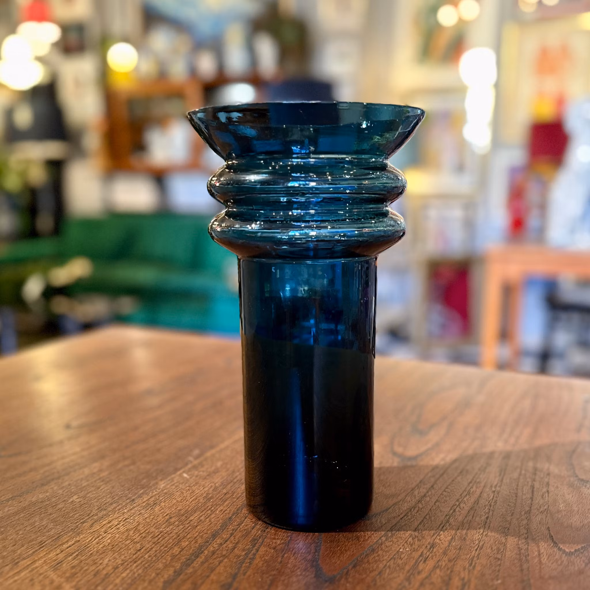 Mörkblå glasvas med vid öppning. Höjd: 24 cm, diameter: 14 cm. Bra skick.