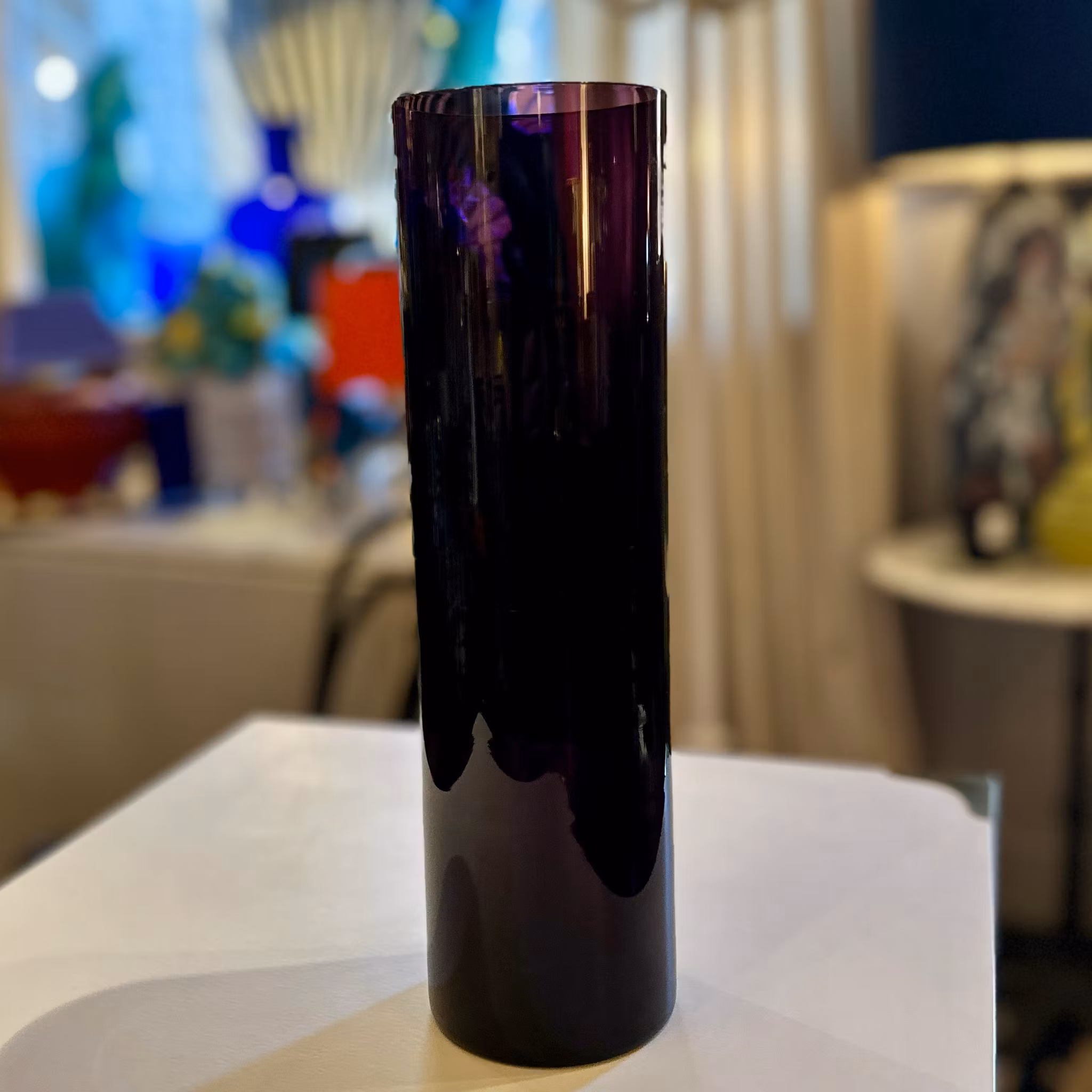 Mörkt lila cylindervas, troligen av Kaj Franck. Höjd: 29 cm, diameter: 8 cm. Mikronagg vid öppning.