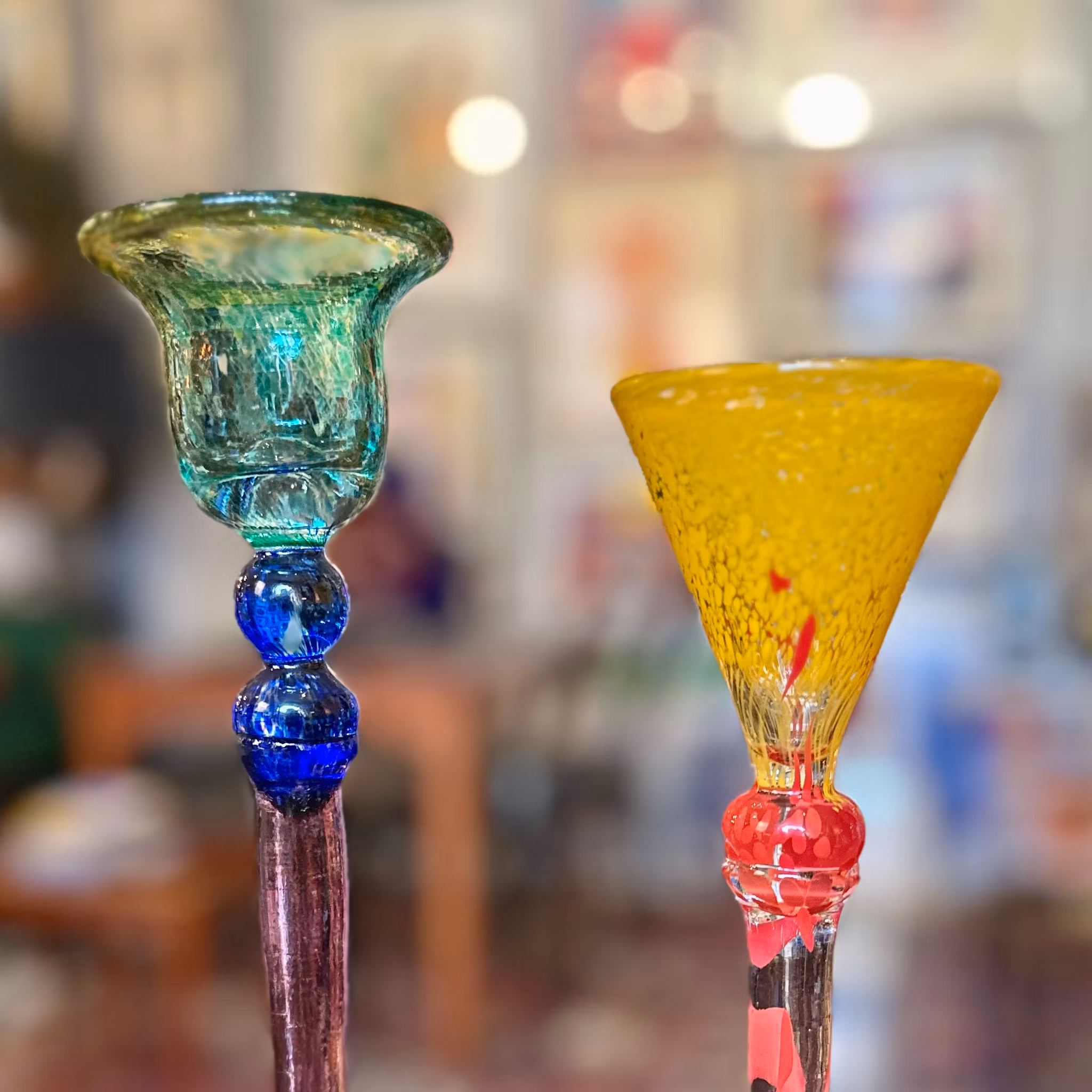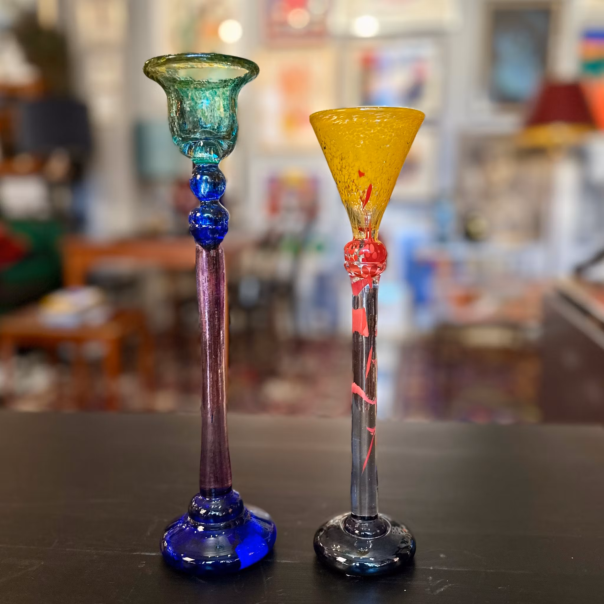 Ett par pokaler i flerfärgat glas i postmodern stil. Signerade. Höjd: 28,5 cm och 25,5 cm. Perfekt skick.
