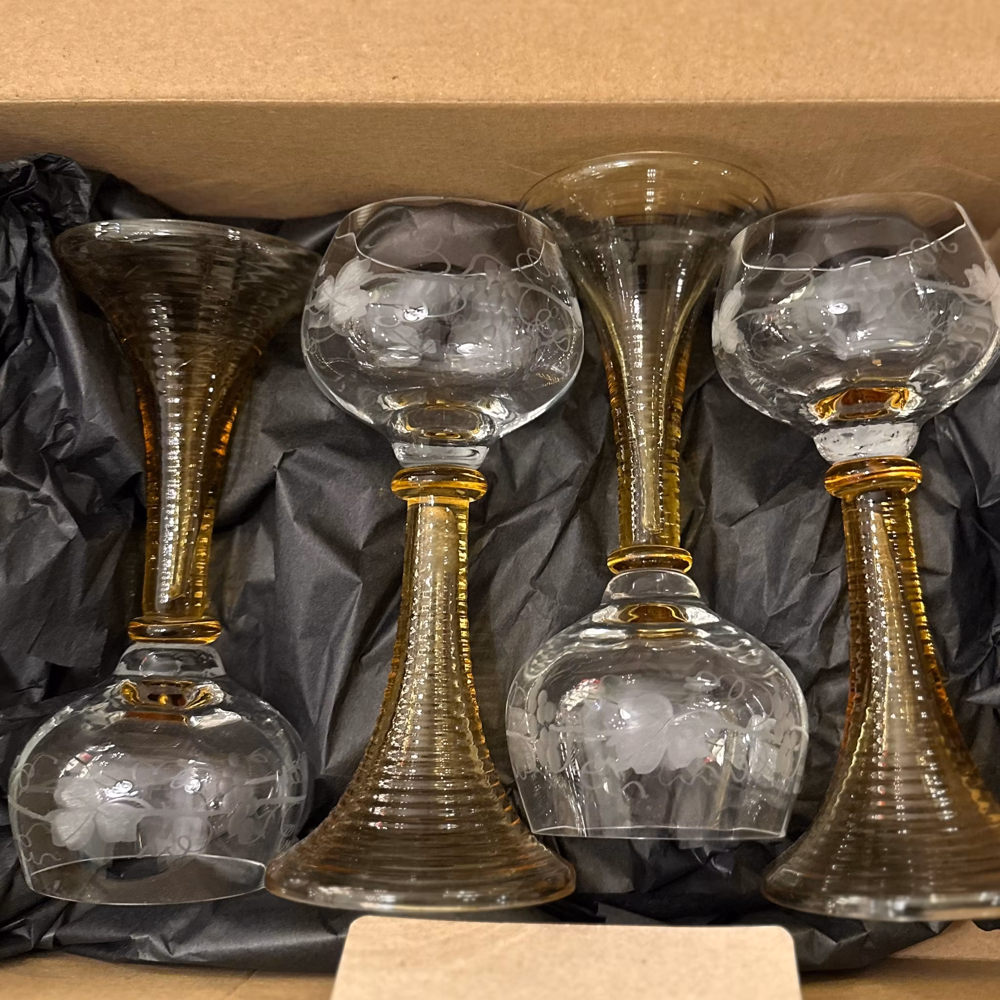 Fyra stycken remmare med gul fot. Höjd: 18 cm, diameter: 7 cm. Bra skick.
