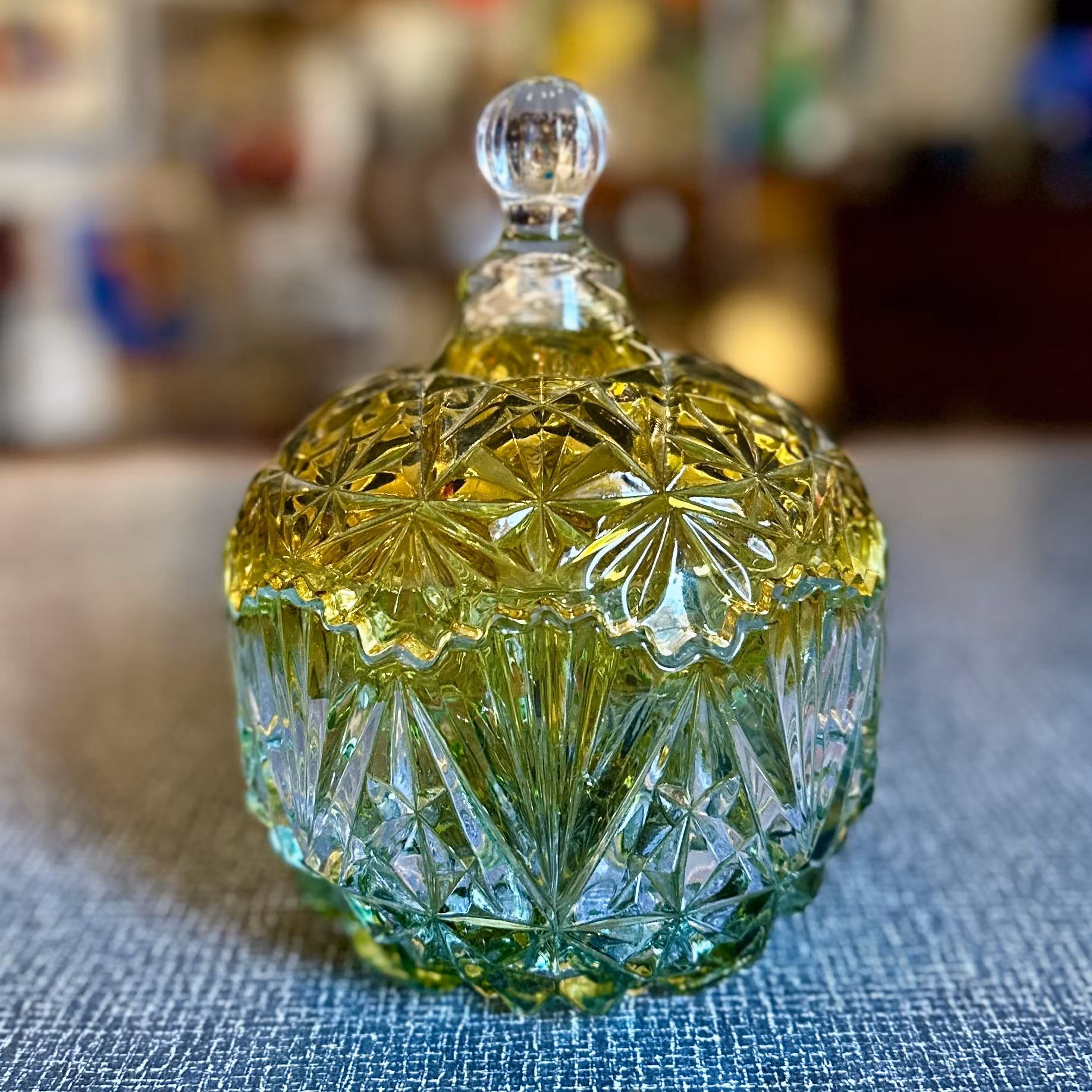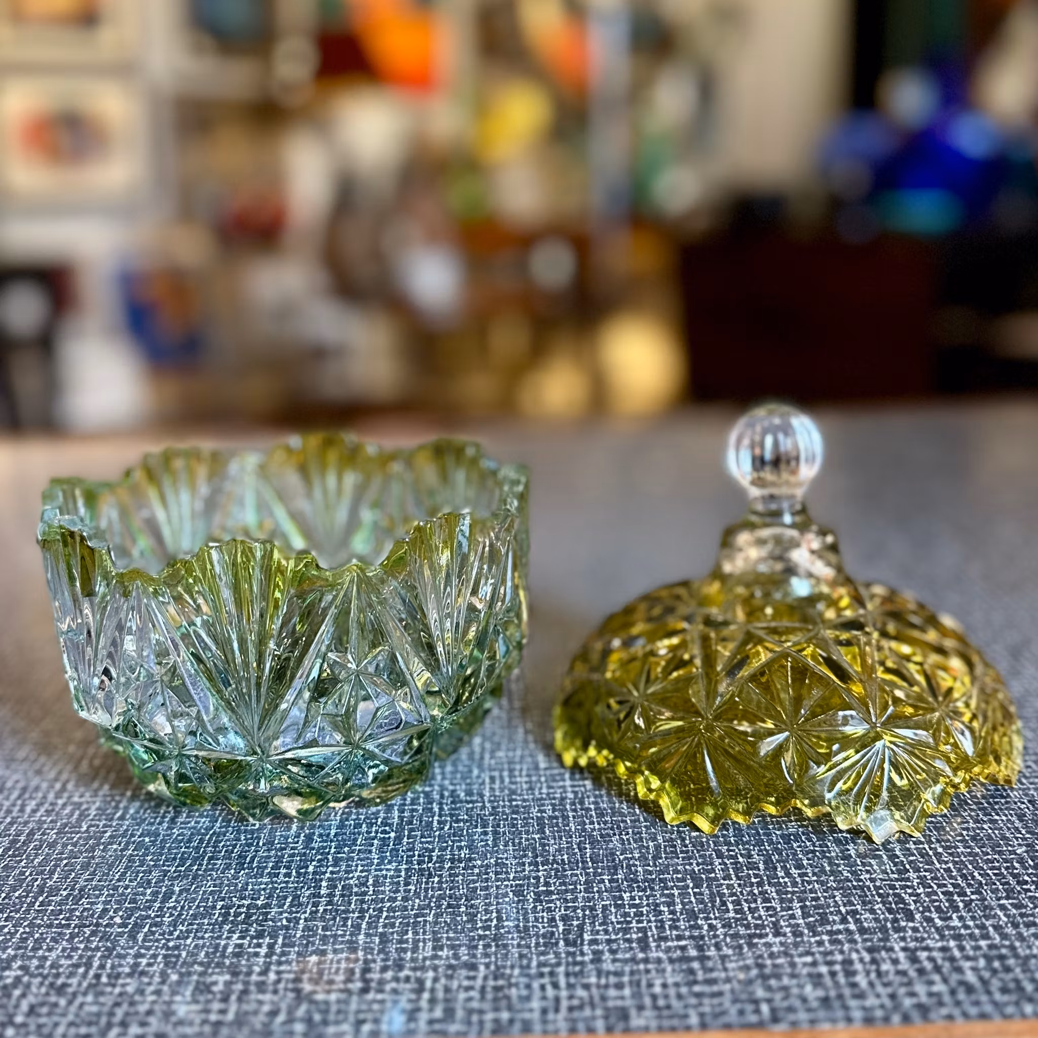 Elegant rund lockask i sirligt pressglas, tonad från mörkare grönt till ljusare nyans. Höjd: 21 cm med lock, 10 cm utan lock. Diameter: 15 cm. Bra skick.