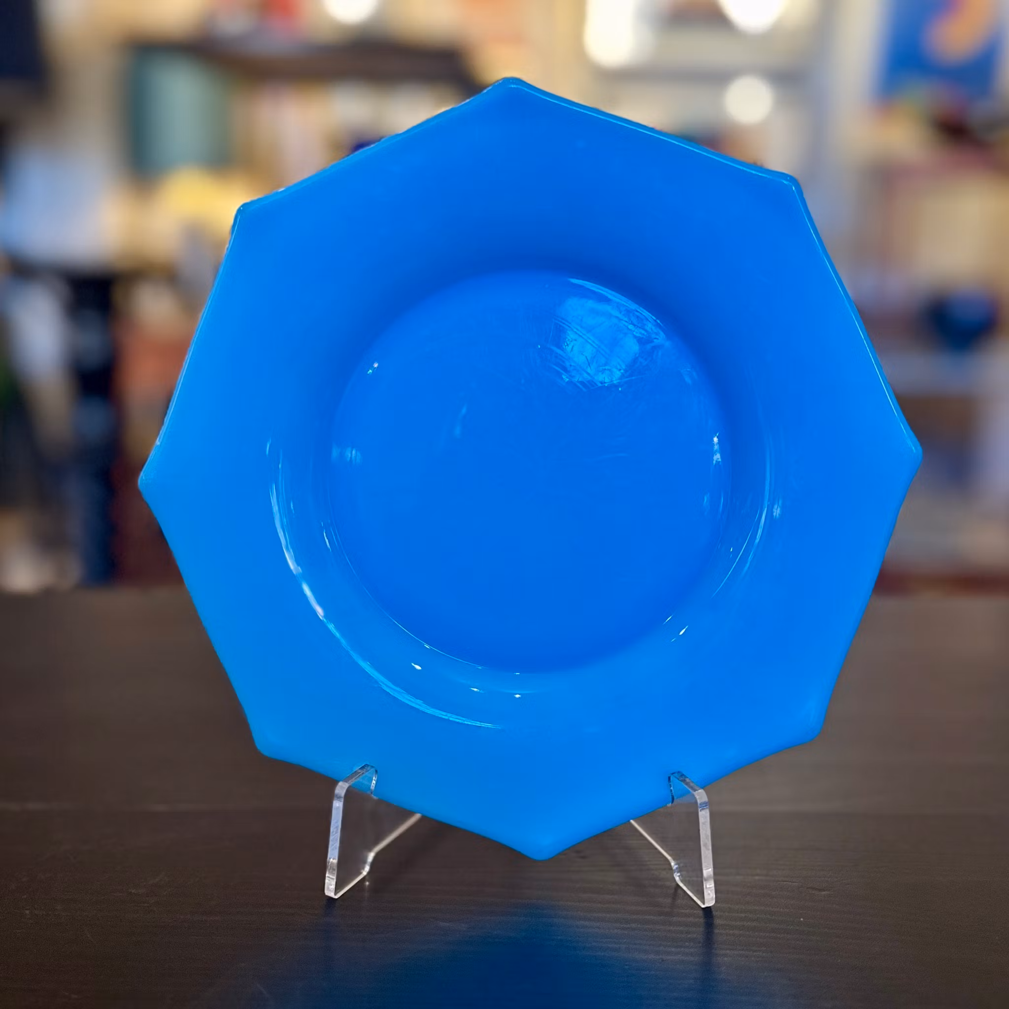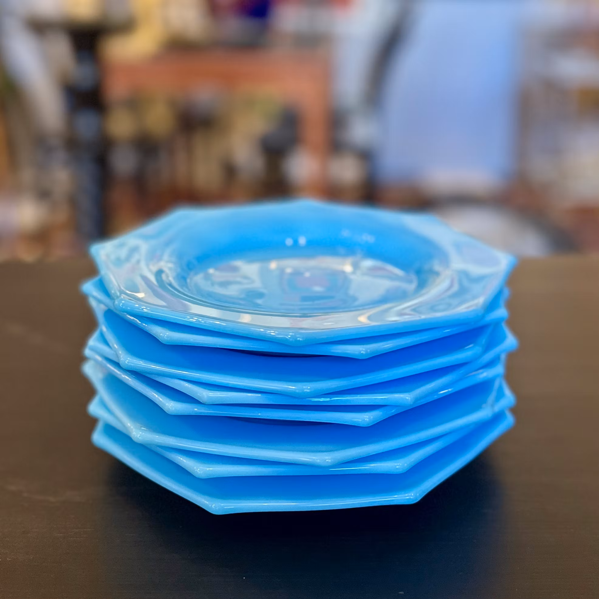 Set med åtta större assietter i elegant turkos färg. Passar utmärkt till både vardag och fest. Dia 20 cm.