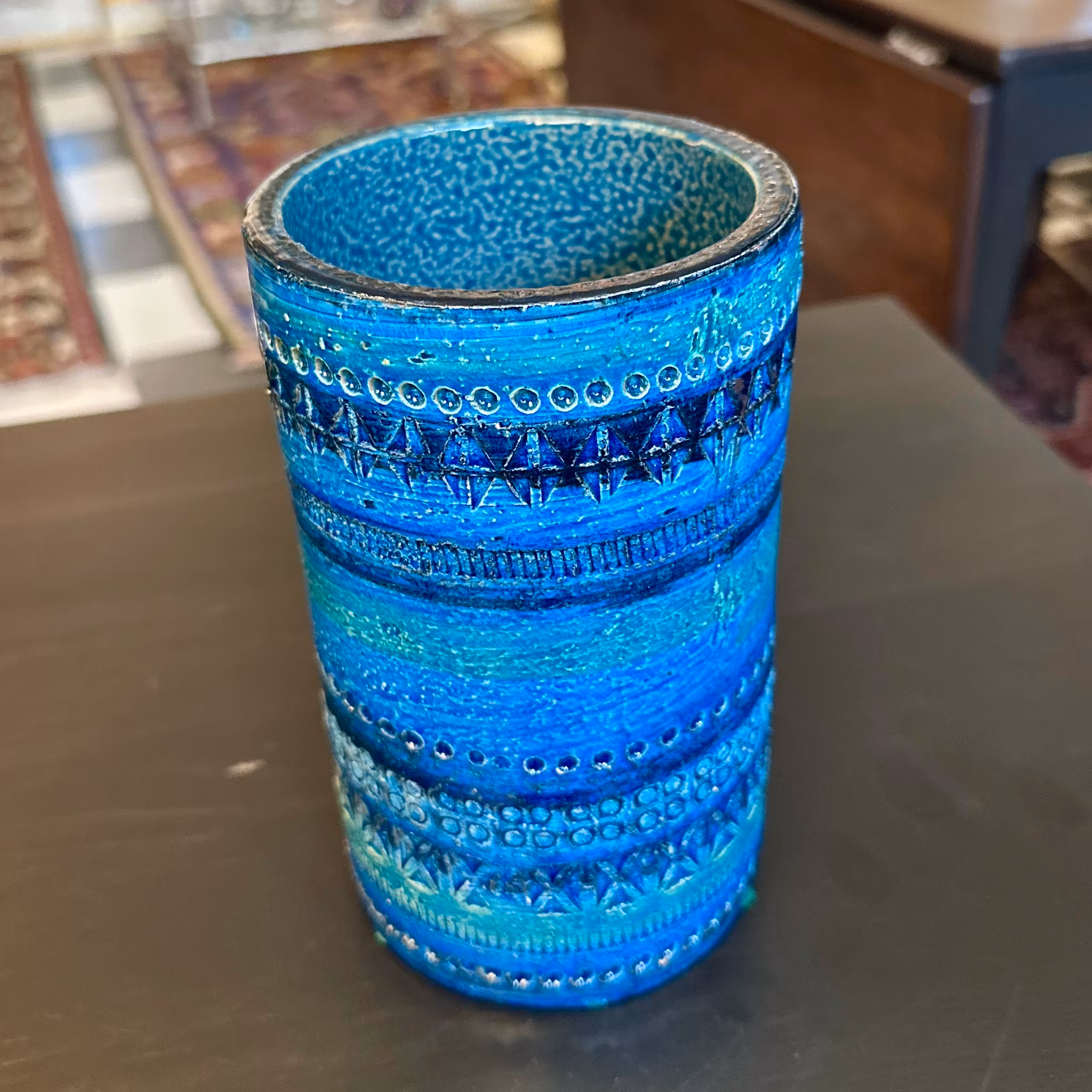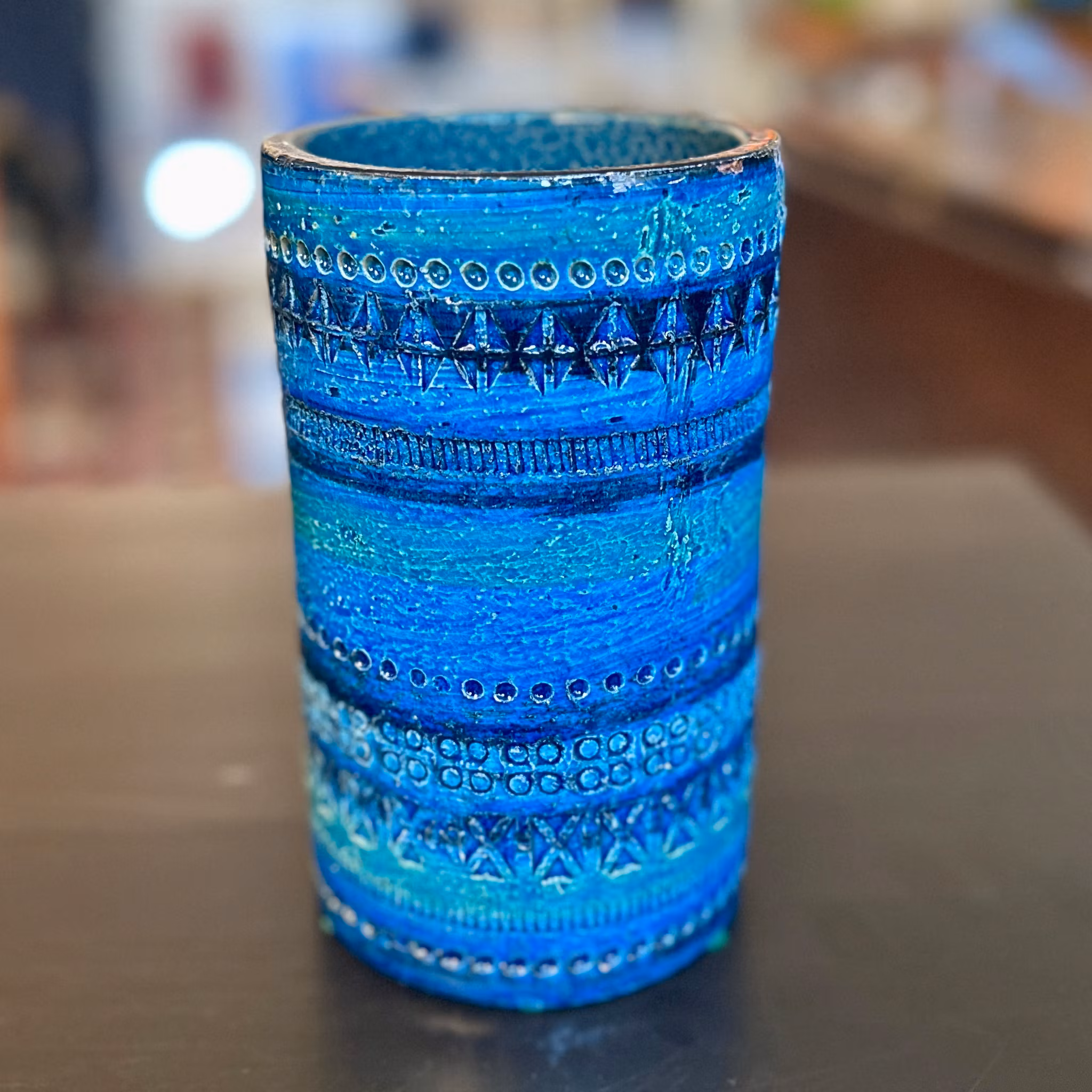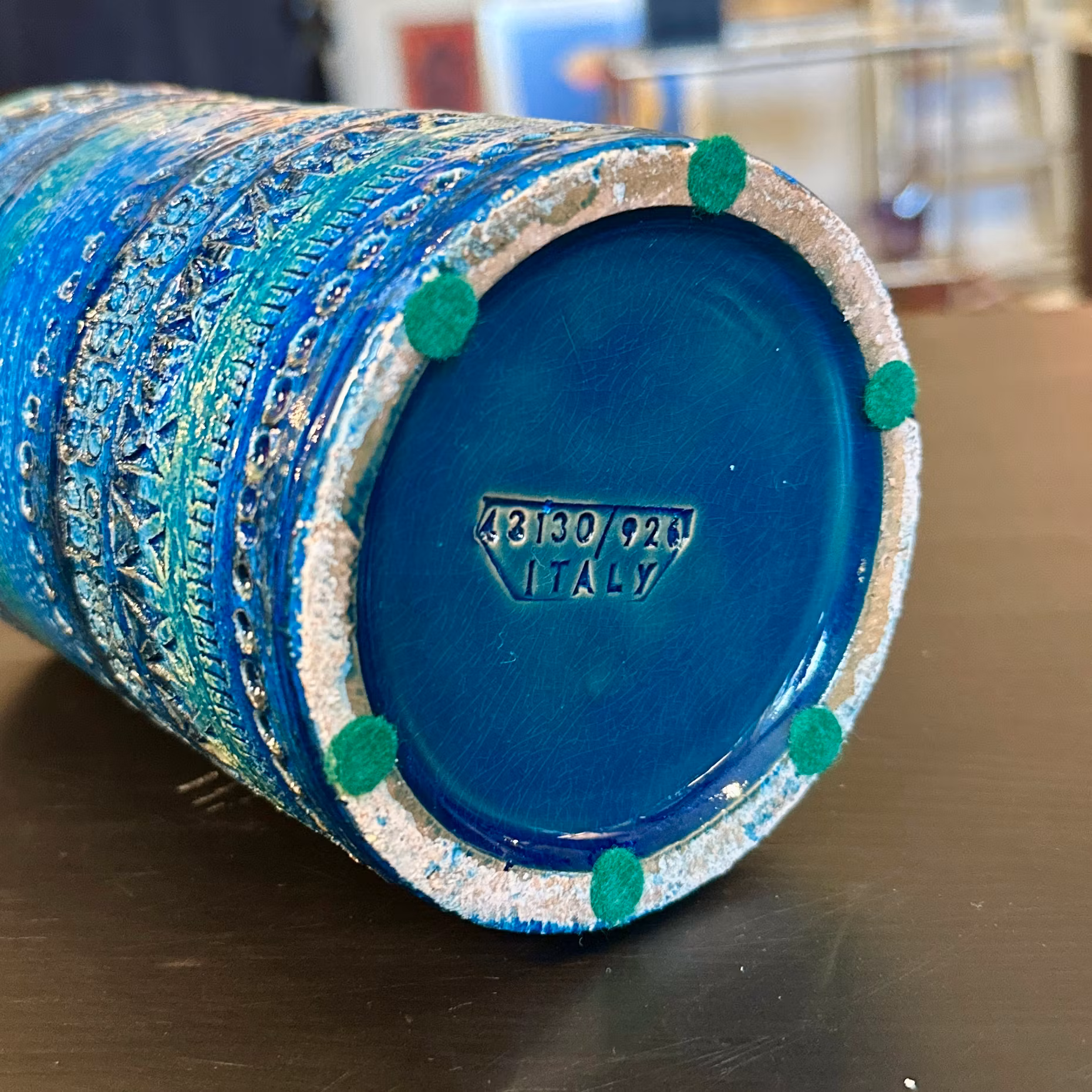 Blåglaserad keramikvas designad av Aldo Londi för Bitossi. Tillverkad på 1970-talet.