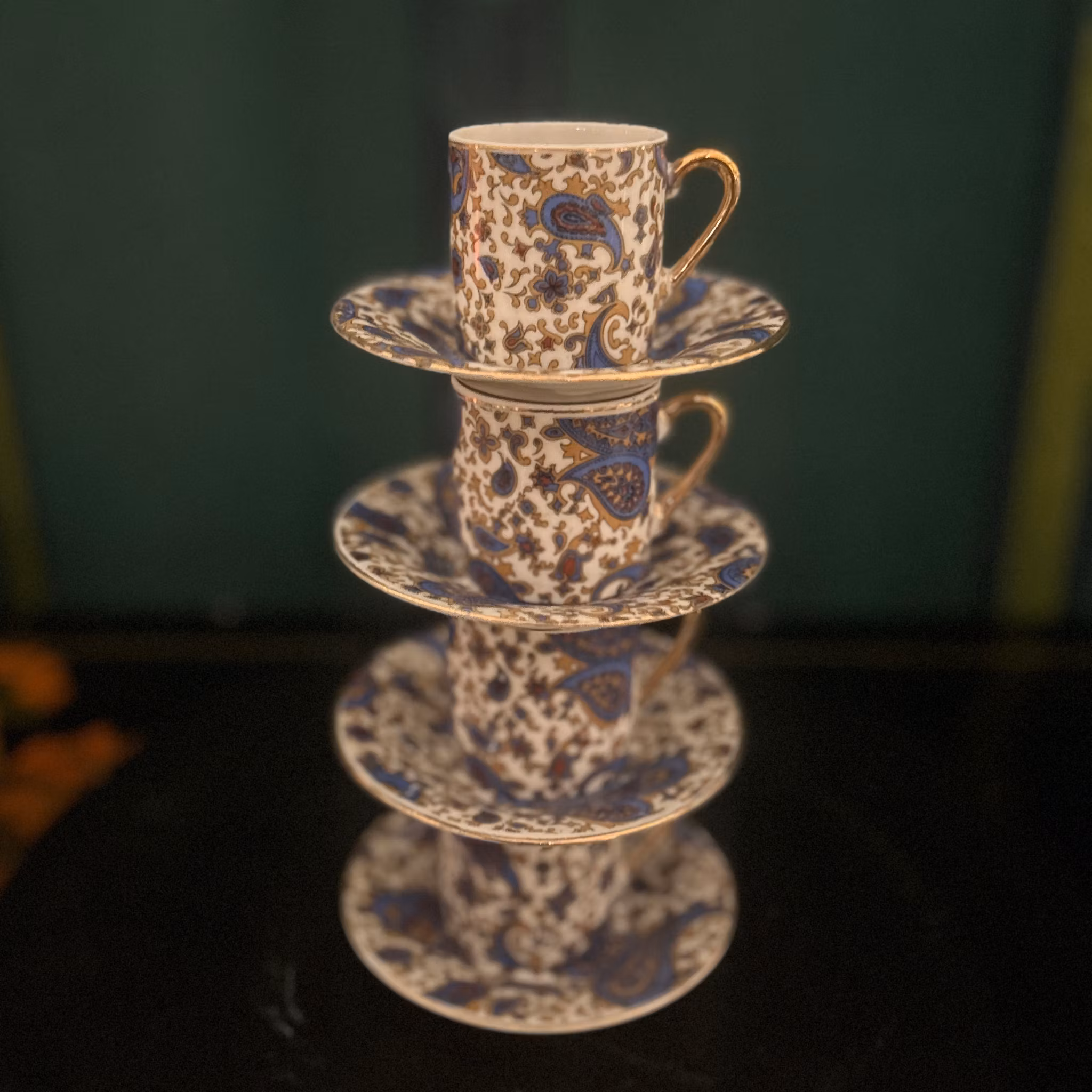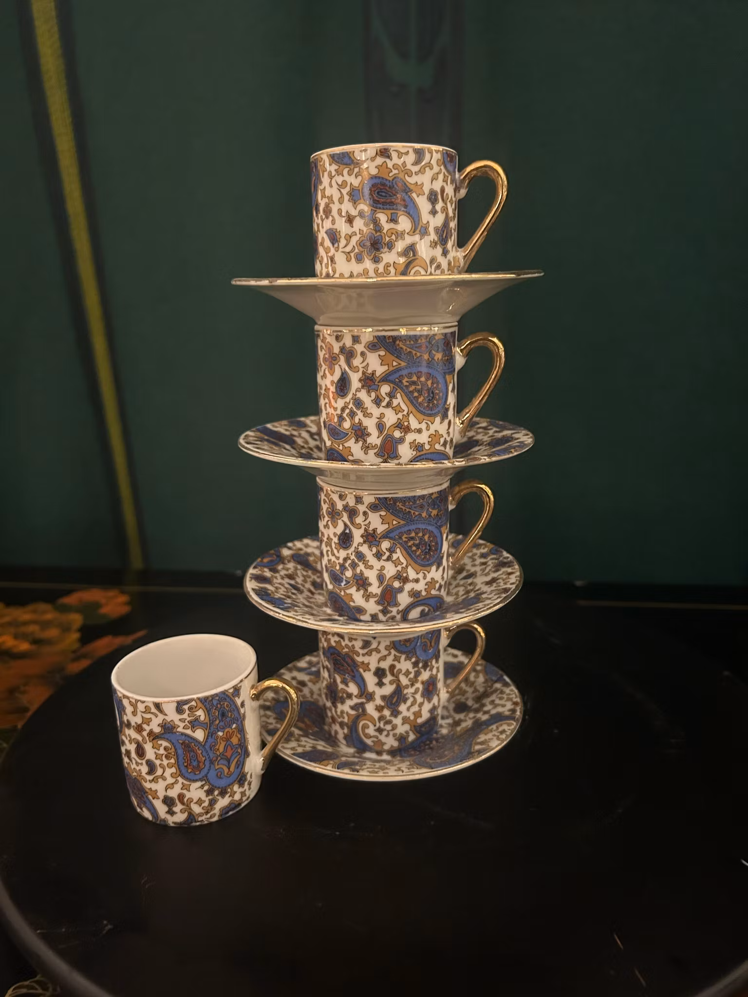 Fem stycken espressokoppar med paisleymönster och fat. Fem koppar endast fyra fat. Höjd: 5 cm, diameter: 5 cm. Fatets diameter: 11 cm. Bra skick.
