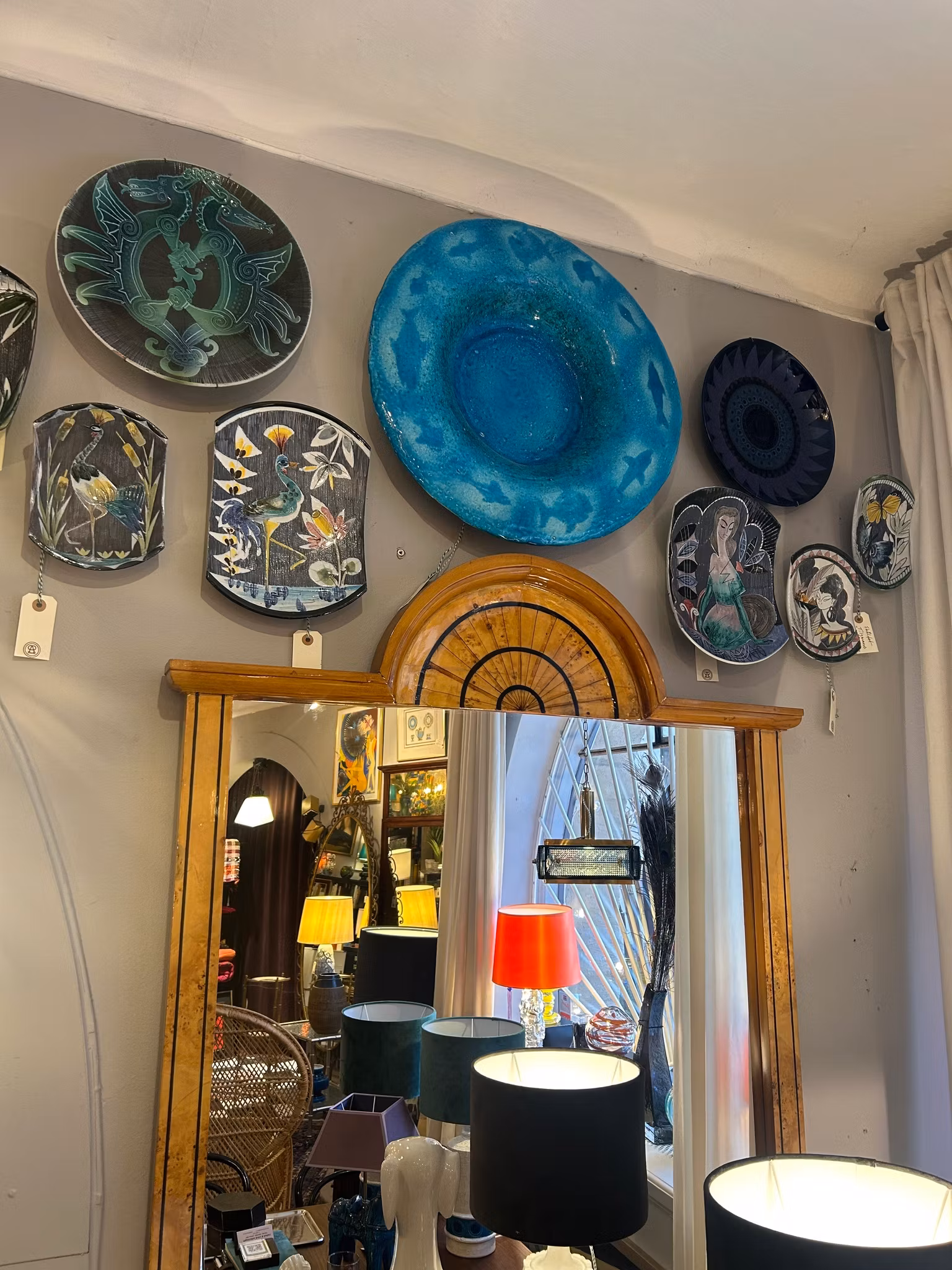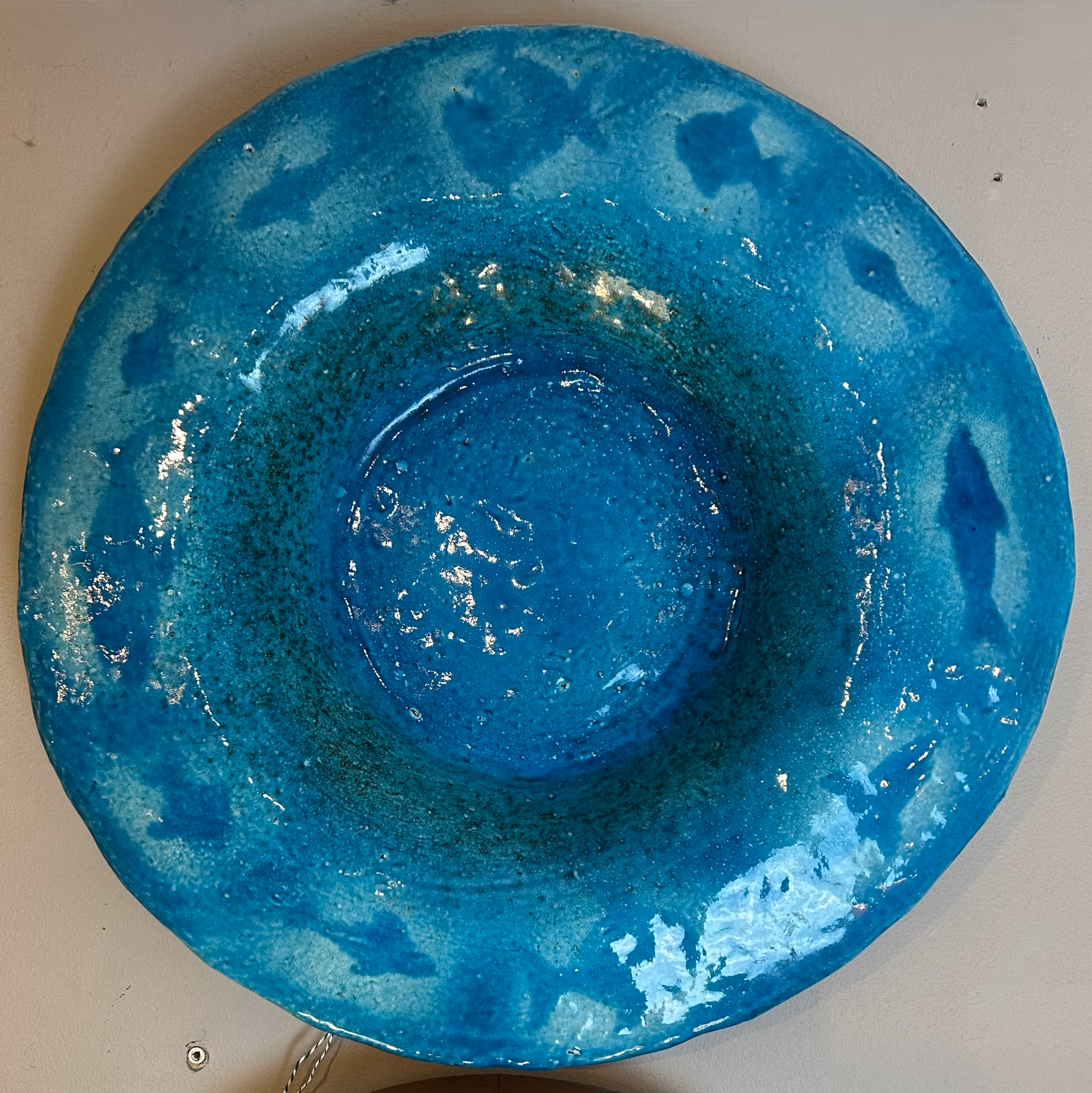 Stort italienskt keramikfat från Giovannacci med fiskmotiv, livfullt glaserad yta. Diameter: 55 cm.