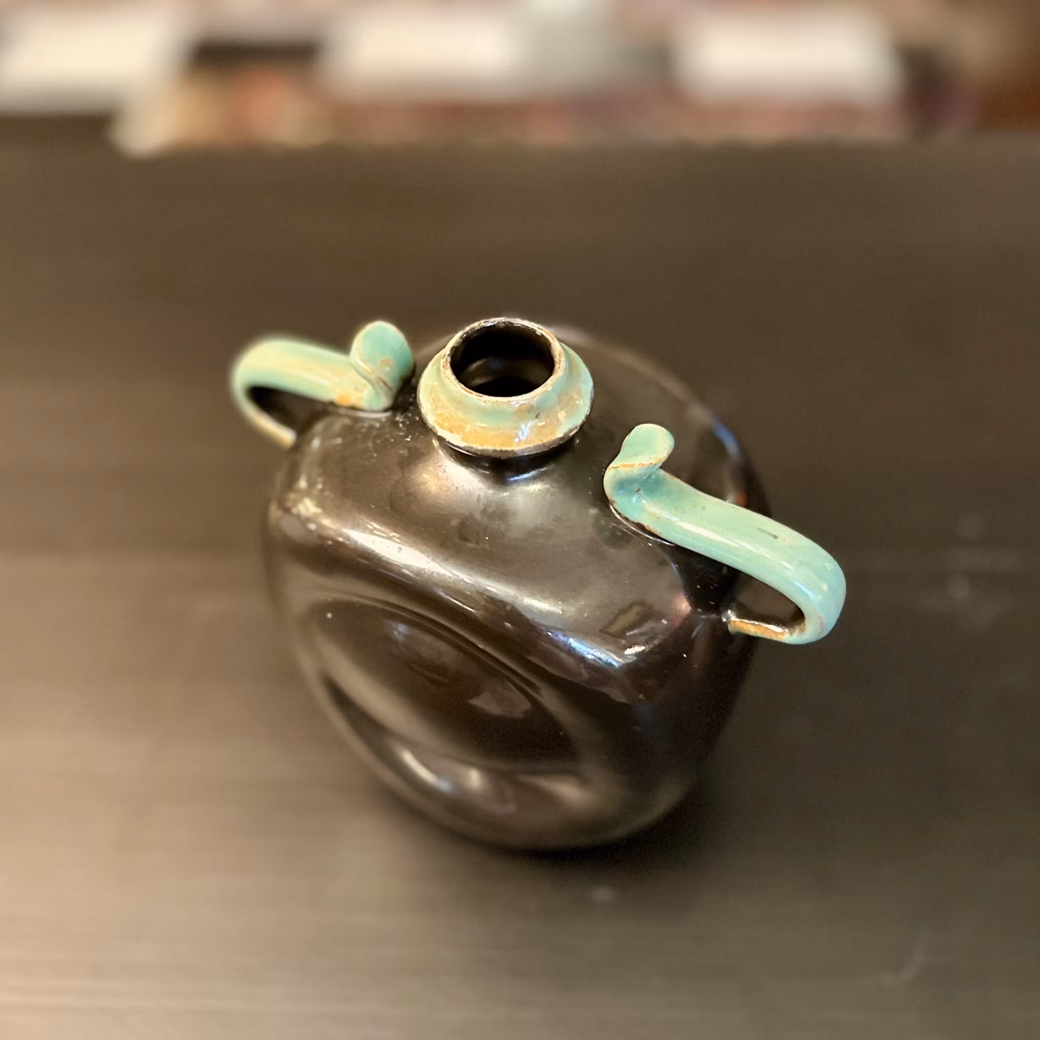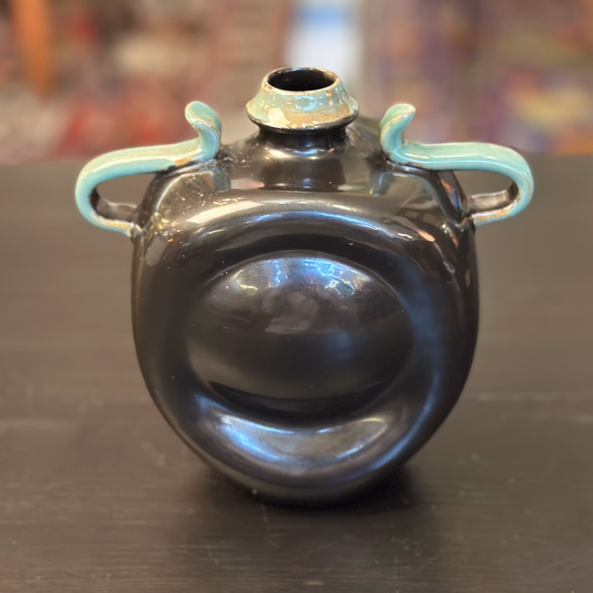 Elegant hänkelvas från Uppsala-Ekeby i svart-grön glasyr. Klassisk svensk keramik med tidlös design.