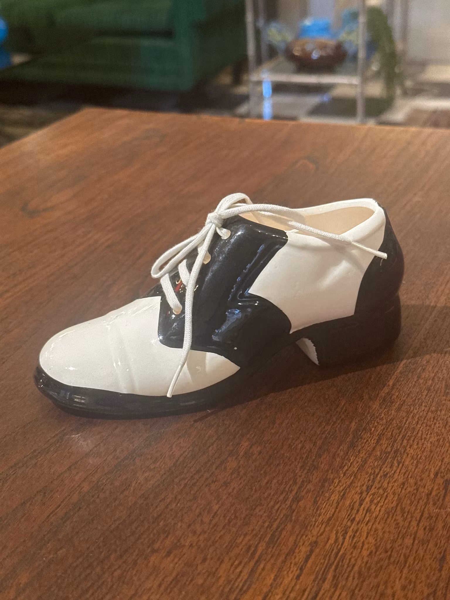 Svartvit porslinssko. Längd: 13 cm. Bra skick.