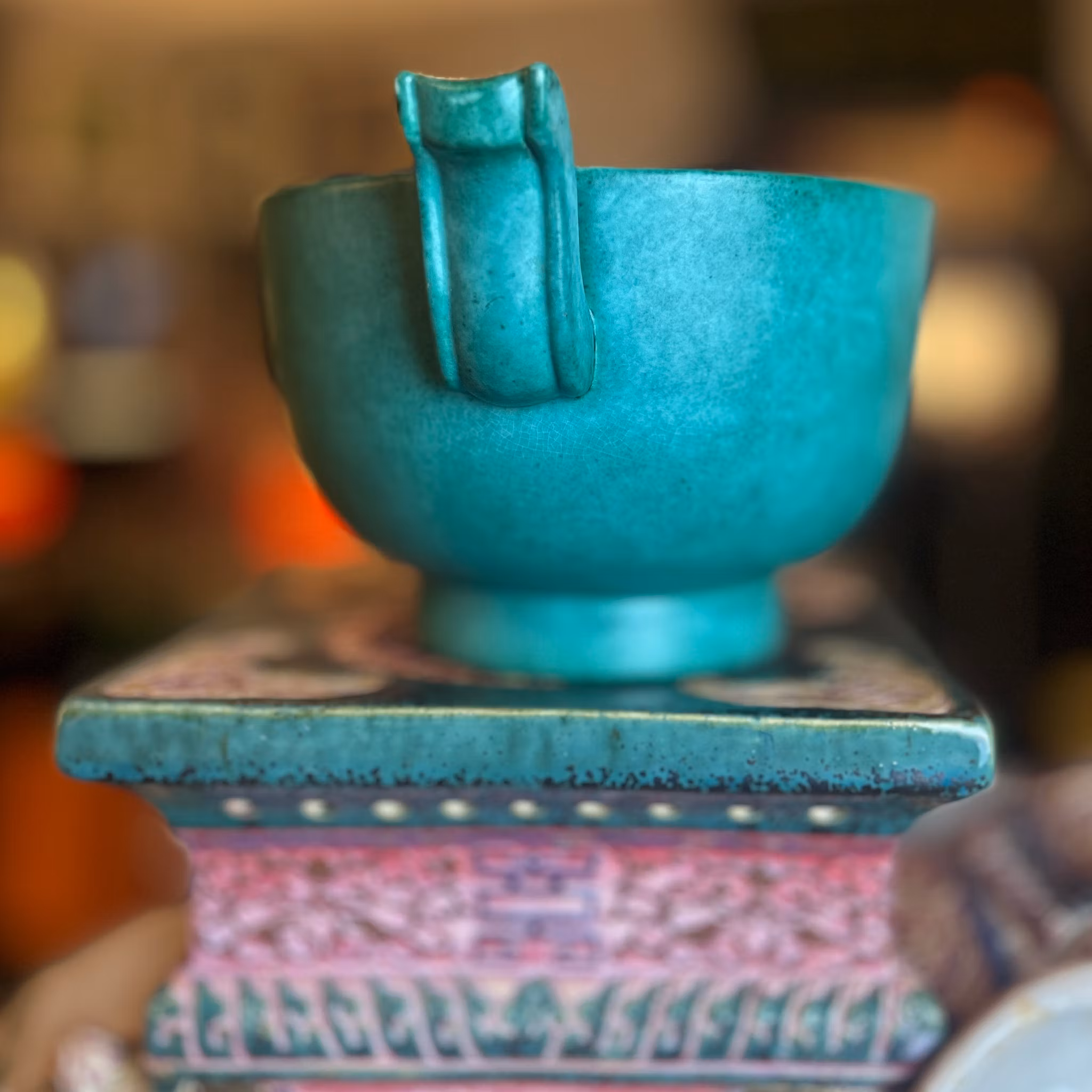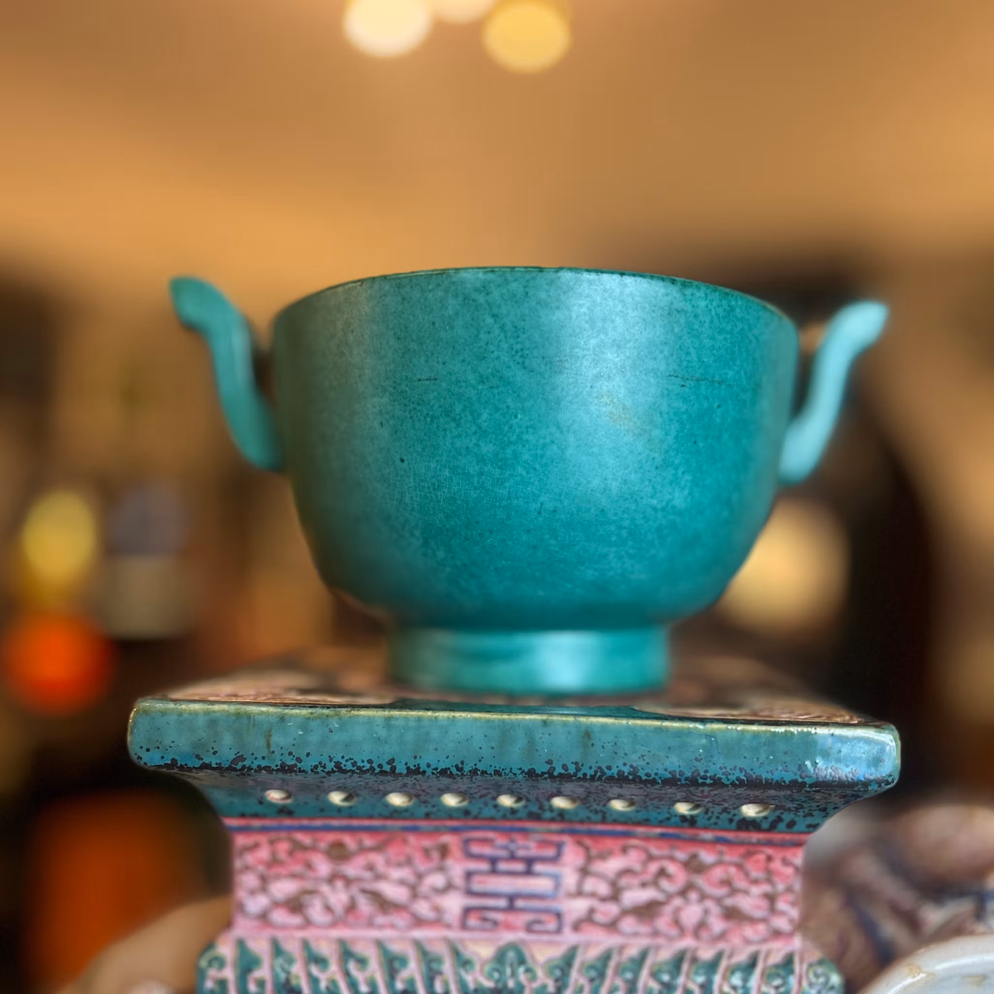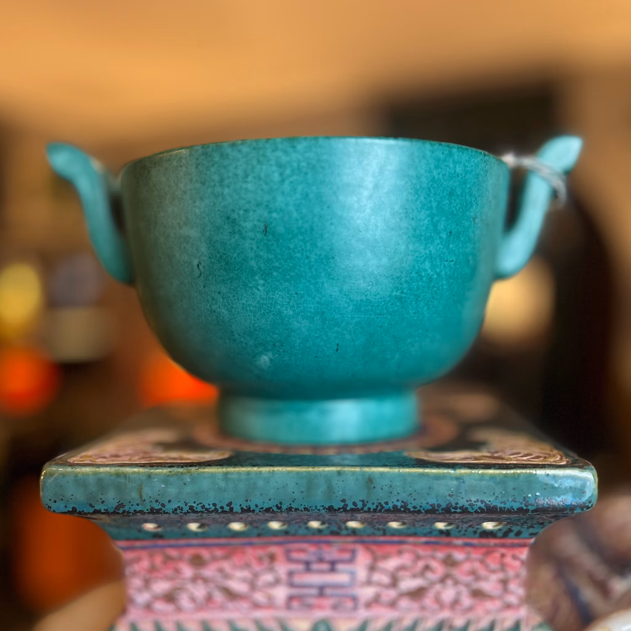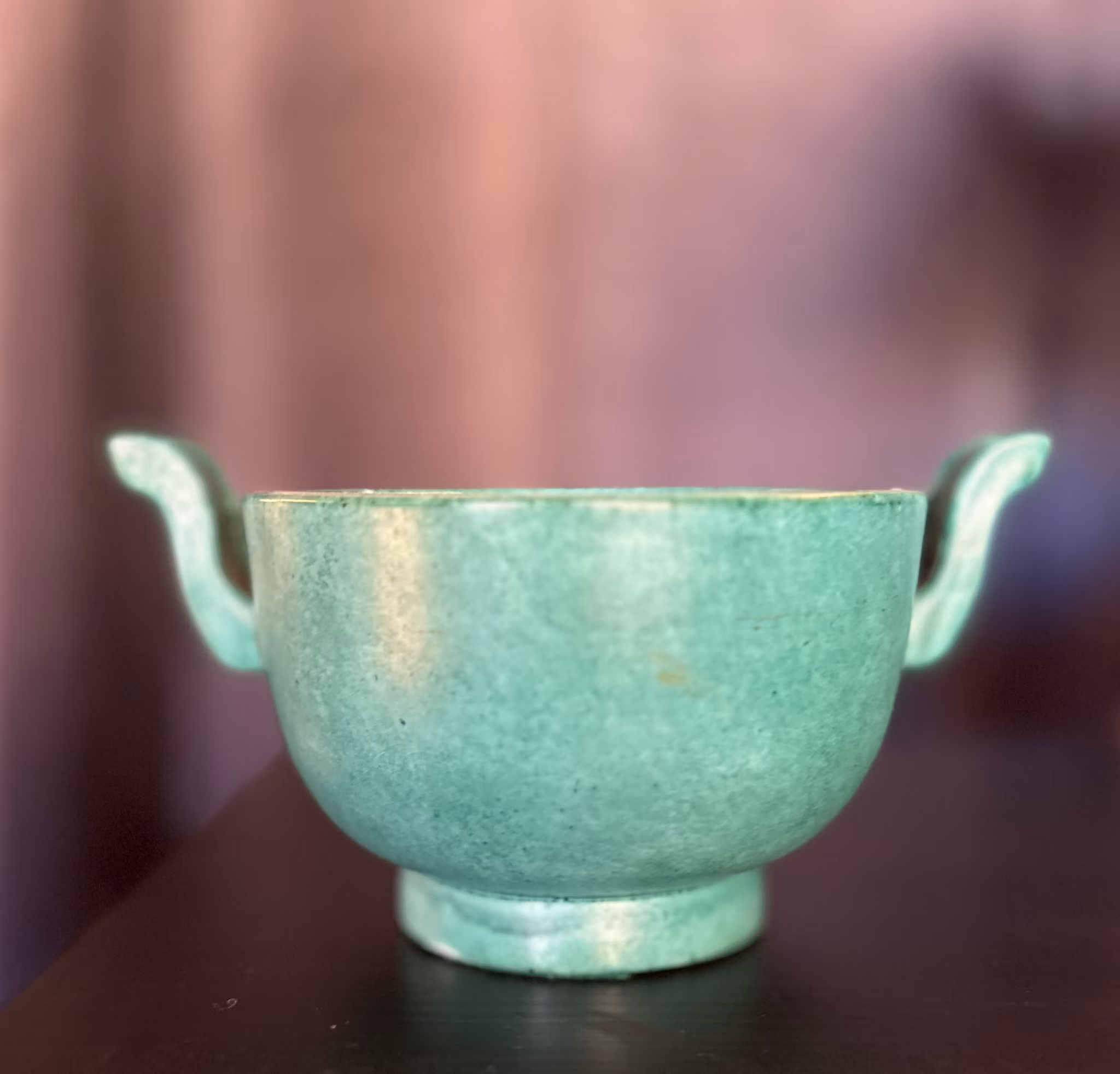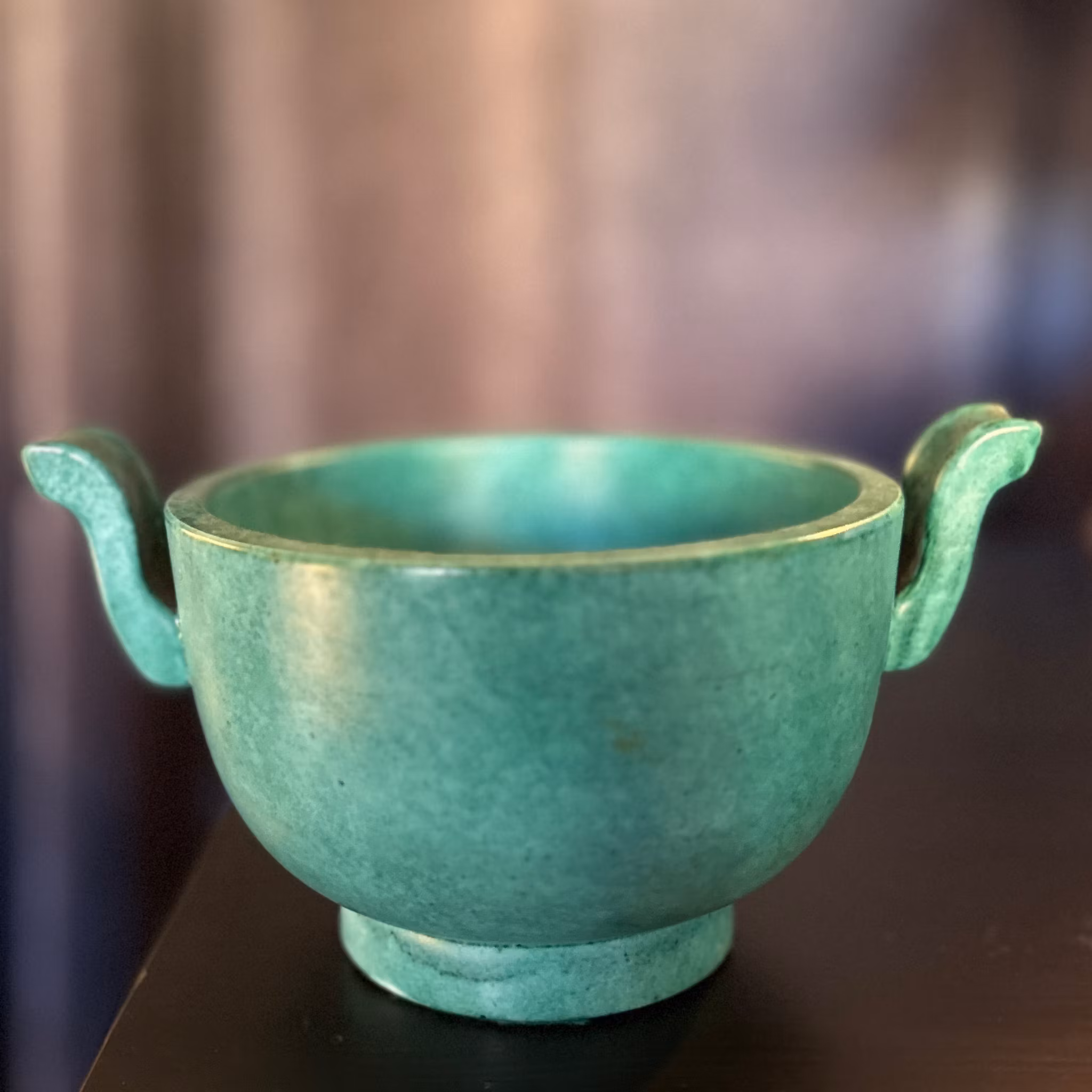 Hänkelskål i Gustavsberg-stengods, designade av Wilhelm Kåge. Grön glasyr och dekorativa detaljer.