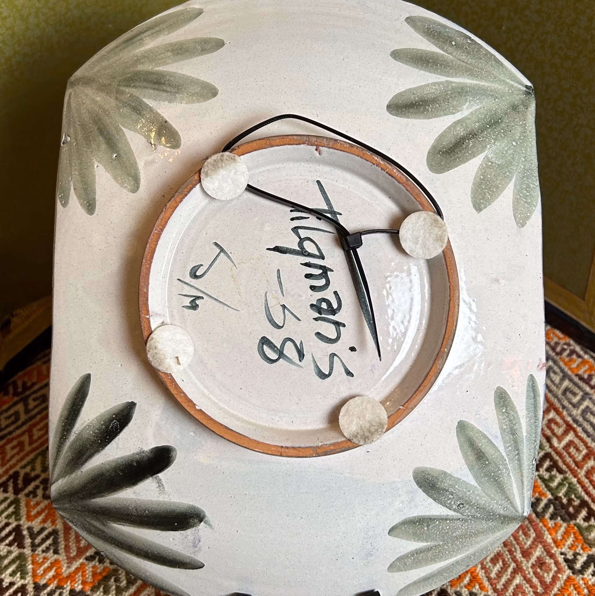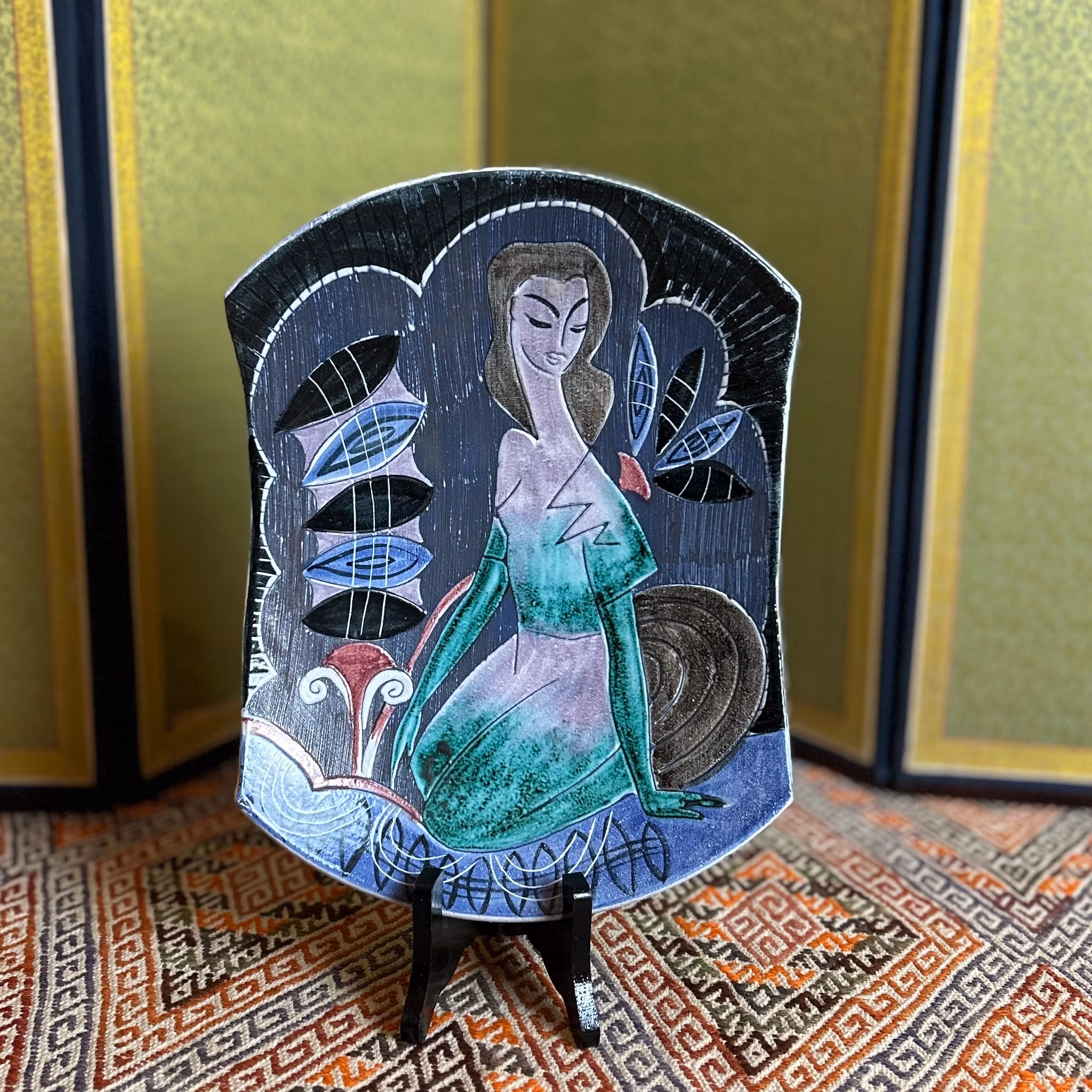 Vackert skålfat från 1958 av Tilgman Keramik med motiv av kvinna. Mått: 30x23 cm. Dekorativt och stilfullt.