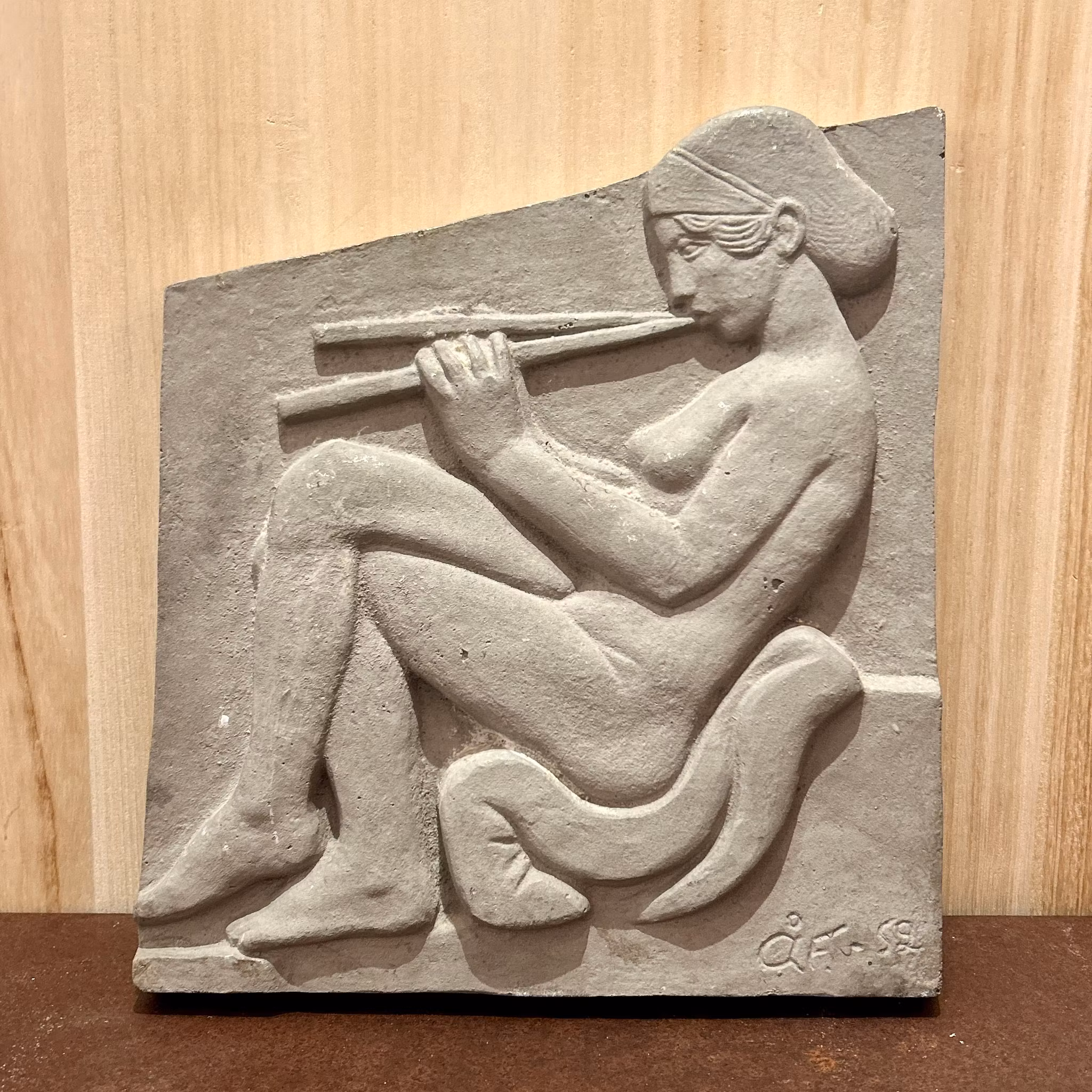 Väggskulptur Åke Falk signerad och daterad -52. Flöjtspelerka. 35x30