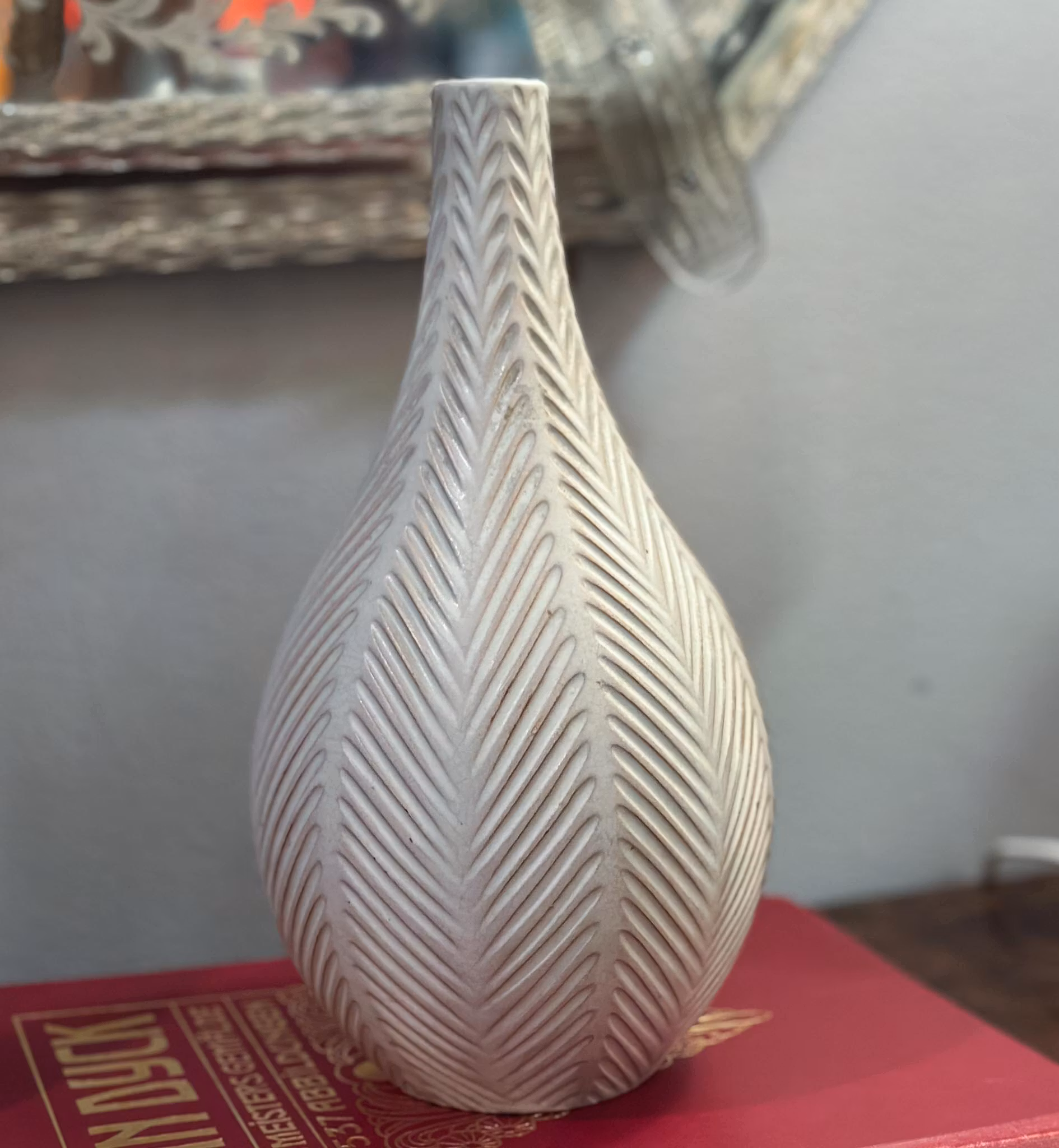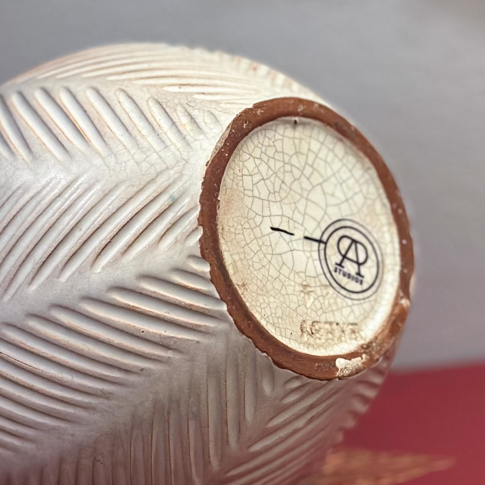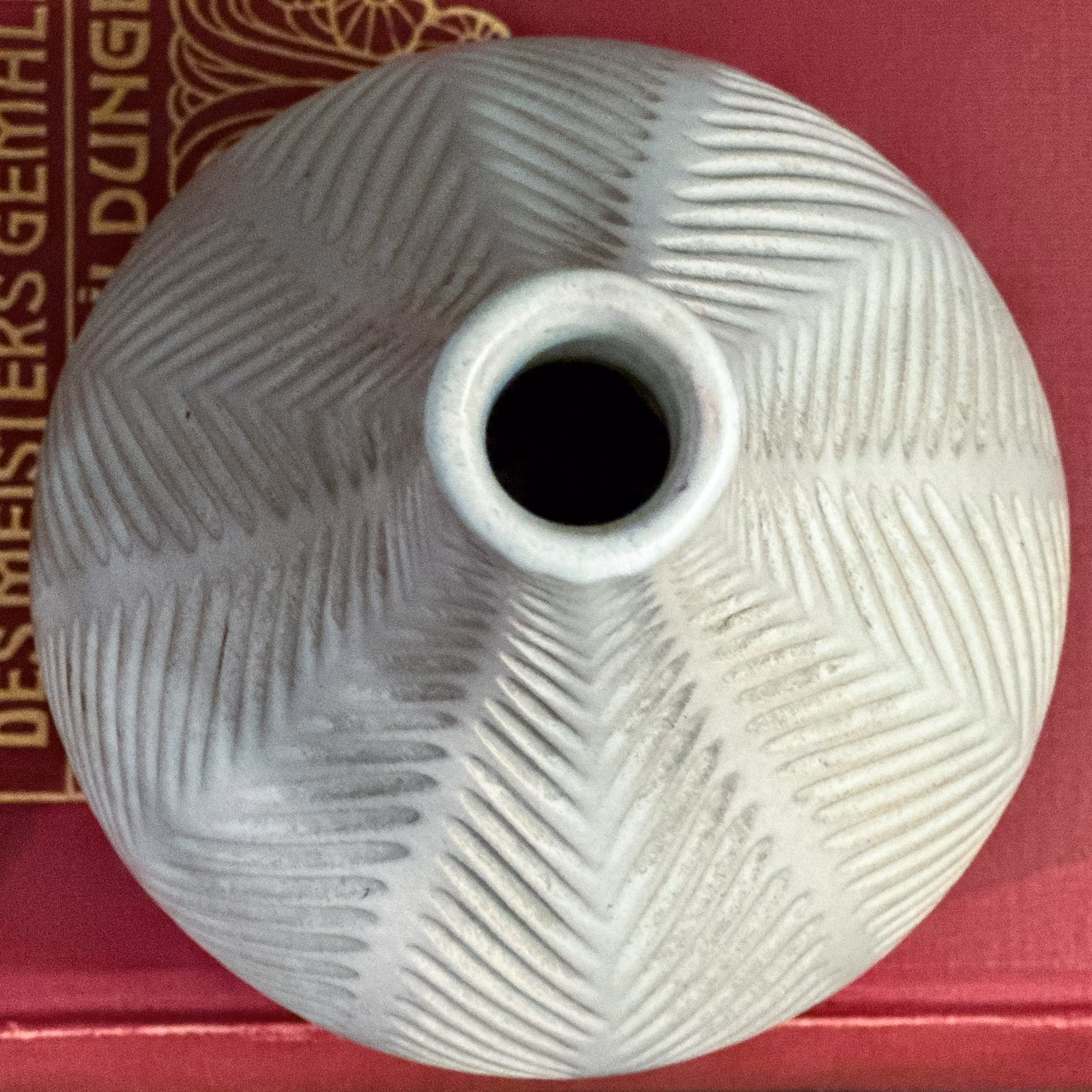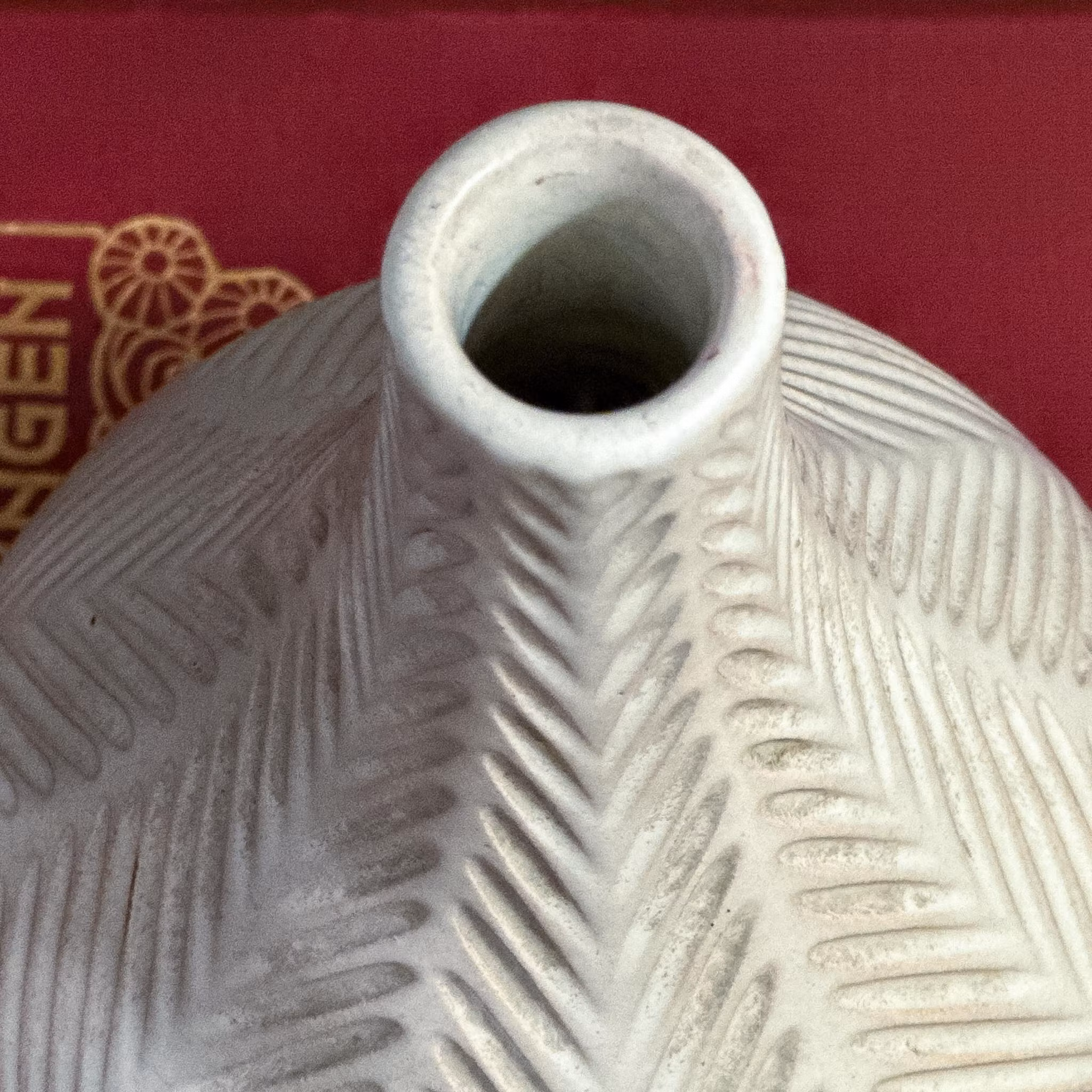 Vitglaserad vas med ristad dekor, designad av Anna-Lisa Thomson för Uppsala-Ekeby under 1930/40-talet.