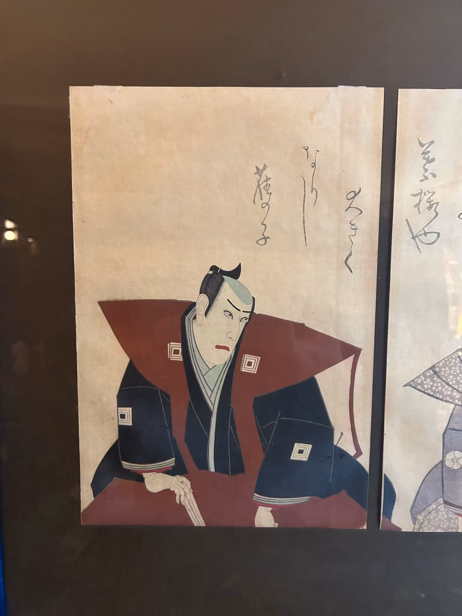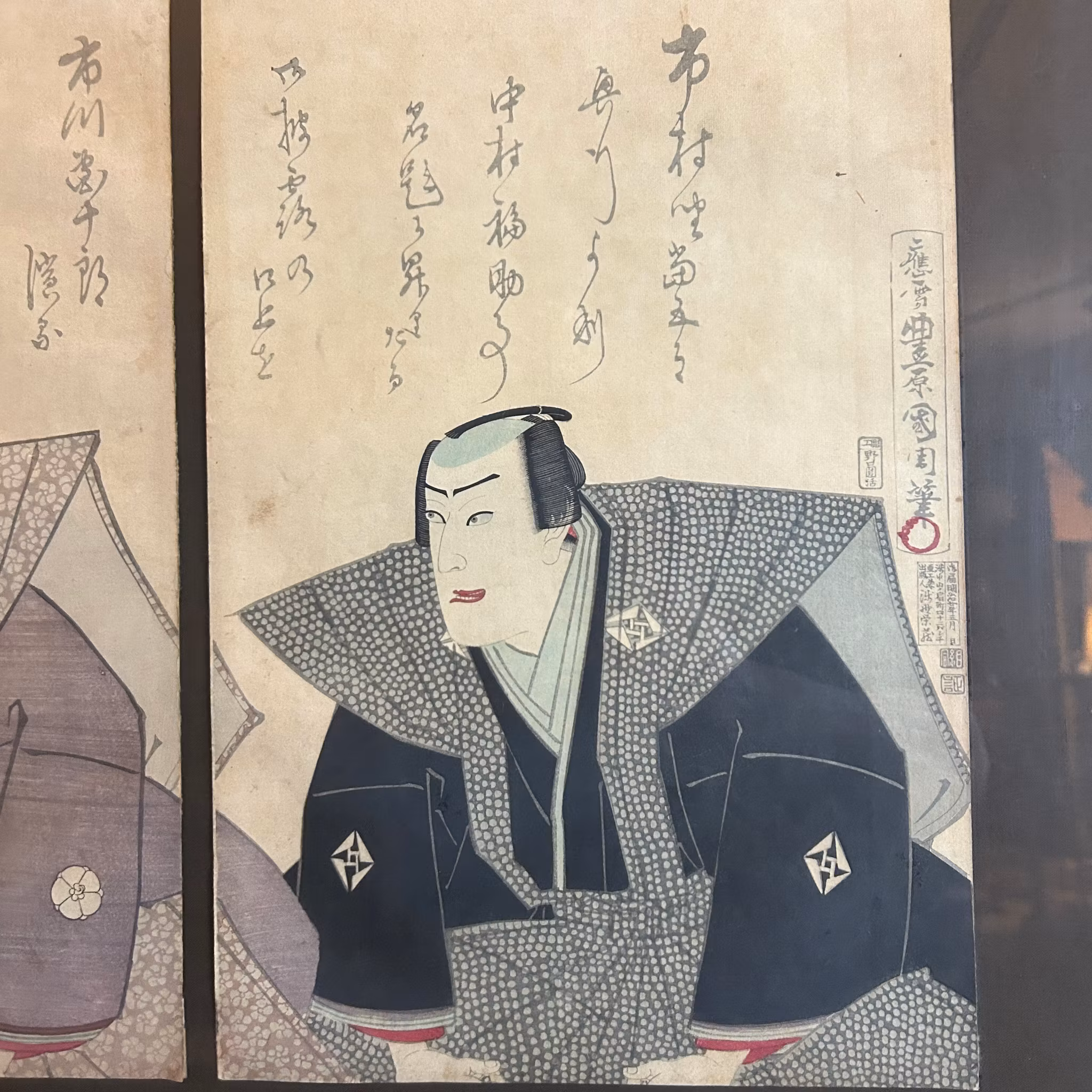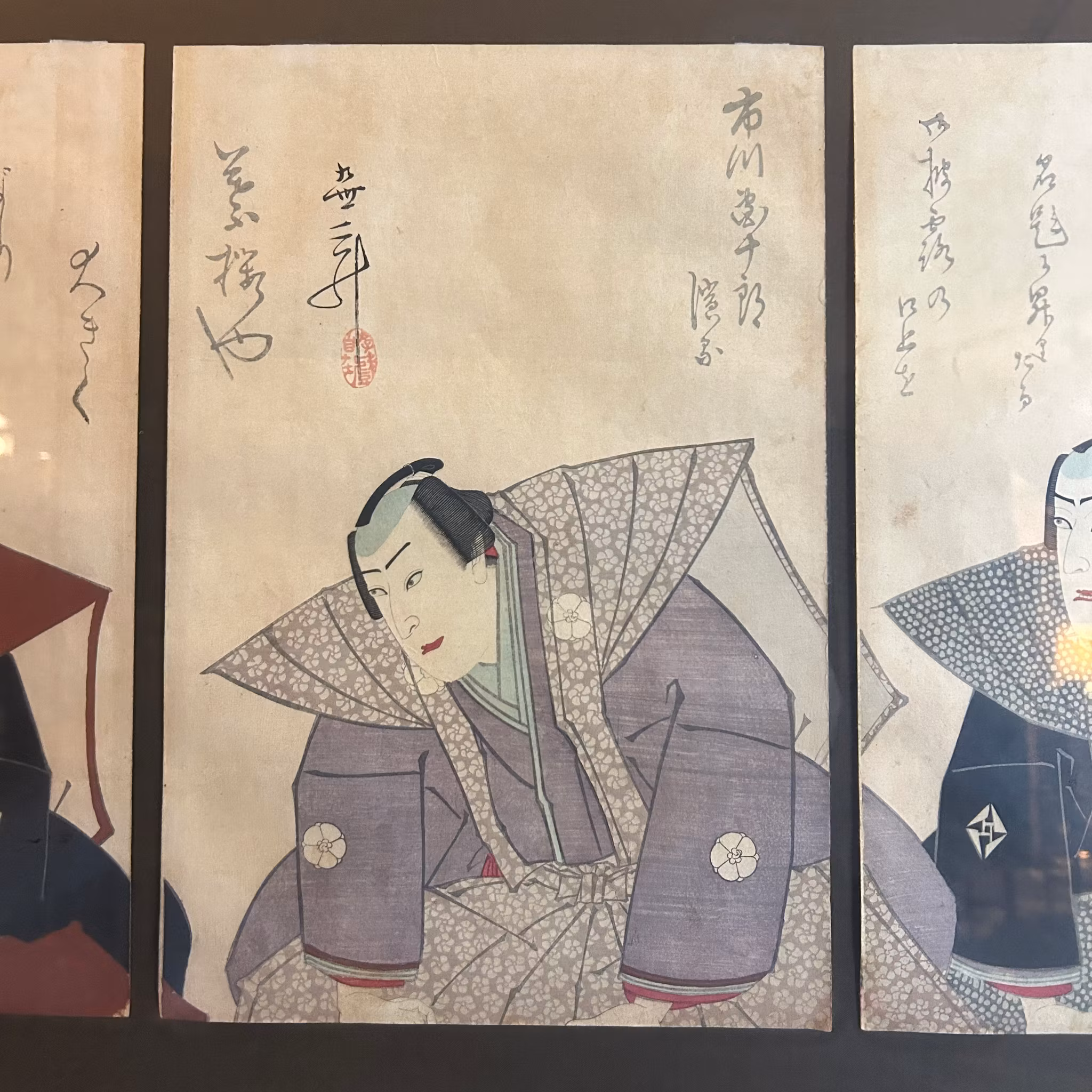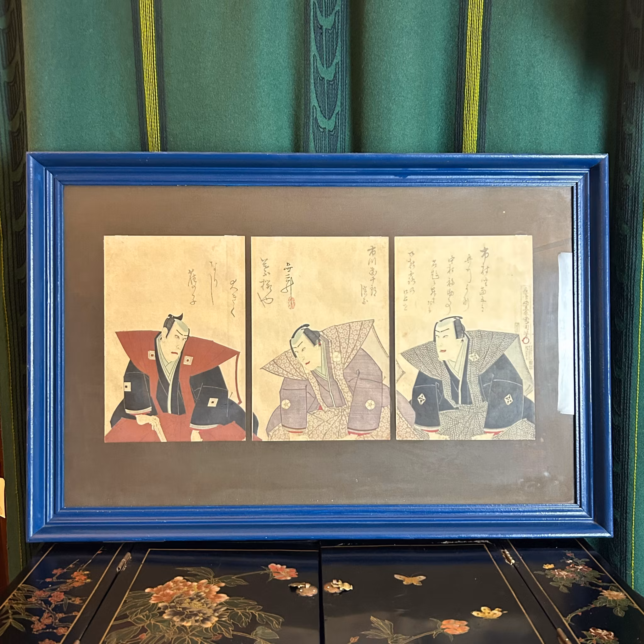 Vackert japanskt träsnitt i triptykformat, rikt på detaljer och traditionell estetik. Yttermått inkl ram: 65x98 cm.
