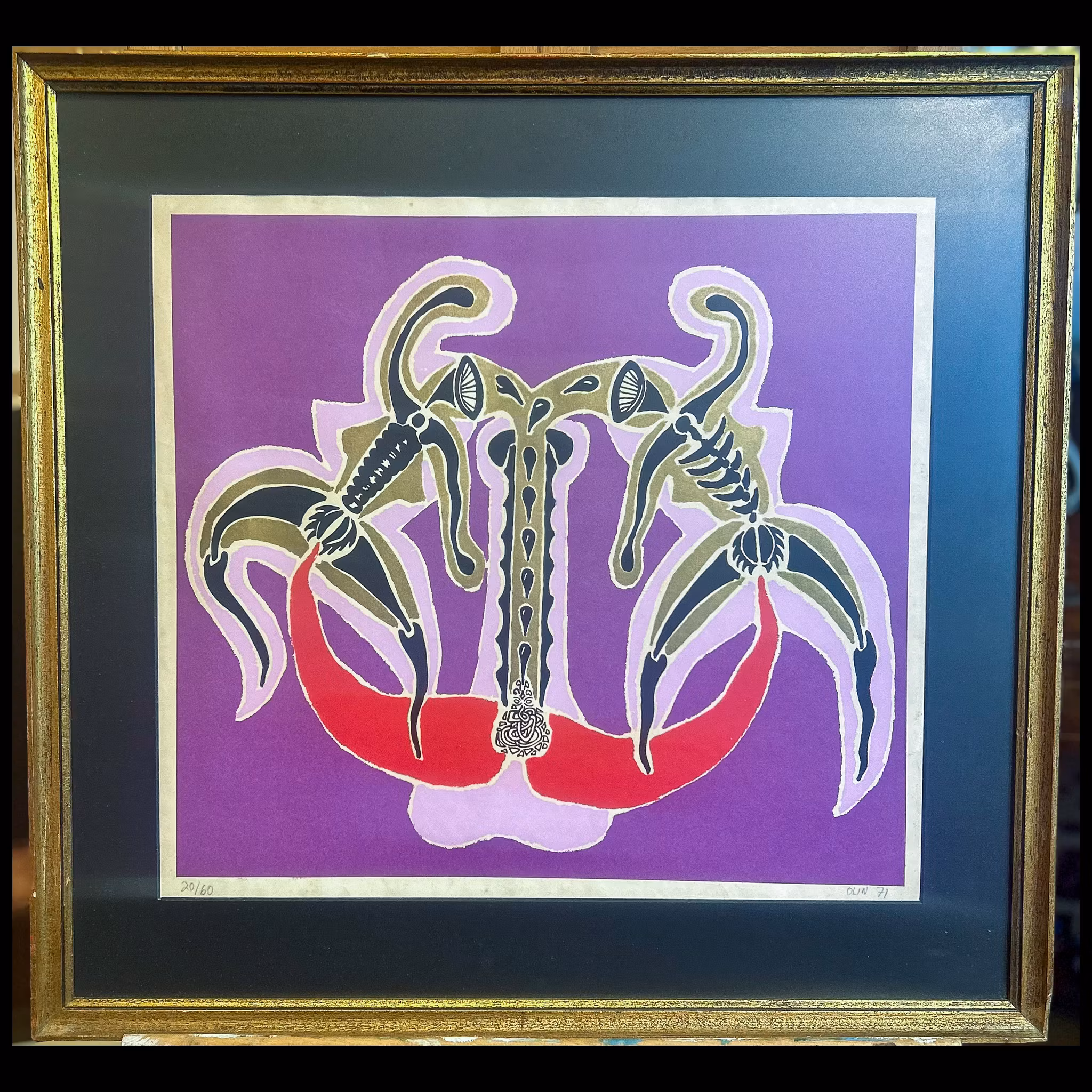 Signerad och numrerad Olin 20/60, färglitografi med abstrakt motiv. Bildmått: 38x41 cm, yttermått inkl ram: 55x58 cm.