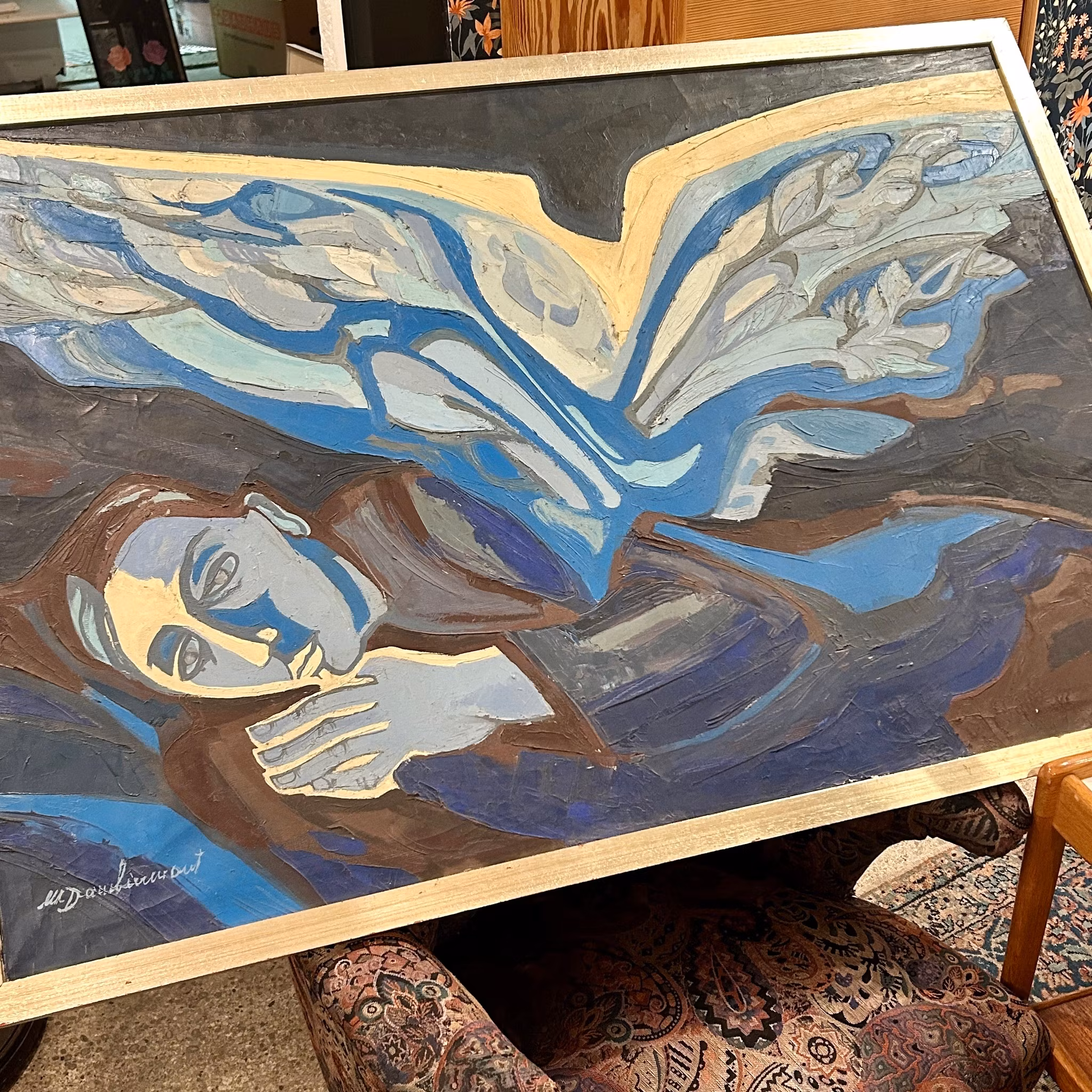 Stor och uttrycksfull oljemålning på duk av Mary Dambienmont. Mått: 80x120 cm (inkl. ram: 86x125 cm).