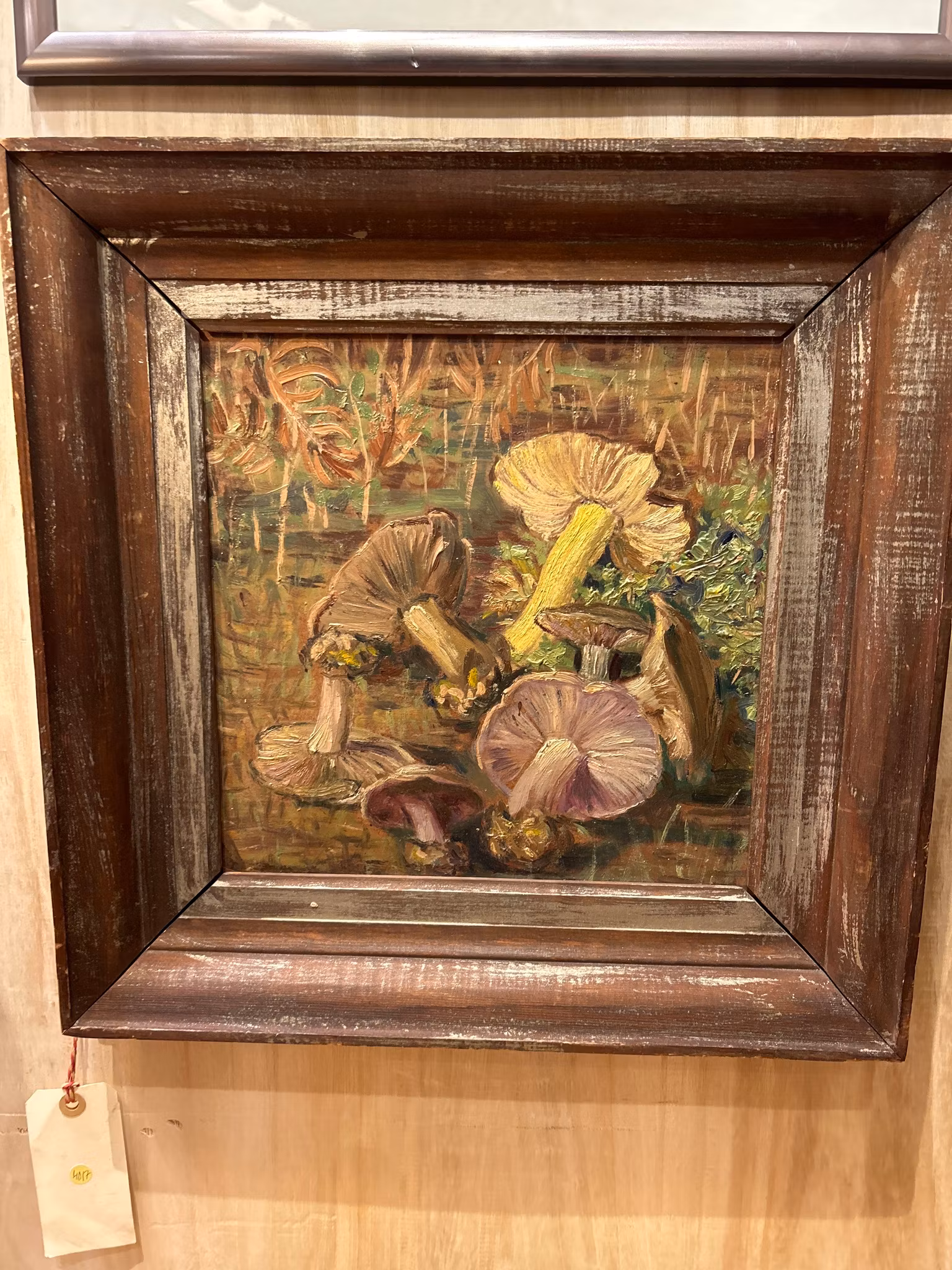Charmig oljemålning av Elsa Nordenfelt föreställande svampar, signerad a tergo, olja på pannå, 27x28 cm, yttermått inkl ram: 44x45 cm.