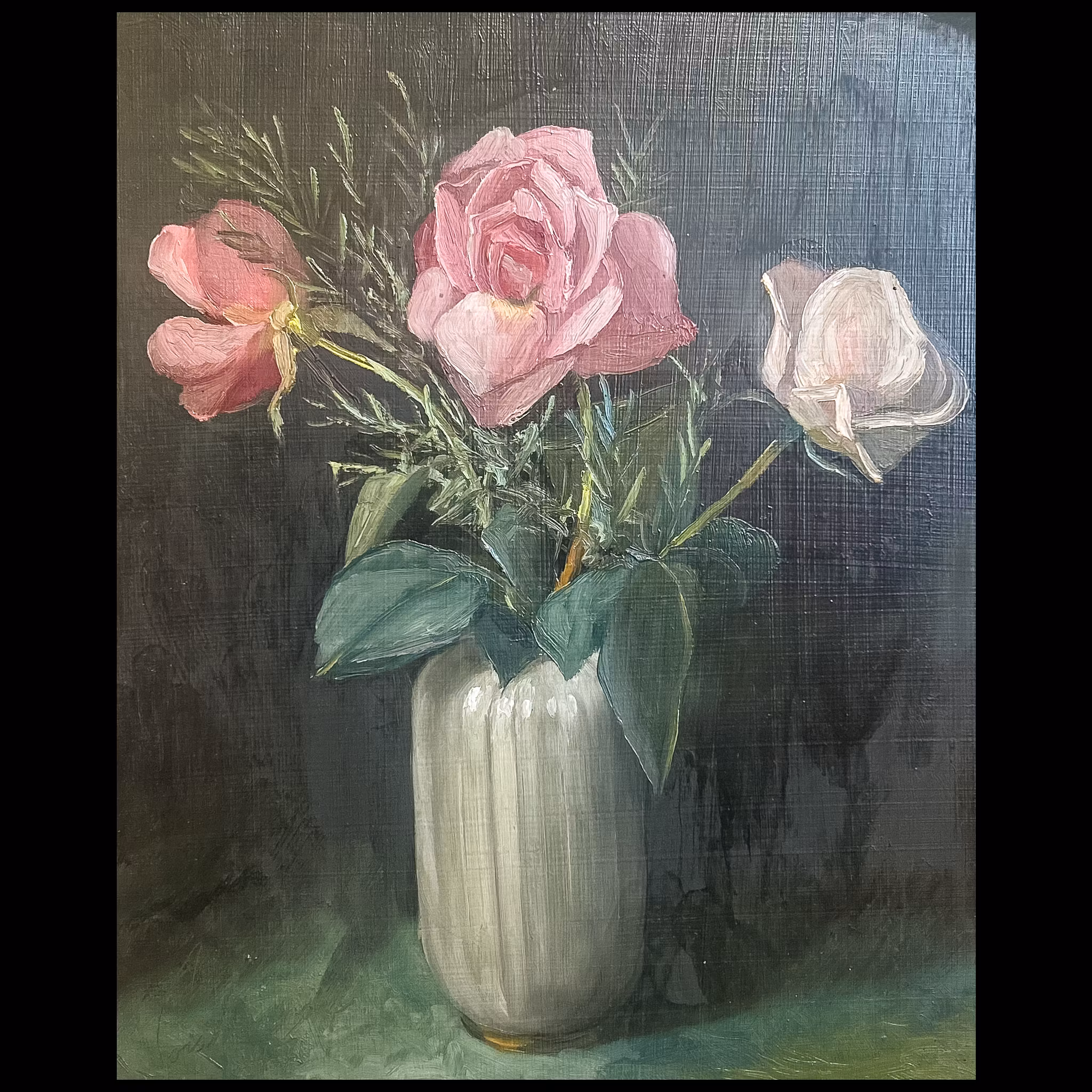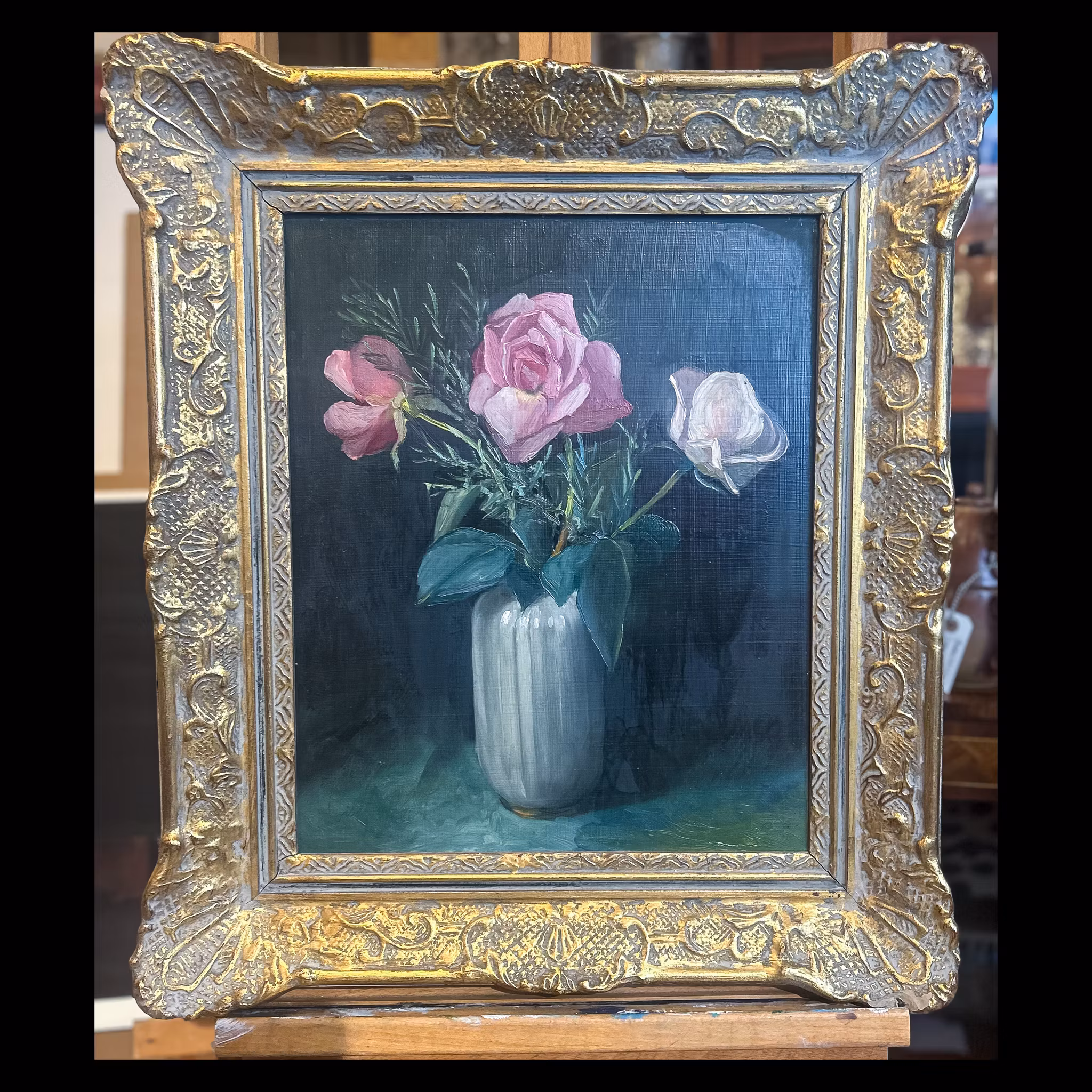 Signerad oljemålning av oidentifierad konstnär. Motiv: stilleben med rosor. Olja på panna, mått: 45x36 cm, yttermått inklusive ram: 64x56 cm.