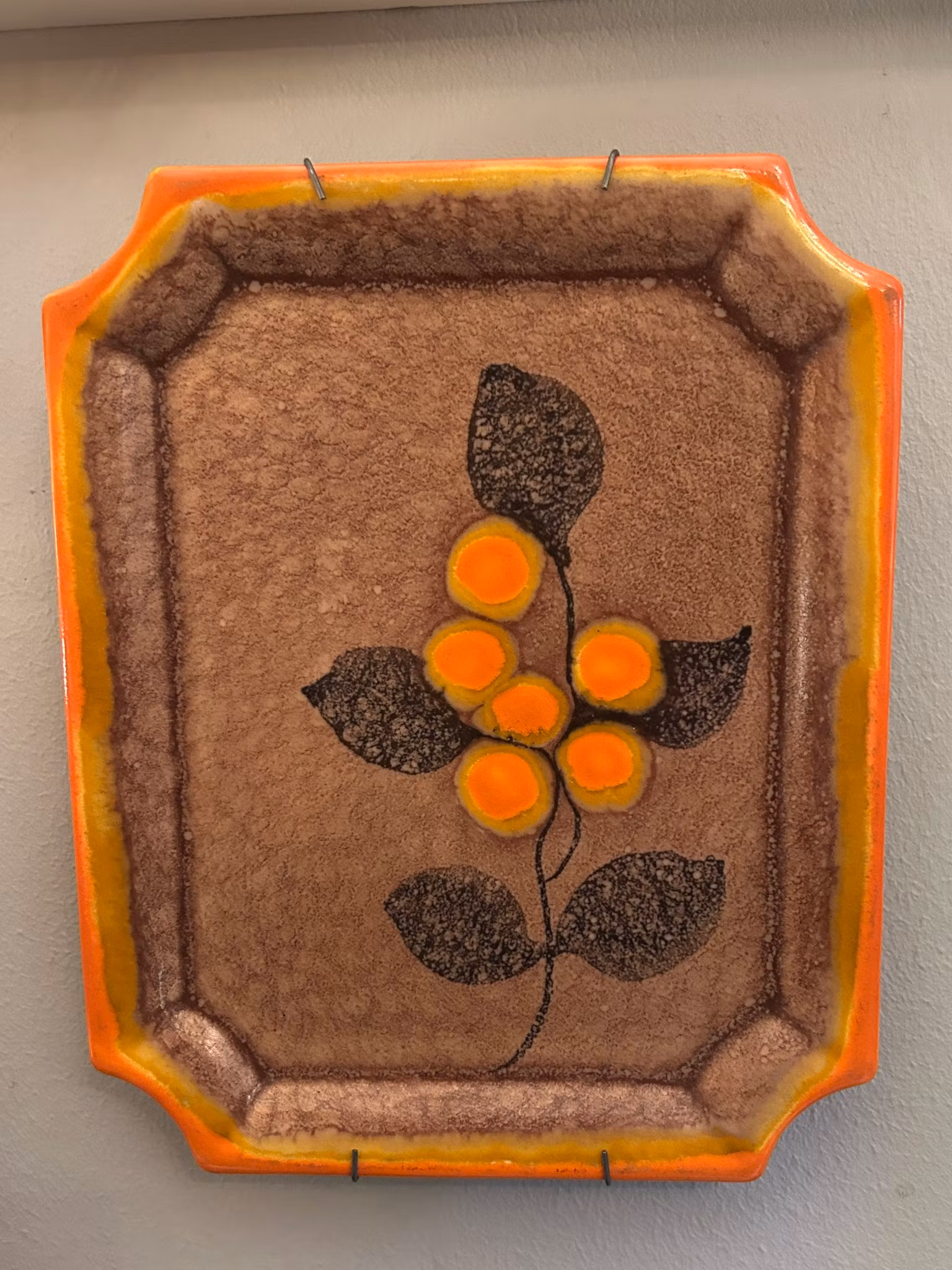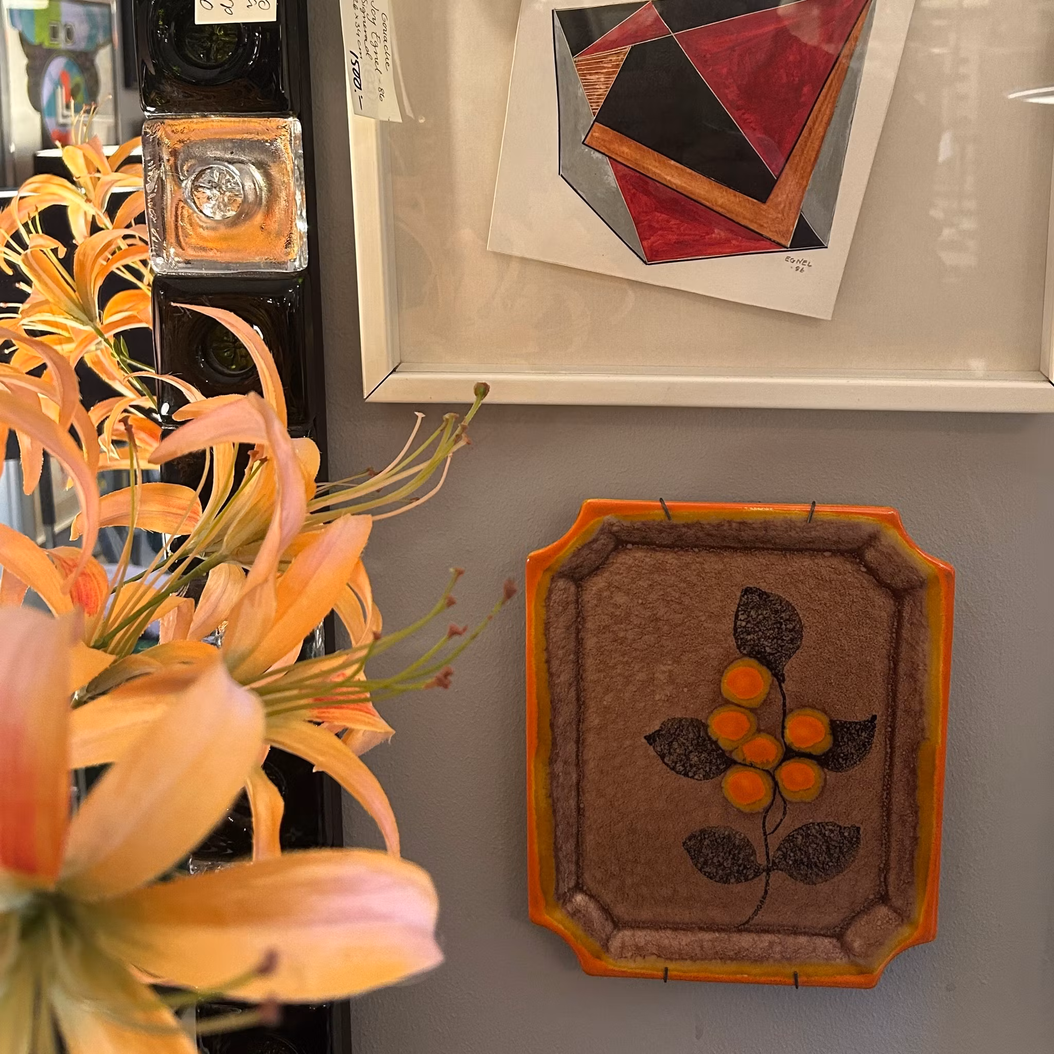 Dekorativ orange väggtallrik med unik och konstnärlig design. Ett färgstarkt tillskott till samlingen.
