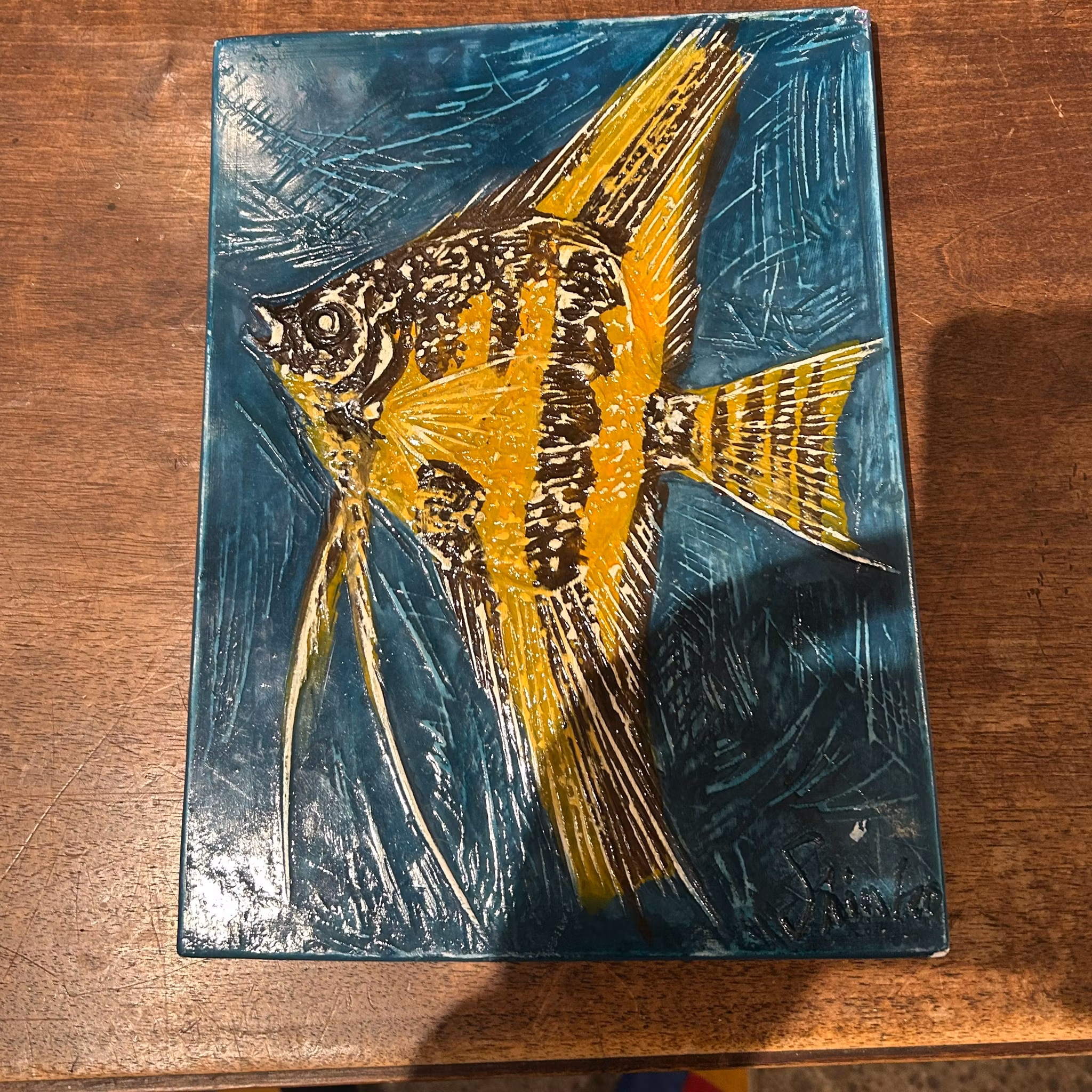 En väggplatta med fiskmotiv. 22x31 cm. Bruksslitage med små nagg i hörnorna.