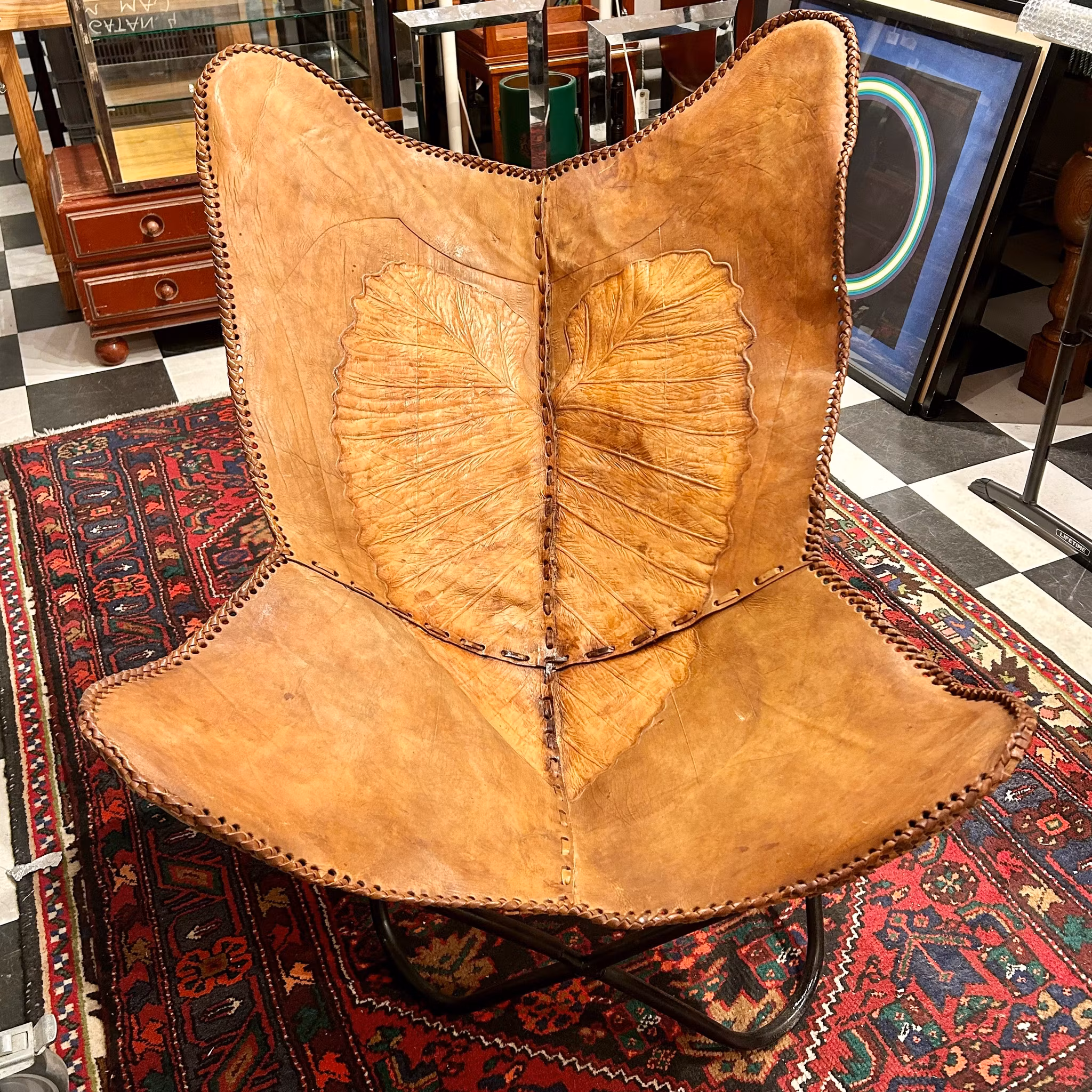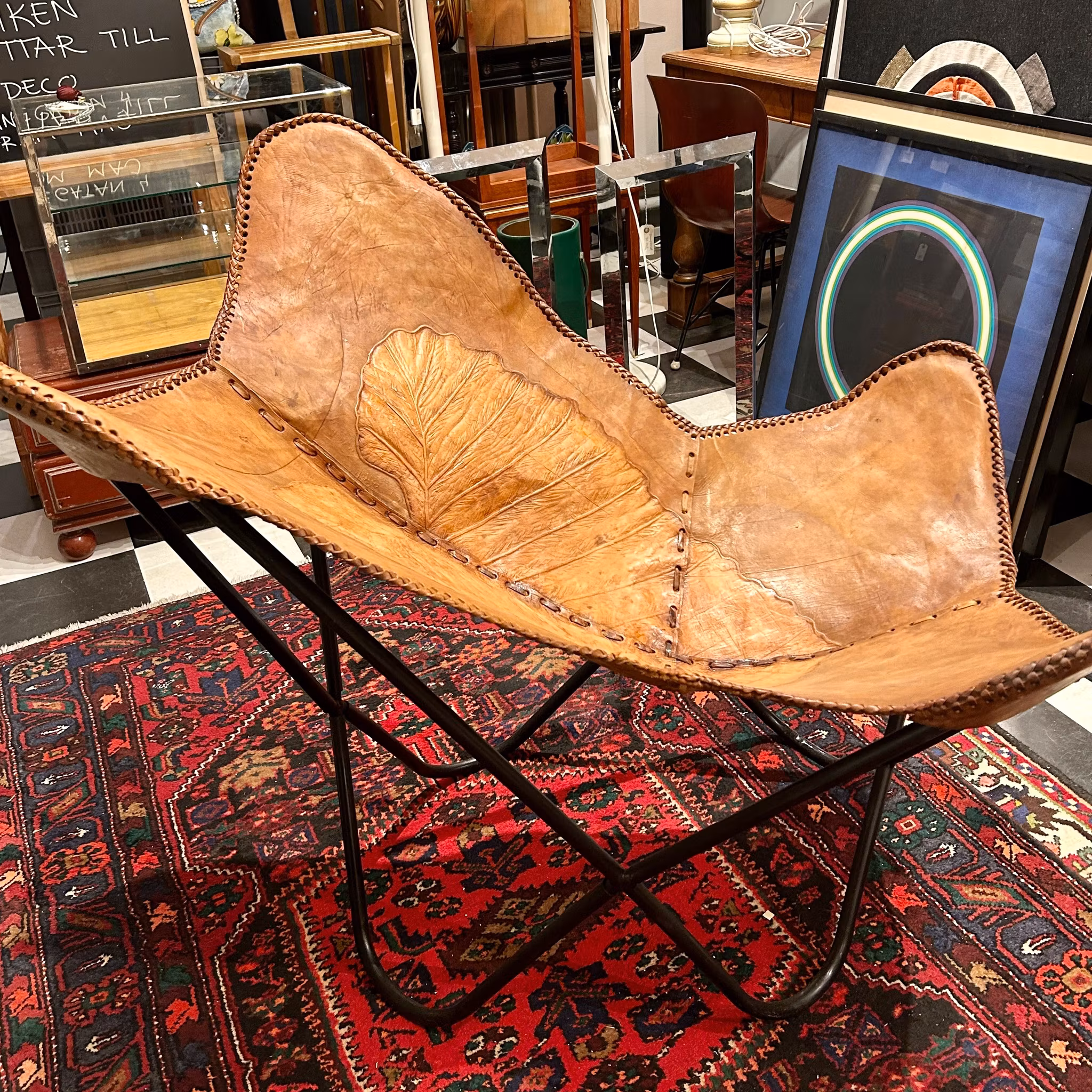 Fladdermusfåtölj i naturfärgat läder med laskade sömmar och ett präglat löv. Troligen Argentina.