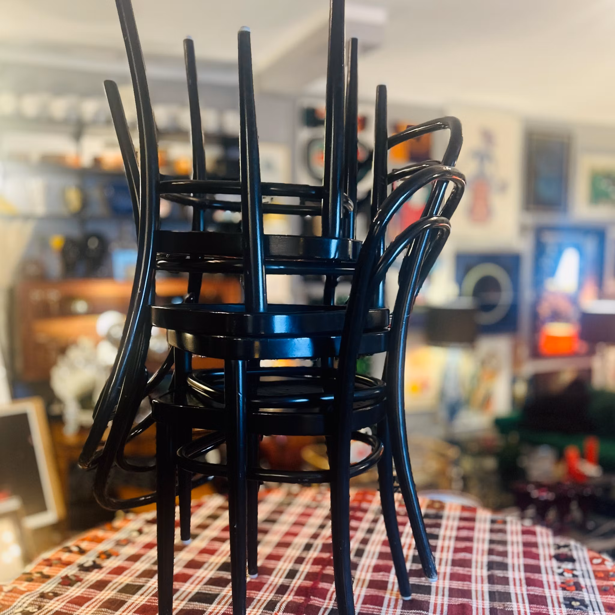 Fyra Thonet-stolar No 214 i svartlackad bok. Märkta Thonet 91 Germany. Normalt bruksslitage.