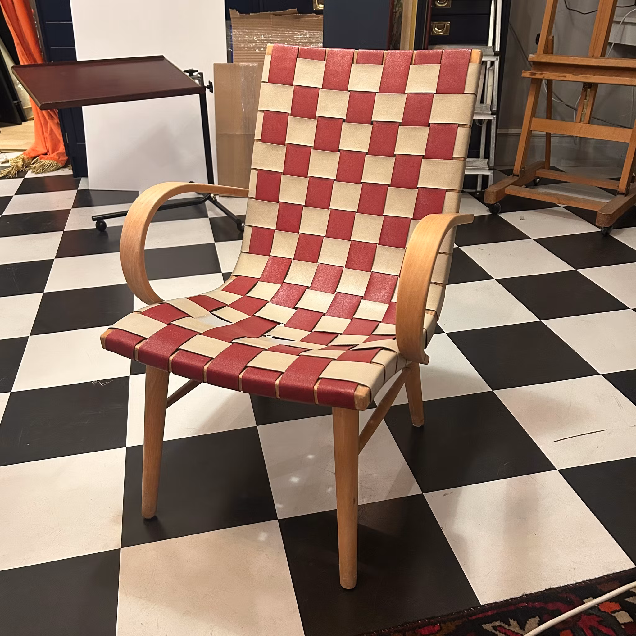 Karmstol 50- tal med flätad sits i läder liknande material. Karmar i böjträ