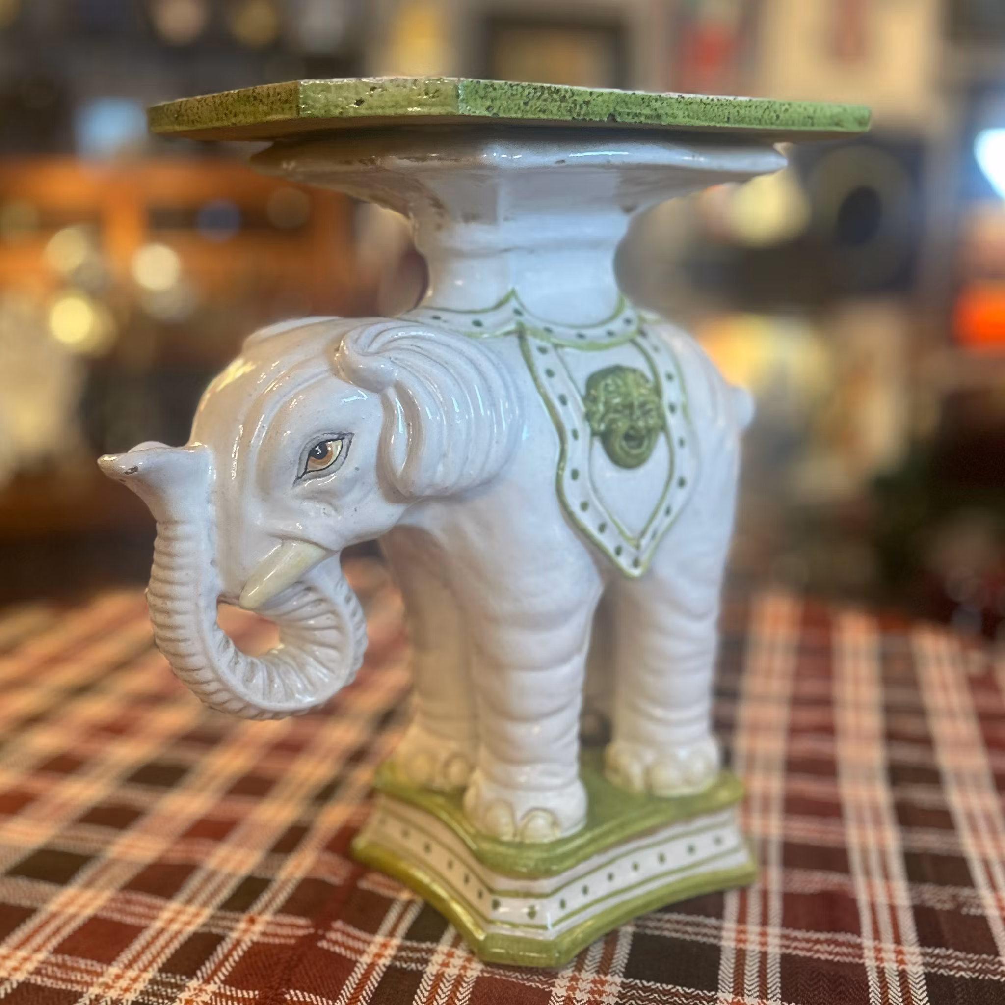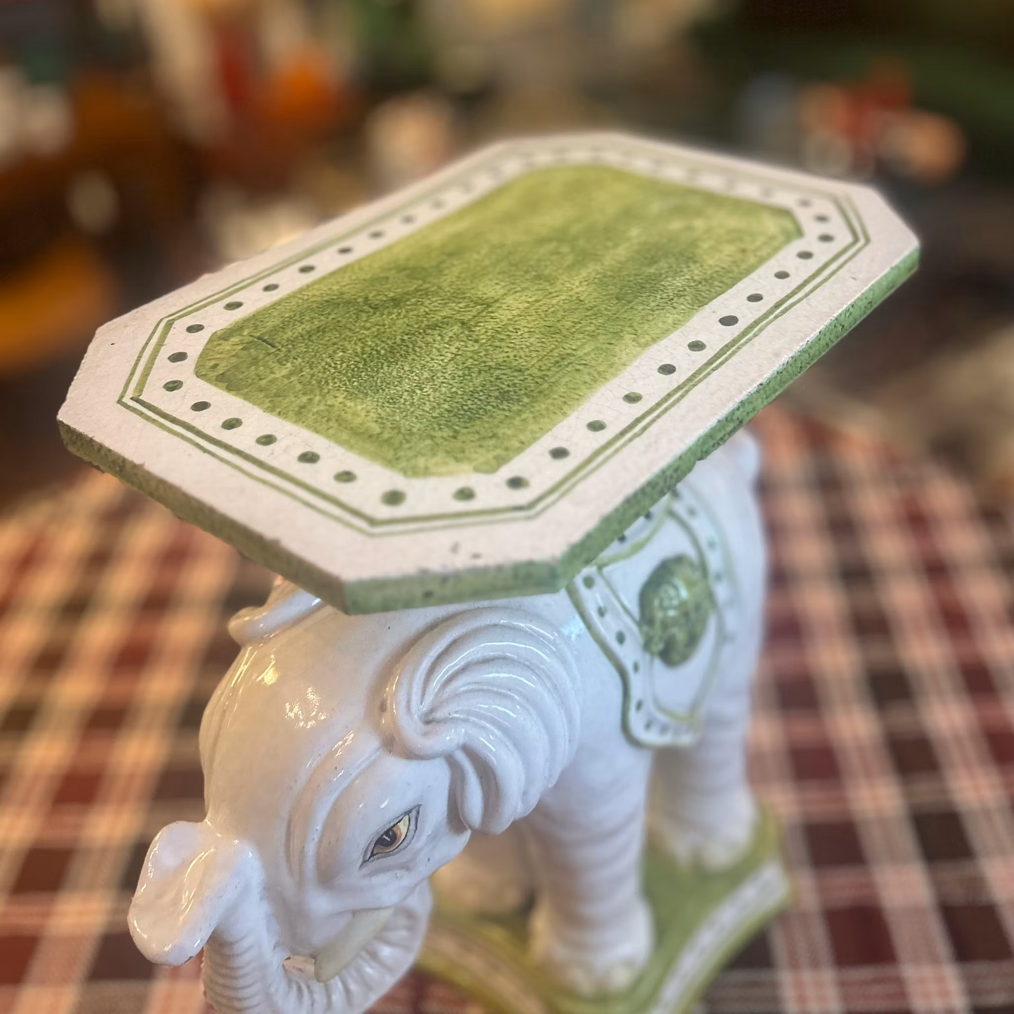 Ett lampbord formad som en glaserad elefant i grönt och vitt. Fotnagg.Mått: B:53 cm, Dj:30 cm, H:51 cm