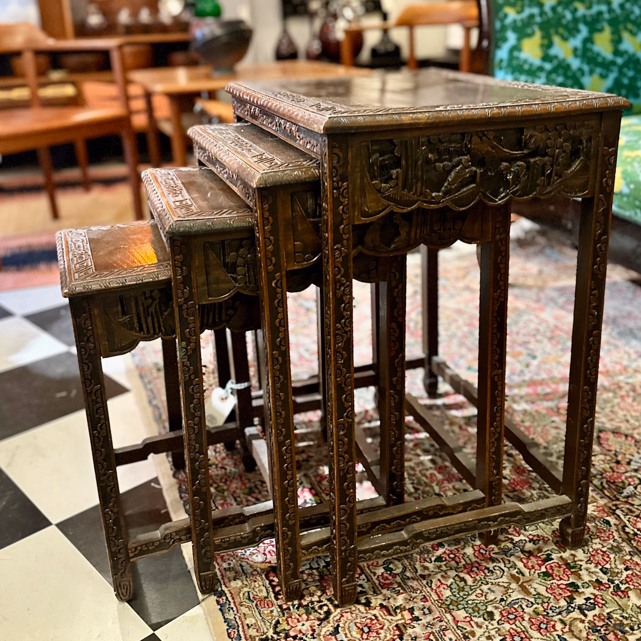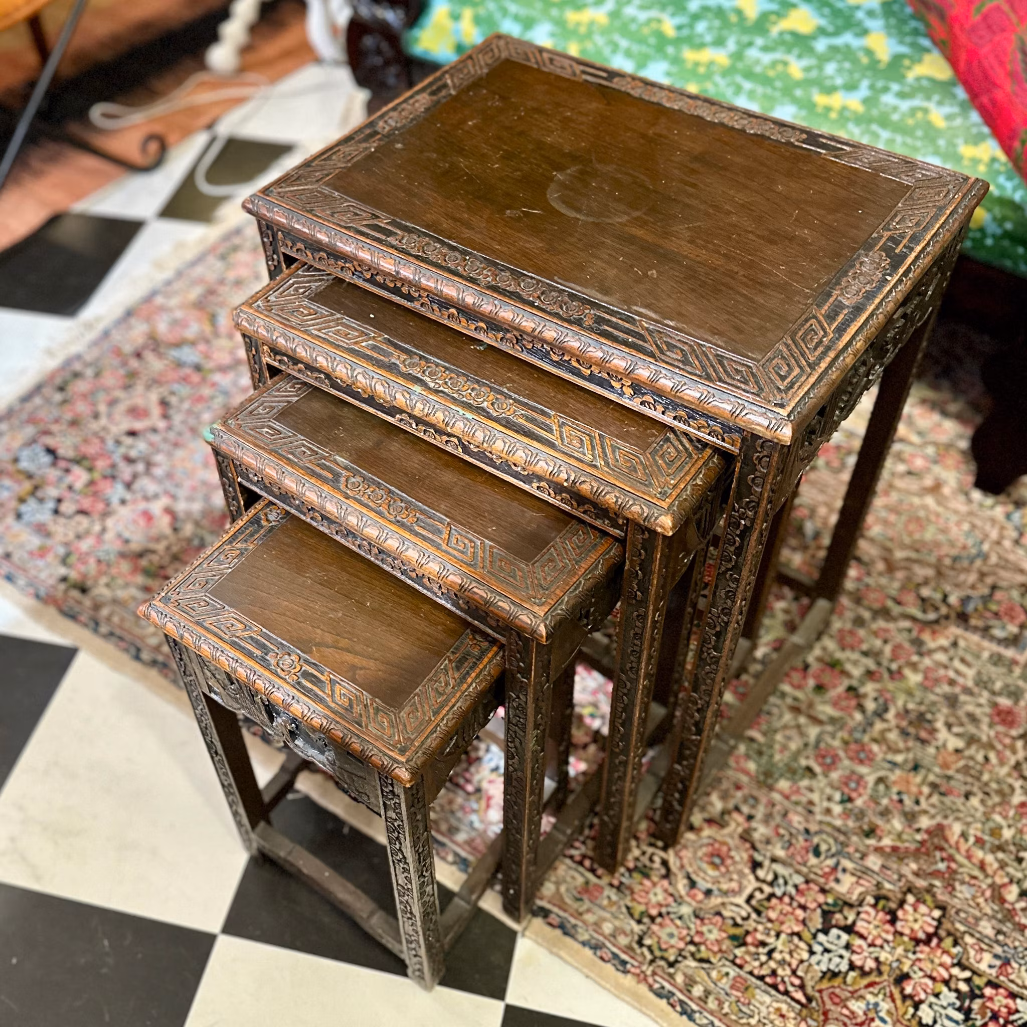 Flera delar av ett satsbord med skuren orientalisk dekor i trä. Största mått: bredd 50 cm, djup 37 cm, höjd 62 cm.