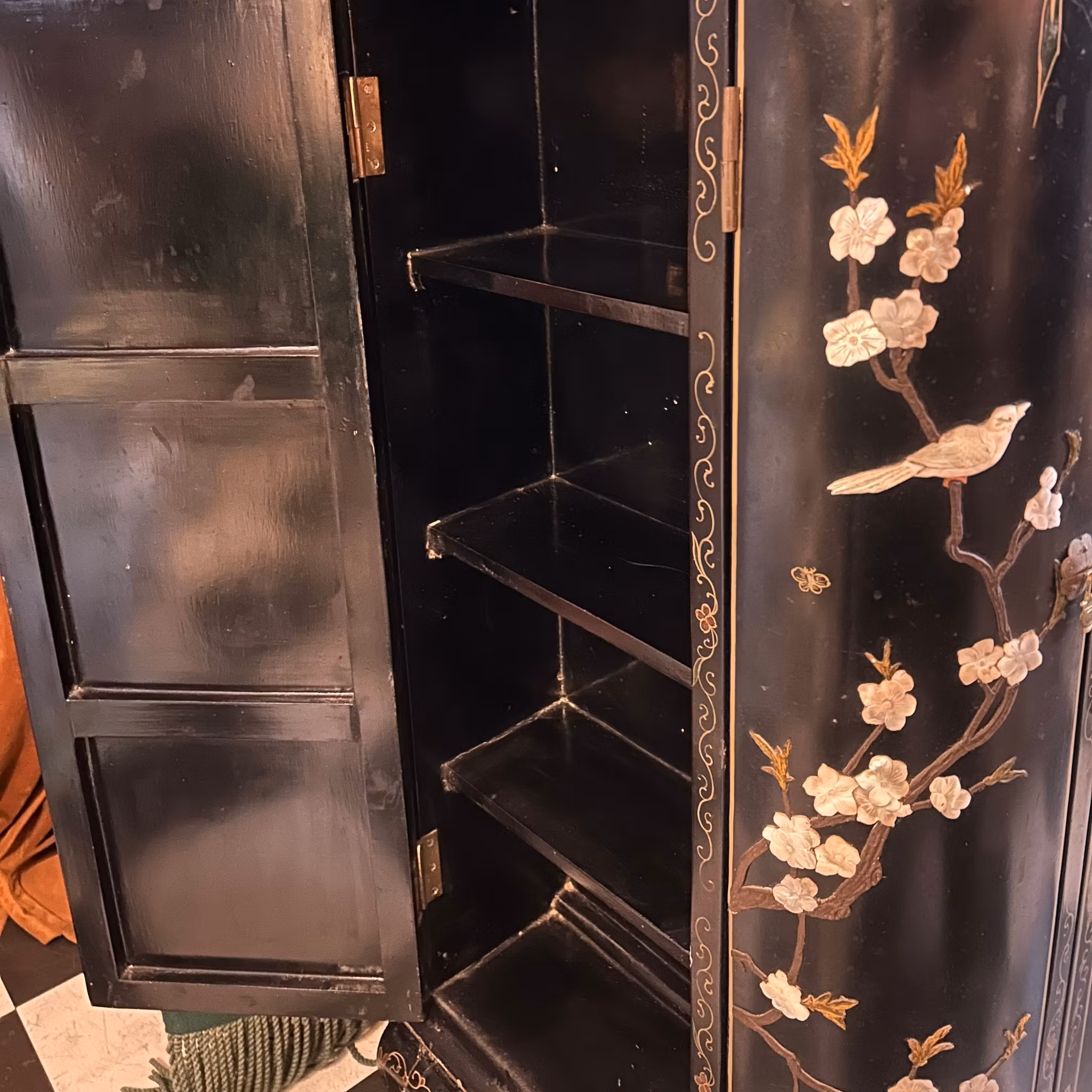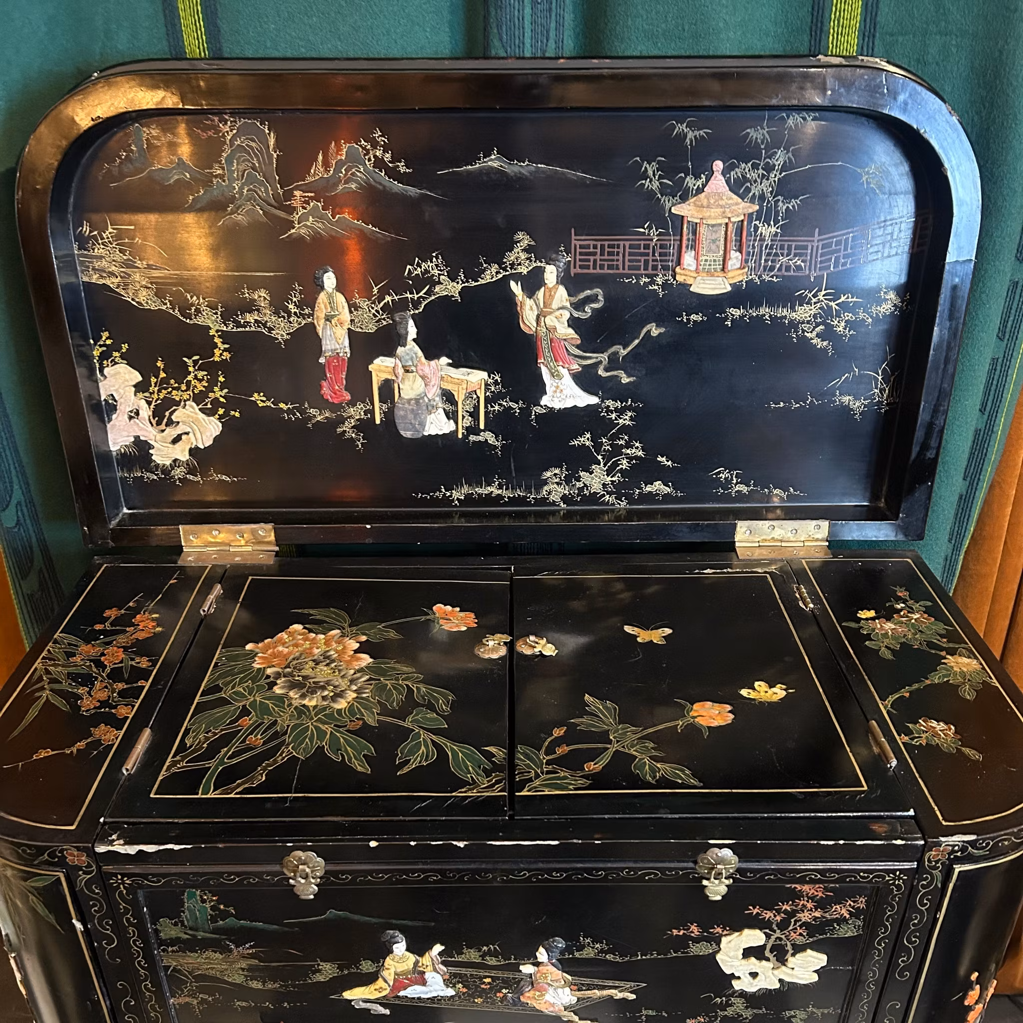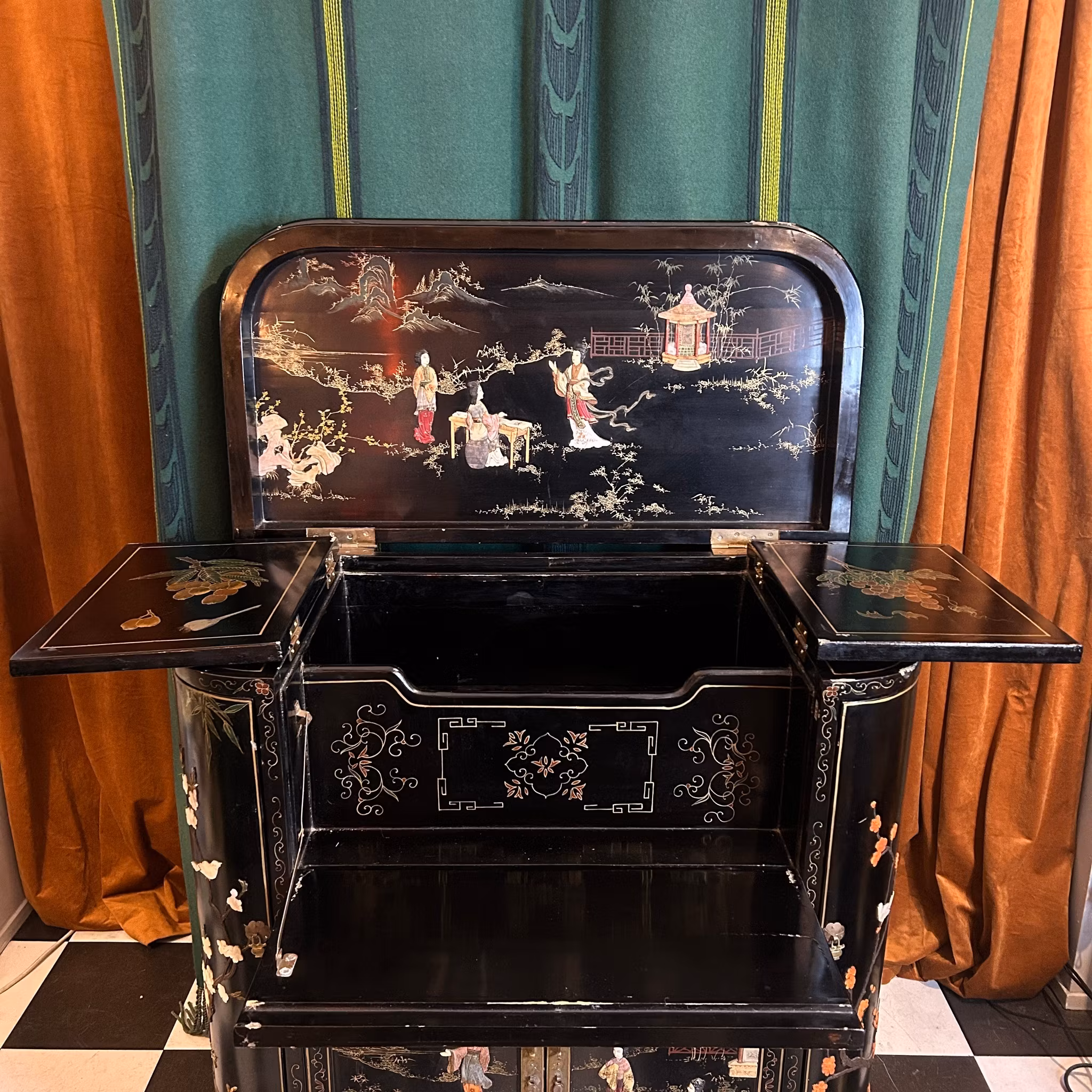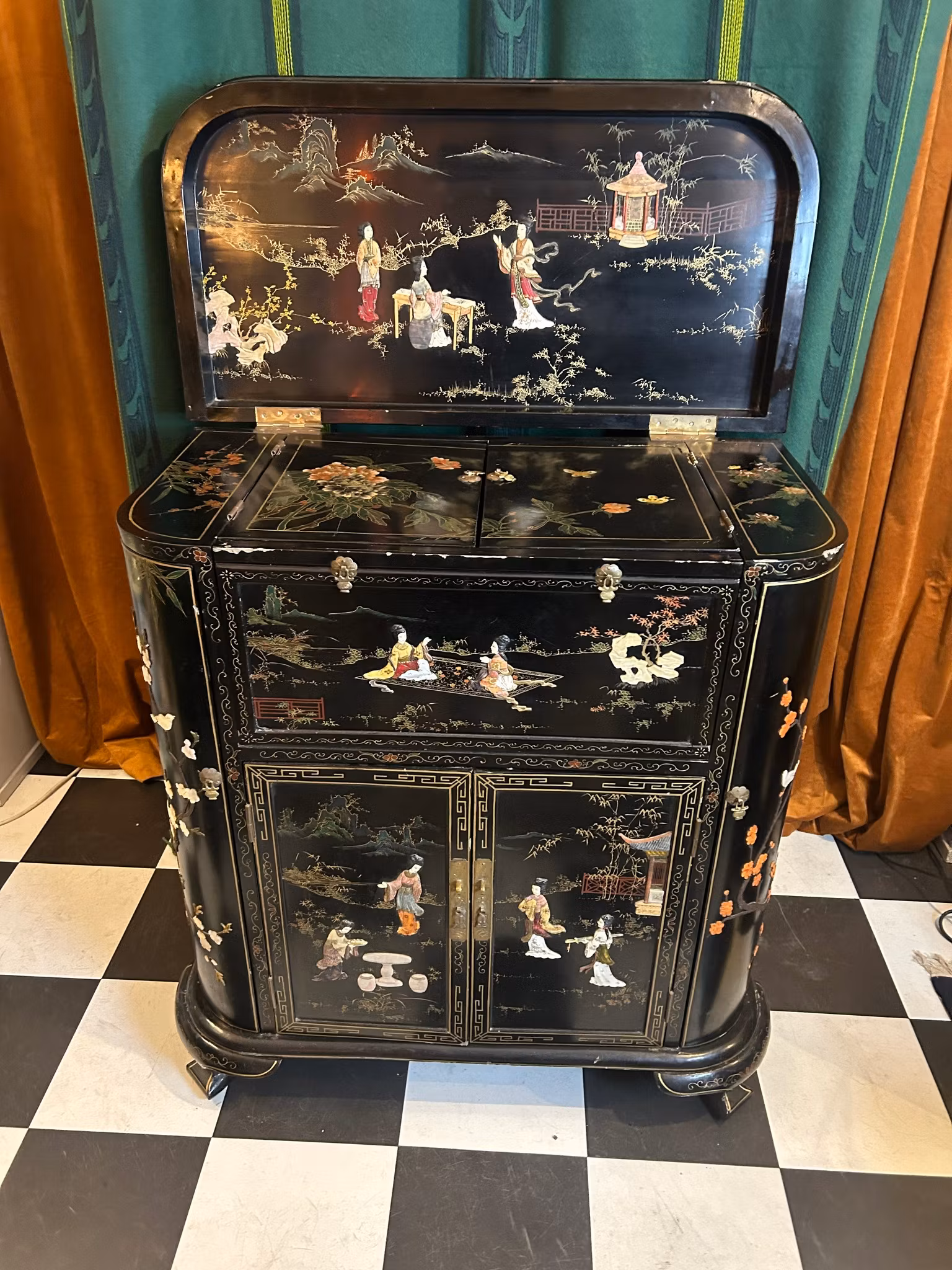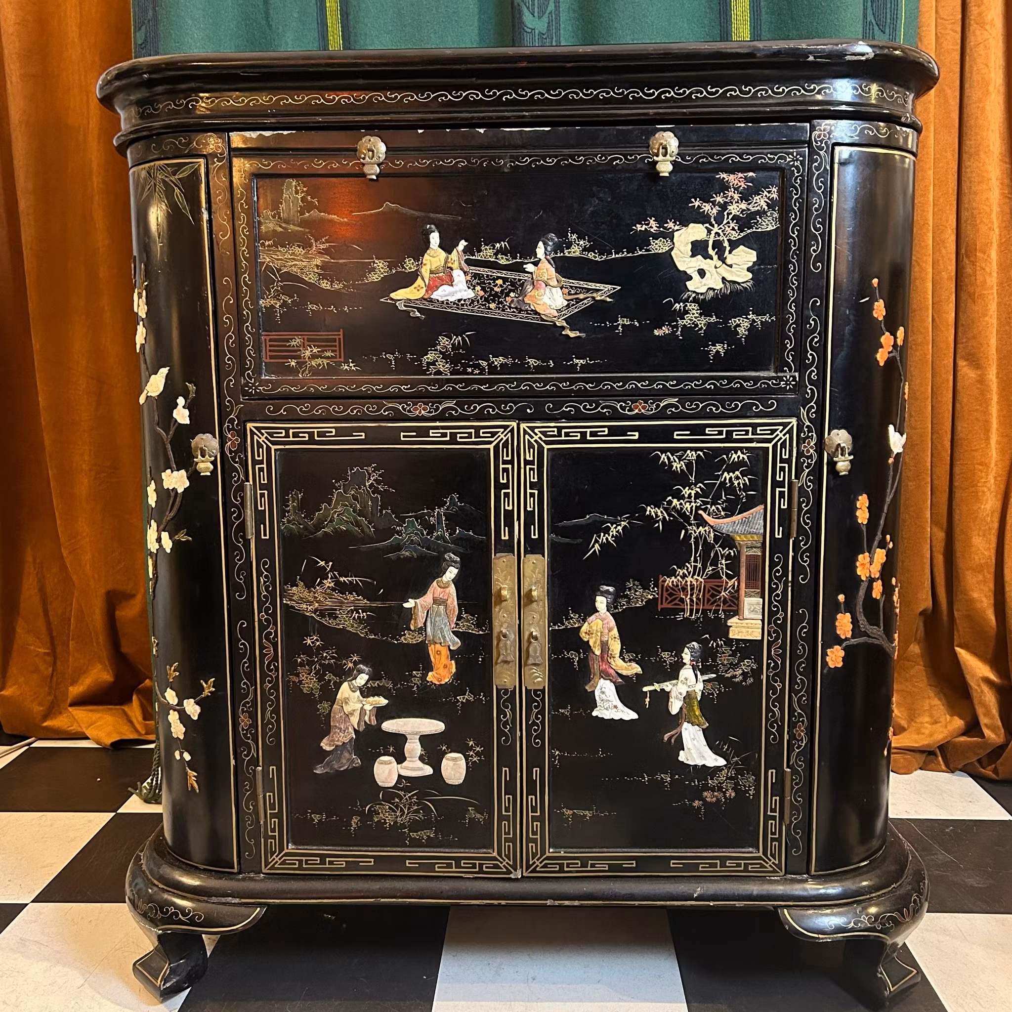 Vackert orientaliskt/kinesiskt barskåp med detaljerad design. Bredd: 97 cm, djup: 54 cm, höjd: 110 cm. Skador, avslag och lagningar.