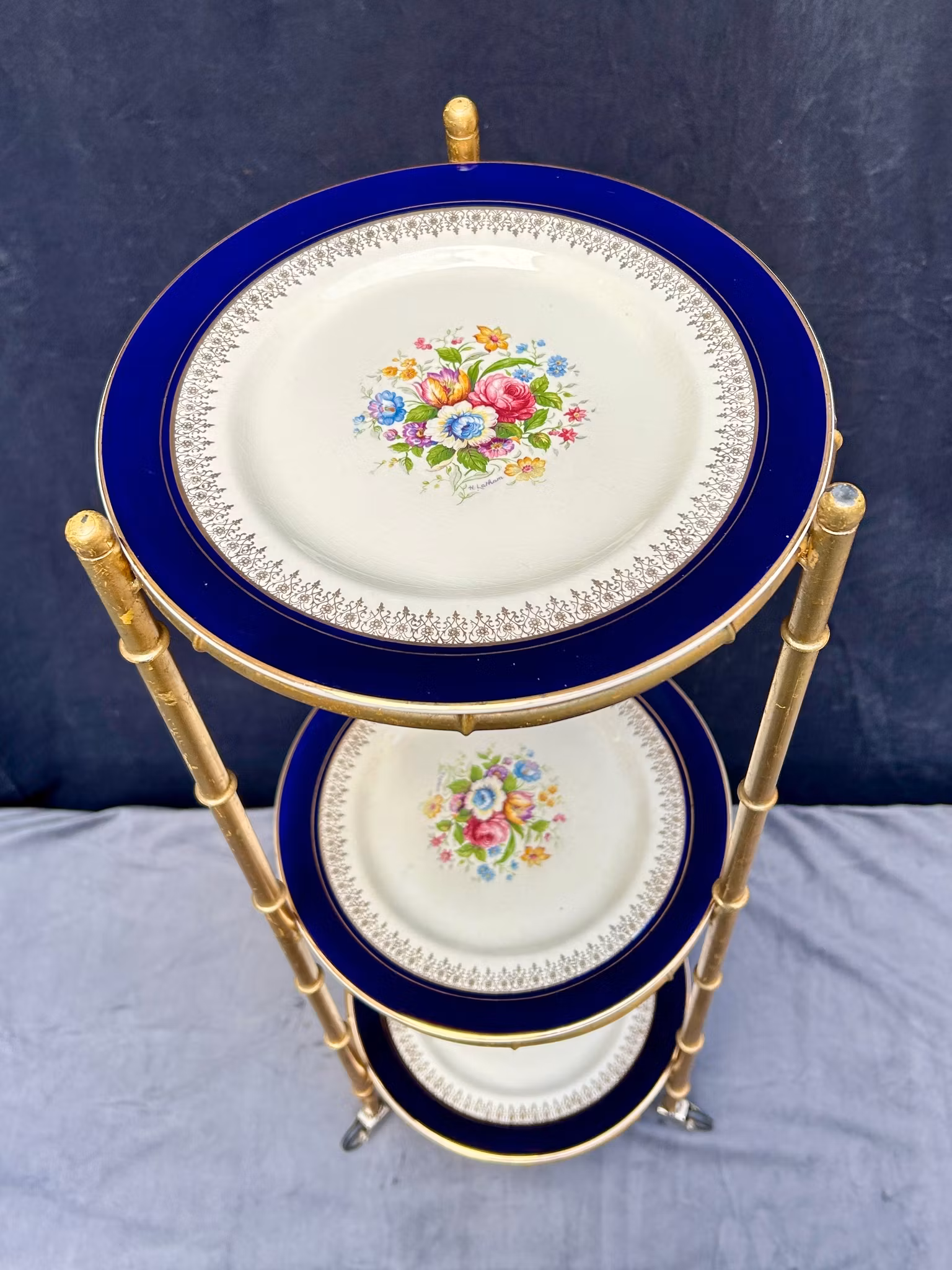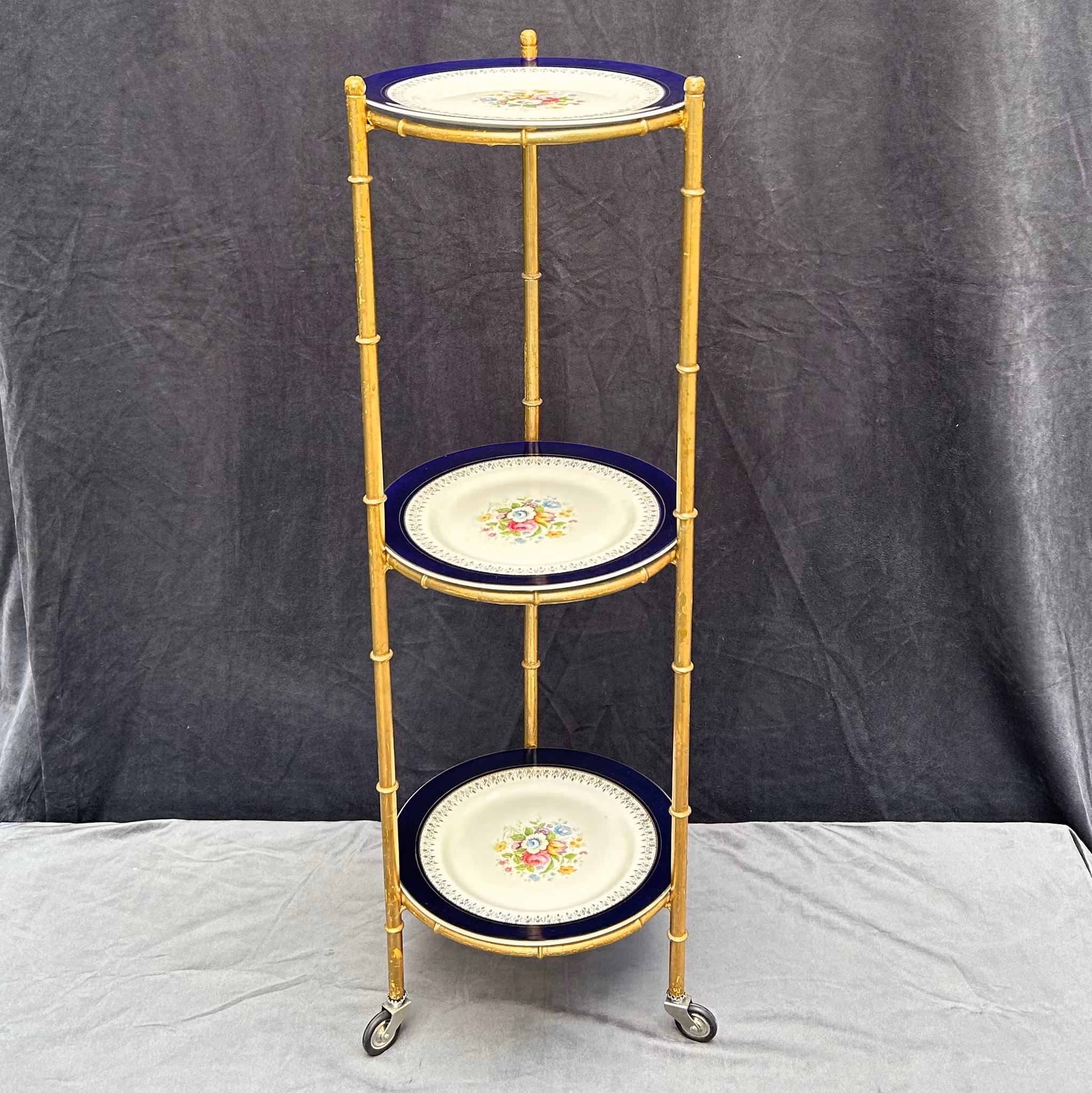 Piedestal/etagere i mässing med hyllplan av Staffordshire porslin. Höjd: 84 cm, diameter: 28 cm. Perfekt för dekoration.