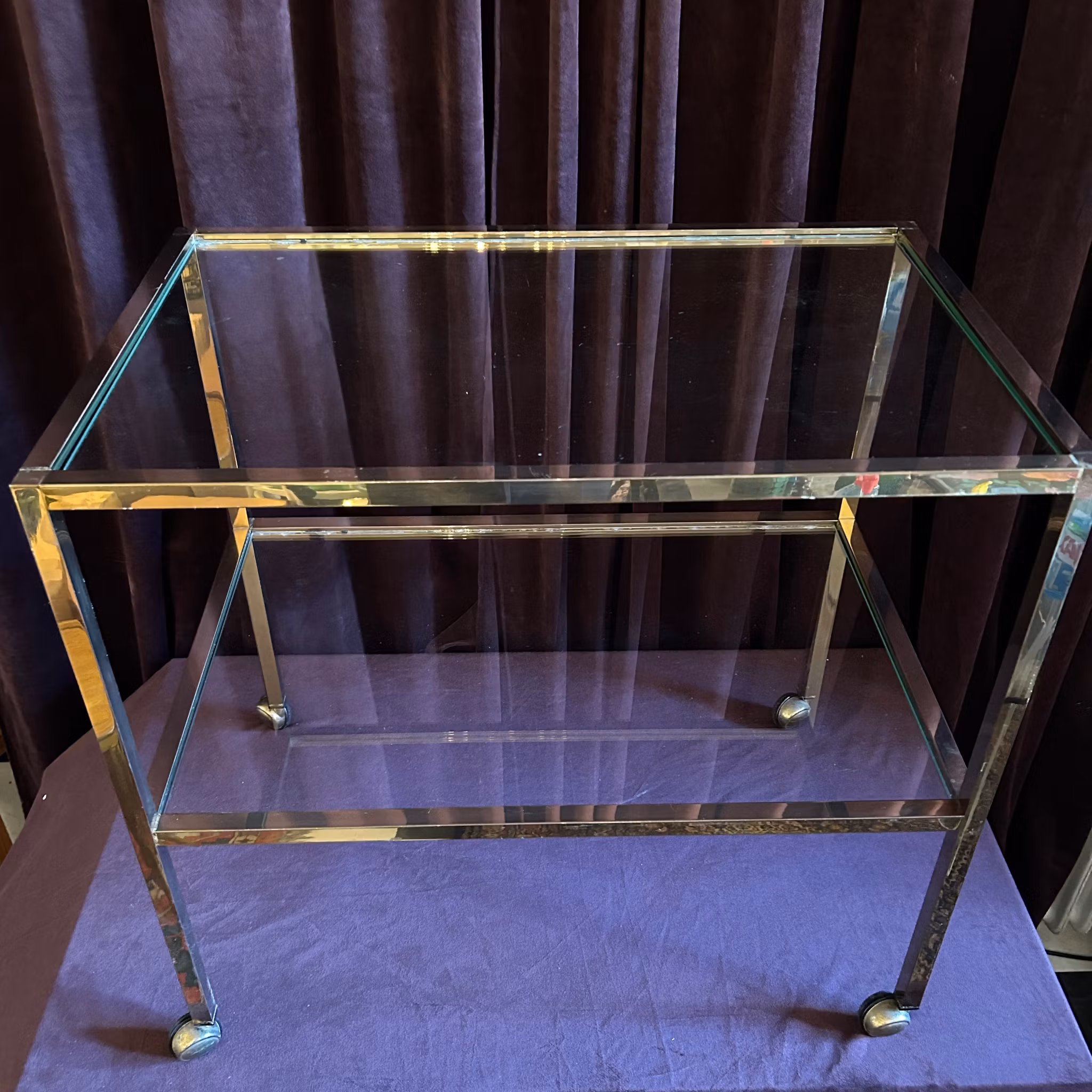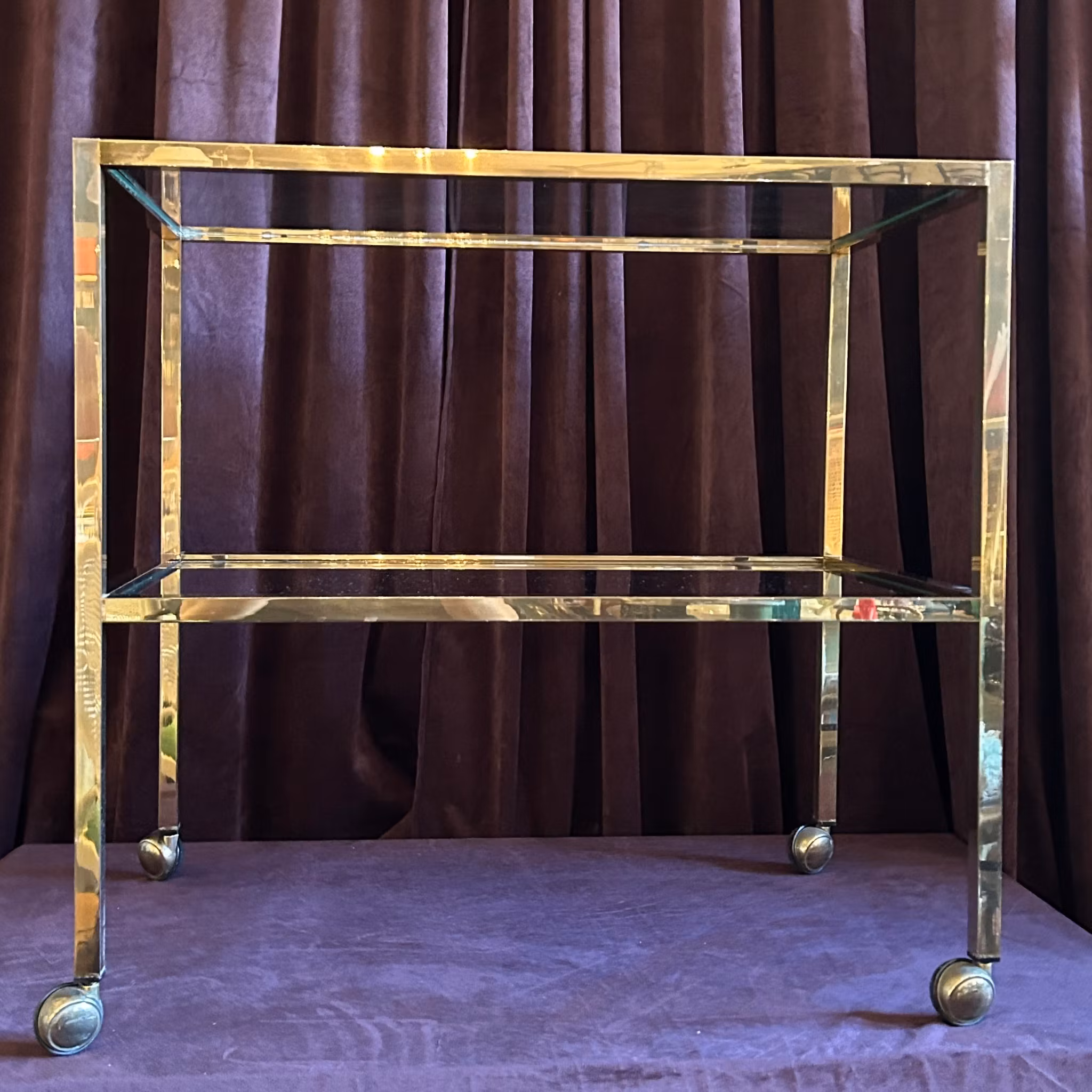 serveringsvagn med två hyllplan i glas och mässingsdetaljer. Längd: 57 cm, djup: 40 cm, höjd: 66 cm.