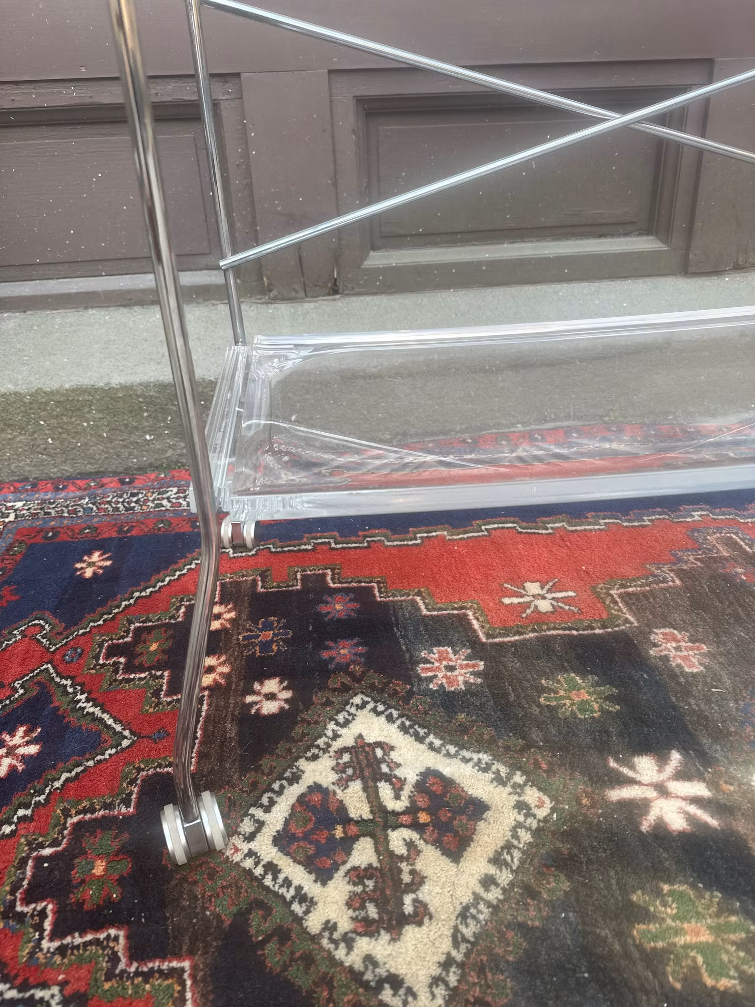 En elegant serveringsvagn i plexiglas och krom. Använt vintageskick.Mått: B:80 cm, Dj:40 cm, H:72 cm